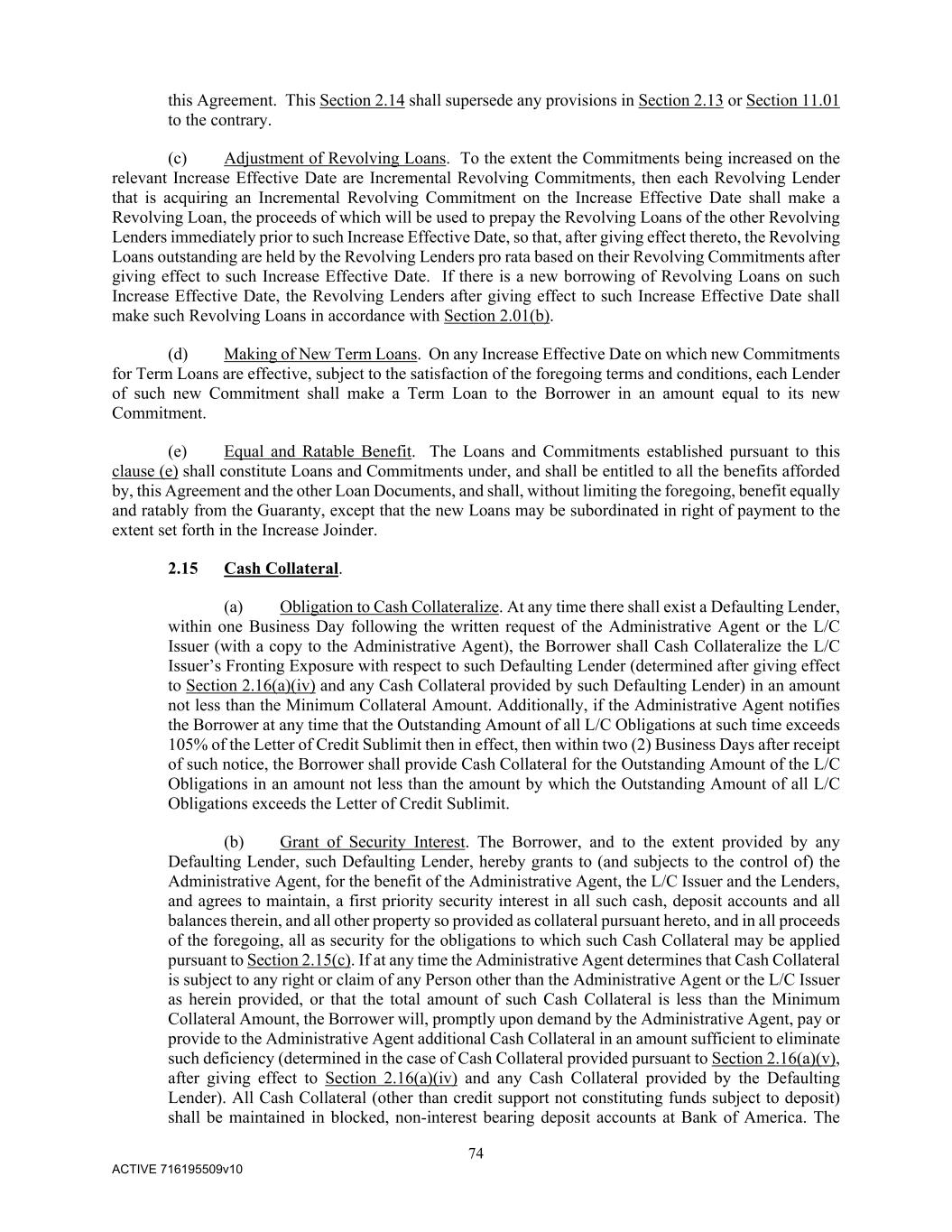74 ACTIVE 716195509v10 this Agreement. This Section 2.14 shall supersede any provisions in Section 2.13 or Section 11.01 to the contrary. (c) Adjustment of Revolving Loans. To the extent the Commitments being increased on the relevant Increase Effective Date are Incremental Revolving Commitments, then each Revolving Lender that is acquiring an Incremental Revolving Commitment on the Increase Effective Date shall make a Revolving Loan, the proceeds of which will be used to prepay the Revolving Loans of the other Revolving Lenders immediately prior to such Increase Effective Date, so that, after giving effect thereto, the Revolving Loans outstanding are held by the Revolving Lenders pro rata based on their Revolving Commitments after giving effect to such Increase Effective Date. If there is a new borrowing of Revolving Loans on such Increase Effective Date, the Revolving Lenders after giving effect to such Increase Effective Date shall make such Revolving Loans in accordance with Section 2.01(b). (d) Making of New Term Loans. On any Increase Effective Date on which new Commitments for Term Loans are effective, subject to the satisfaction of the foregoing terms and conditions, each Lender of such new Commitment shall make a Term Loan to the Borrower in an amount equal to its new Commitment. (e) Equal and Ratable Benefit. The Loans and Commitments established pursuant to this clause (e) shall constitute Loans and Commitments under, and shall be entitled to all the benefits afforded by, this Agreement and the other Loan Documents, and shall, without limiting the foregoing, benefit equally and ratably from the Guaranty, except that the new Loans may be subordinated in right of payment to the extent set forth in the Increase Joinder. 2.15 Cash Collateral. (a) Obligation to Cash Collateralize. At any time there shall exist a Defaulting Lender, within one Business Day following the written request of the Administrative Agent or the L/C Issuer (with a copy to the Administrative Agent), the Borrower shall Cash Collateralize the L/C Issuer’s Fronting Exposure with respect to such Defaulting Lender (determined after giving effect to Section 2.16(a)(iv) and any Cash Collateral provided by such Defaulting Lender) in an amount not less than the Minimum Collateral Amount. Additionally, if the Administrative Agent notifies the Borrower at any time that the Outstanding Amount of all L/C Obligations at such time exceeds 105% of the Letter of Credit Sublimit then in effect, then within two (2) Business Days after receipt of such notice, the Borrower shall provide Cash Collateral for the Outstanding Amount of the L/C Obligations in an amount not less than the amount by which the Outstanding Amount of all L/C Obligations exceeds the Letter of Credit Sublimit. (b) Grant of Security Interest. The Borrower, and to the extent provided by any Defaulting Lender, such Defaulting Lender, hereby grants to (and subjects to the control of) the Administrative Agent, for the benefit of the Administrative Agent, the L/C Issuer and the Lenders, and agrees to maintain, a first priority security interest in all such cash, deposit accounts and all balances therein, and all other property so provided as collateral pursuant hereto, and in all proceeds of the foregoing, all as security for the obligations to which such Cash Collateral may be applied pursuant to Section 2.15(c). If at any time the Administrative Agent determines that Cash Collateral is subject to any right or claim of any Person other than the Administrative Agent or the L/C Issuer as herein provided, or that the total amount of such Cash Collateral is less than the Minimum Collateral Amount, the Borrower will, promptly upon demand by the Administrative Agent, pay or provide to the Administrative Agent additional Cash Collateral in an amount sufficient to eliminate such deficiency (determined in the case of Cash Collateral provided pursuant to Section 2.16(a)(v), after giving effect to Section 2.16(a)(iv) and any Cash Collateral provided by the Defaulting Lender). All Cash Collateral (other than credit support not constituting funds subject to deposit) shall be maintained in blocked, non-interest bearing deposit accounts at Bank of America. The
