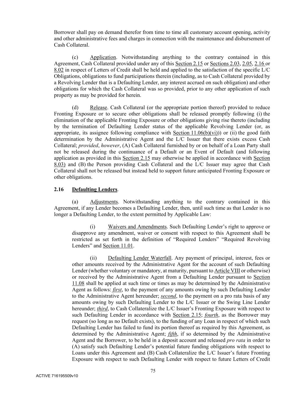 75 ACTIVE 716195509v10 Borrower shall pay on demand therefor from time to time all customary account opening, activity and other administrative fees and charges in connection with the maintenance and disbursement of Cash Collateral. (c) Application. Notwithstanding anything to the contrary contained in this Agreement, Cash Collateral provided under any of this Section 2.15 or Sections 2.03, 2.05, 2.16 or 8.02 in respect of Letters of Credit shall be held and applied to the satisfaction of the specific L/C Obligations, obligations to fund participations therein (including, as to Cash Collateral provided by a Revolving Lender that is a Defaulting Lender, any interest accrued on such obligation) and other obligations for which the Cash Collateral was so provided, prior to any other application of such property as may be provided for herein. (d) Release. Cash Collateral (or the appropriate portion thereof) provided to reduce Fronting Exposure or to secure other obligations shall be released promptly following (i) the elimination of the applicable Fronting Exposure or other obligations giving rise thereto (including by the termination of Defaulting Lender status of the applicable Revolving Lender (or, as appropriate, its assignee following compliance with Section 11.06(b)(vi))) or (ii) the good faith determination by the Administrative Agent and the L/C Issuer that there exists excess Cash Collateral; provided, however, (A) Cash Collateral furnished by or on behalf of a Loan Party shall not be released during the continuance of a Default or an Event of Default (and following application as provided in this Section 2.15 may otherwise be applied in accordance with Section 8.03) and (B) the Person providing Cash Collateral and the L/C Issuer may agree that Cash Collateral shall not be released but instead held to support future anticipated Fronting Exposure or other obligations. 2.16 Defaulting Lenders. (a) Adjustments. Notwithstanding anything to the contrary contained in this Agreement, if any Lender becomes a Defaulting Lender, then, until such time as that Lender is no longer a Defaulting Lender, to the extent permitted by Applicable Law: (i) Waivers and Amendments. Such Defaulting Lender’s right to approve or disapprove any amendment, waiver or consent with respect to this Agreement shall be restricted as set forth in the definition of “Required Lenders” “Required Revolving Lenders” and Section 11.01. (ii) Defaulting Lender Waterfall. Any payment of principal, interest, fees or other amounts received by the Administrative Agent for the account of such Defaulting Lender (whether voluntary or mandatory, at maturity, pursuant to Article VIII or otherwise) or received by the Administrative Agent from a Defaulting Lender pursuant to Section 11.08 shall be applied at such time or times as may be determined by the Administrative Agent as follows: first, to the payment of any amounts owing by such Defaulting Lender to the Administrative Agent hereunder; second, to the payment on a pro rata basis of any amounts owing by such Defaulting Lender to the L/C Issuer or the Swing Line Lender hereunder; third, to Cash Collateralize the L/C Issuer’s Fronting Exposure with respect to such Defaulting Lender in accordance with Section 2.15; fourth, as the Borrower may request (so long as no Default exists), to the funding of any Loan in respect of which such Defaulting Lender has failed to fund its portion thereof as required by this Agreement, as determined by the Administrative Agent; fifth, if so determined by the Administrative Agent and the Borrower, to be held in a deposit account and released pro rata in order to (A) satisfy such Defaulting Lender’s potential future funding obligations with respect to Loans under this Agreement and (B) Cash Collateralize the L/C Issuer’s future Fronting Exposure with respect to such Defaulting Lender with respect to future Letters of Credit
