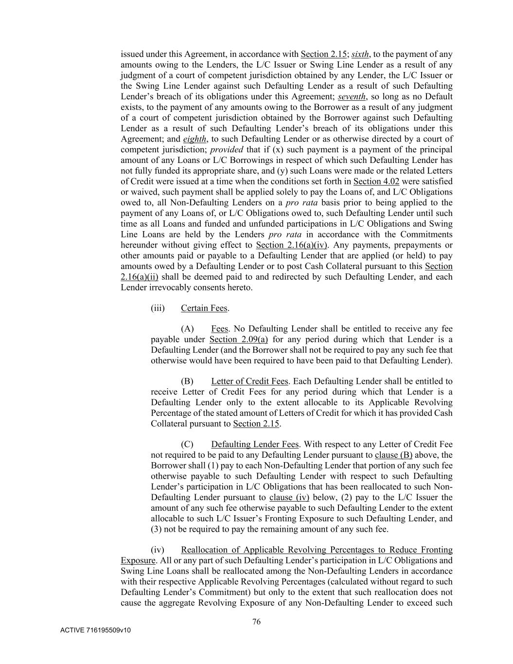76 ACTIVE 716195509v10 issued under this Agreement, in accordance with Section 2.15; sixth, to the payment of any amounts owing to the Lenders, the L/C Issuer or Swing Line Lender as a result of any judgment of a court of competent jurisdiction obtained by any Lender, the L/C Issuer or the Swing Line Lender against such Defaulting Lender as a result of such Defaulting Lender’s breach of its obligations under this Agreement; seventh, so long as no Default exists, to the payment of any amounts owing to the Borrower as a result of any judgment of a court of competent jurisdiction obtained by the Borrower against such Defaulting Lender as a result of such Defaulting Lender’s breach of its obligations under this Agreement; and eighth, to such Defaulting Lender or as otherwise directed by a court of competent jurisdiction; provided that if (x) such payment is a payment of the principal amount of any Loans or L/C Borrowings in respect of which such Defaulting Lender has not fully funded its appropriate share, and (y) such Loans were made or the related Letters of Credit were issued at a time when the conditions set forth in Section 4.02 were satisfied or waived, such payment shall be applied solely to pay the Loans of, and L/C Obligations owed to, all Non-Defaulting Lenders on a pro rata basis prior to being applied to the payment of any Loans of, or L/C Obligations owed to, such Defaulting Lender until such time as all Loans and funded and unfunded participations in L/C Obligations and Swing Line Loans are held by the Lenders pro rata in accordance with the Commitments hereunder without giving effect to Section 2.16(a)(iv). Any payments, prepayments or other amounts paid or payable to a Defaulting Lender that are applied (or held) to pay amounts owed by a Defaulting Lender or to post Cash Collateral pursuant to this Section 2.16(a)(ii) shall be deemed paid to and redirected by such Defaulting Lender, and each Lender irrevocably consents hereto. (iii) Certain Fees. (A) Fees. No Defaulting Lender shall be entitled to receive any fee payable under Section 2.09(a) for any period during which that Lender is a Defaulting Lender (and the Borrower shall not be required to pay any such fee that otherwise would have been required to have been paid to that Defaulting Lender). (B) Letter of Credit Fees. Each Defaulting Lender shall be entitled to receive Letter of Credit Fees for any period during which that Lender is a Defaulting Lender only to the extent allocable to its Applicable Revolving Percentage of the stated amount of Letters of Credit for which it has provided Cash Collateral pursuant to Section 2.15. (C) Defaulting Lender Fees. With respect to any Letter of Credit Fee not required to be paid to any Defaulting Lender pursuant to clause (B) above, the Borrower shall (1) pay to each Non-Defaulting Lender that portion of any such fee otherwise payable to such Defaulting Lender with respect to such Defaulting Lender’s participation in L/C Obligations that has been reallocated to such Non- Defaulting Lender pursuant to clause (iv) below, (2) pay to the L/C Issuer the amount of any such fee otherwise payable to such Defaulting Lender to the extent allocable to such L/C Issuer’s Fronting Exposure to such Defaulting Lender, and (3) not be required to pay the remaining amount of any such fee. (iv) Reallocation of Applicable Revolving Percentages to Reduce Fronting Exposure. All or any part of such Defaulting Lender’s participation in L/C Obligations and Swing Line Loans shall be reallocated among the Non-Defaulting Lenders in accordance with their respective Applicable Revolving Percentages (calculated without regard to such Defaulting Lender’s Commitment) but only to the extent that such reallocation does not cause the aggregate Revolving Exposure of any Non-Defaulting Lender to exceed such