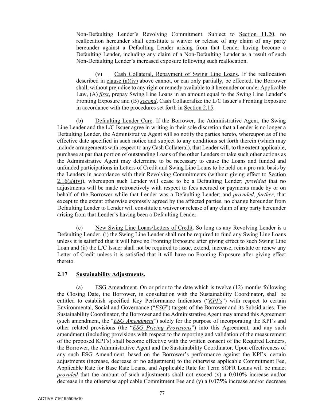 77 ACTIVE 716195509v10 Non-Defaulting Lender’s Revolving Commitment. Subject to Section 11.20, no reallocation hereunder shall constitute a waiver or release of any claim of any party hereunder against a Defaulting Lender arising from that Lender having become a Defaulting Lender, including any claim of a Non-Defaulting Lender as a result of such Non-Defaulting Lender’s increased exposure following such reallocation. (v) Cash Collateral, Repayment of Swing Line Loans. If the reallocation described in clause (a)(iv) above cannot, or can only partially, be effected, the Borrower shall, without prejudice to any right or remedy available to it hereunder or under Applicable Law, (A) first, prepay Swing Line Loans in an amount equal to the Swing Line Lender’s Fronting Exposure and (B) second, Cash Collateralize the L/C Issuer’s Fronting Exposure in accordance with the procedures set forth in Section 2.15. (b) Defaulting Lender Cure. If the Borrower, the Administrative Agent, the Swing Line Lender and the L/C Issuer agree in writing in their sole discretion that a Lender is no longer a Defaulting Lender, the Administrative Agent will so notify the parties hereto, whereupon as of the effective date specified in such notice and subject to any conditions set forth therein (which may include arrangements with respect to any Cash Collateral), that Lender will, to the extent applicable, purchase at par that portion of outstanding Loans of the other Lenders or take such other actions as the Administrative Agent may determine to be necessary to cause the Loans and funded and unfunded participations in Letters of Credit and Swing Line Loans to be held on a pro rata basis by the Lenders in accordance with their Revolving Commitments (without giving effect to Section 2.16(a)(iv)), whereupon such Lender will cease to be a Defaulting Lender; provided that no adjustments will be made retroactively with respect to fees accrued or payments made by or on behalf of the Borrower while that Lender was a Defaulting Lender; and provided, further, that except to the extent otherwise expressly agreed by the affected parties, no change hereunder from Defaulting Lender to Lender will constitute a waiver or release of any claim of any party hereunder arising from that Lender’s having been a Defaulting Lender. (c) New Swing Line Loans/Letters of Credit. So long as any Revolving Lender is a Defaulting Lender, (i) the Swing Line Lender shall not be required to fund any Swing Line Loans unless it is satisfied that it will have no Fronting Exposure after giving effect to such Swing Line Loan and (ii) the L/C Issuer shall not be required to issue, extend, increase, reinstate or renew any Letter of Credit unless it is satisfied that it will have no Fronting Exposure after giving effect thereto. 2.17 Sustainability Adjustments. (a) ESG Amendment. On or prior to the date which is twelve (12) months following the Closing Date, the Borrower, in consultation with the Sustainability Coordinator, shall be entitled to establish specified Key Performance Indicators (“KPI’s”) with respect to certain Environmental, Social and Governance (“ESG”) targets of the Borrower and its Subsidiaries. The Sustainability Coordinator, the Borrower and the Administrative Agent may amend this Agreement (such amendment, the “ESG Amendment”) solely for the purpose of incorporating the KPI’s and other related provisions (the “ESG Pricing Provisions”) into this Agreement, and any such amendment (including provisions with respect to the reporting and validation of the measurement of the proposed KPI’s) shall become effective with the written consent of the Required Lenders, the Borrower, the Administrative Agent and the Sustainability Coordinator. Upon effectiveness of any such ESG Amendment, based on the Borrower’s performance against the KPI’s, certain adjustments (increase, decrease or no adjustment) to the otherwise applicable Commitment Fee, Applicable Rate for Base Rate Loans, and Applicable Rate for Term SOFR Loans will be made; provided that the amount of such adjustments shall not exceed (x) a 0.010% increase and/or decrease in the otherwise applicable Commitment Fee and (y) a 0.075% increase and/or decrease