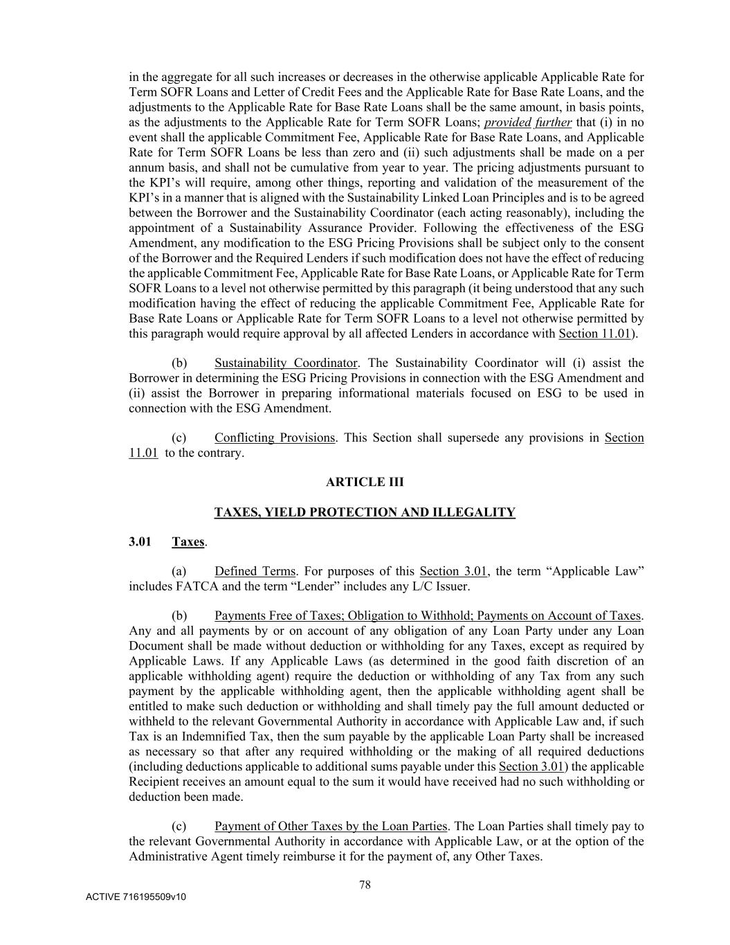 78 ACTIVE 716195509v10 in the aggregate for all such increases or decreases in the otherwise applicable Applicable Rate for Term SOFR Loans and Letter of Credit Fees and the Applicable Rate for Base Rate Loans, and the adjustments to the Applicable Rate for Base Rate Loans shall be the same amount, in basis points, as the adjustments to the Applicable Rate for Term SOFR Loans; provided further that (i) in no event shall the applicable Commitment Fee, Applicable Rate for Base Rate Loans, and Applicable Rate for Term SOFR Loans be less than zero and (ii) such adjustments shall be made on a per annum basis, and shall not be cumulative from year to year. The pricing adjustments pursuant to the KPI’s will require, among other things, reporting and validation of the measurement of the KPI’s in a manner that is aligned with the Sustainability Linked Loan Principles and is to be agreed between the Borrower and the Sustainability Coordinator (each acting reasonably), including the appointment of a Sustainability Assurance Provider. Following the effectiveness of the ESG Amendment, any modification to the ESG Pricing Provisions shall be subject only to the consent of the Borrower and the Required Lenders if such modification does not have the effect of reducing the applicable Commitment Fee, Applicable Rate for Base Rate Loans, or Applicable Rate for Term SOFR Loans to a level not otherwise permitted by this paragraph (it being understood that any such modification having the effect of reducing the applicable Commitment Fee, Applicable Rate for Base Rate Loans or Applicable Rate for Term SOFR Loans to a level not otherwise permitted by this paragraph would require approval by all affected Lenders in accordance with Section 11.01). (b) Sustainability Coordinator. The Sustainability Coordinator will (i) assist the Borrower in determining the ESG Pricing Provisions in connection with the ESG Amendment and (ii) assist the Borrower in preparing informational materials focused on ESG to be used in connection with the ESG Amendment. (c) Conflicting Provisions. This Section shall supersede any provisions in Section 11.01 to the contrary. ARTICLE III TAXES, YIELD PROTECTION AND ILLEGALITY 3.01 Taxes. (a) Defined Terms. For purposes of this Section 3.01, the term “Applicable Law” includes FATCA and the term “Lender” includes any L/C Issuer. (b) Payments Free of Taxes; Obligation to Withhold; Payments on Account of Taxes. Any and all payments by or on account of any obligation of any Loan Party under any Loan Document shall be made without deduction or withholding for any Taxes, except as required by Applicable Laws. If any Applicable Laws (as determined in the good faith discretion of an applicable withholding agent) require the deduction or withholding of any Tax from any such payment by the applicable withholding agent, then the applicable withholding agent shall be entitled to make such deduction or withholding and shall timely pay the full amount deducted or withheld to the relevant Governmental Authority in accordance with Applicable Law and, if such Tax is an Indemnified Tax, then the sum payable by the applicable Loan Party shall be increased as necessary so that after any required withholding or the making of all required deductions (including deductions applicable to additional sums payable under this Section 3.01) the applicable Recipient receives an amount equal to the sum it would have received had no such withholding or deduction been made. (c) Payment of Other Taxes by the Loan Parties. The Loan Parties shall timely pay to the relevant Governmental Authority in accordance with Applicable Law, or at the option of the Administrative Agent timely reimburse it for the payment of, any Other Taxes.