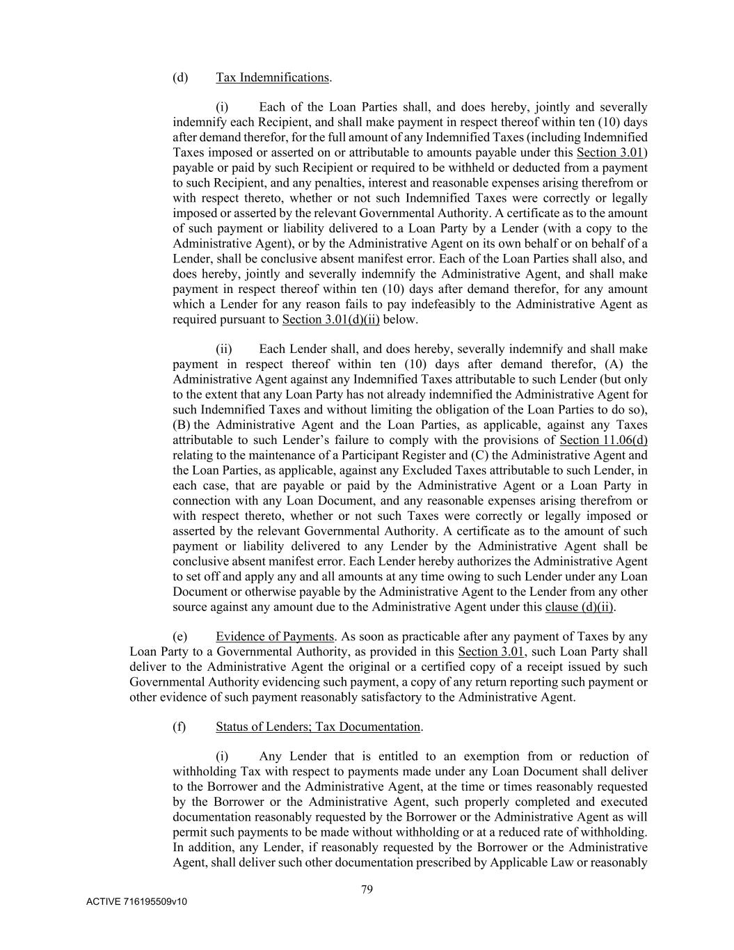 79 ACTIVE 716195509v10 (d) Tax Indemnifications. (i) Each of the Loan Parties shall, and does hereby, jointly and severally indemnify each Recipient, and shall make payment in respect thereof within ten (10) days after demand therefor, for the full amount of any Indemnified Taxes (including Indemnified Taxes imposed or asserted on or attributable to amounts payable under this Section 3.01) payable or paid by such Recipient or required to be withheld or deducted from a payment to such Recipient, and any penalties, interest and reasonable expenses arising therefrom or with respect thereto, whether or not such Indemnified Taxes were correctly or legally imposed or asserted by the relevant Governmental Authority. A certificate as to the amount of such payment or liability delivered to a Loan Party by a Lender (with a copy to the Administrative Agent), or by the Administrative Agent on its own behalf or on behalf of a Lender, shall be conclusive absent manifest error. Each of the Loan Parties shall also, and does hereby, jointly and severally indemnify the Administrative Agent, and shall make payment in respect thereof within ten (10) days after demand therefor, for any amount which a Lender for any reason fails to pay indefeasibly to the Administrative Agent as required pursuant to Section 3.01(d)(ii) below. (ii) Each Lender shall, and does hereby, severally indemnify and shall make payment in respect thereof within ten (10) days after demand therefor, (A) the Administrative Agent against any Indemnified Taxes attributable to such Lender (but only to the extent that any Loan Party has not already indemnified the Administrative Agent for such Indemnified Taxes and without limiting the obligation of the Loan Parties to do so), (B) the Administrative Agent and the Loan Parties, as applicable, against any Taxes attributable to such Lender’s failure to comply with the provisions of Section 11.06(d) relating to the maintenance of a Participant Register and (C) the Administrative Agent and the Loan Parties, as applicable, against any Excluded Taxes attributable to such Lender, in each case, that are payable or paid by the Administrative Agent or a Loan Party in connection with any Loan Document, and any reasonable expenses arising therefrom or with respect thereto, whether or not such Taxes were correctly or legally imposed or asserted by the relevant Governmental Authority. A certificate as to the amount of such payment or liability delivered to any Lender by the Administrative Agent shall be conclusive absent manifest error. Each Lender hereby authorizes the Administrative Agent to set off and apply any and all amounts at any time owing to such Lender under any Loan Document or otherwise payable by the Administrative Agent to the Lender from any other source against any amount due to the Administrative Agent under this clause (d)(ii). (e) Evidence of Payments. As soon as practicable after any payment of Taxes by any Loan Party to a Governmental Authority, as provided in this Section 3.01, such Loan Party shall deliver to the Administrative Agent the original or a certified copy of a receipt issued by such Governmental Authority evidencing such payment, a copy of any return reporting such payment or other evidence of such payment reasonably satisfactory to the Administrative Agent. (f) Status of Lenders; Tax Documentation. (i) Any Lender that is entitled to an exemption from or reduction of withholding Tax with respect to payments made under any Loan Document shall deliver to the Borrower and the Administrative Agent, at the time or times reasonably requested by the Borrower or the Administrative Agent, such properly completed and executed documentation reasonably requested by the Borrower or the Administrative Agent as will permit such payments to be made without withholding or at a reduced rate of withholding. In addition, any Lender, if reasonably requested by the Borrower or the Administrative Agent, shall deliver such other documentation prescribed by Applicable Law or reasonably