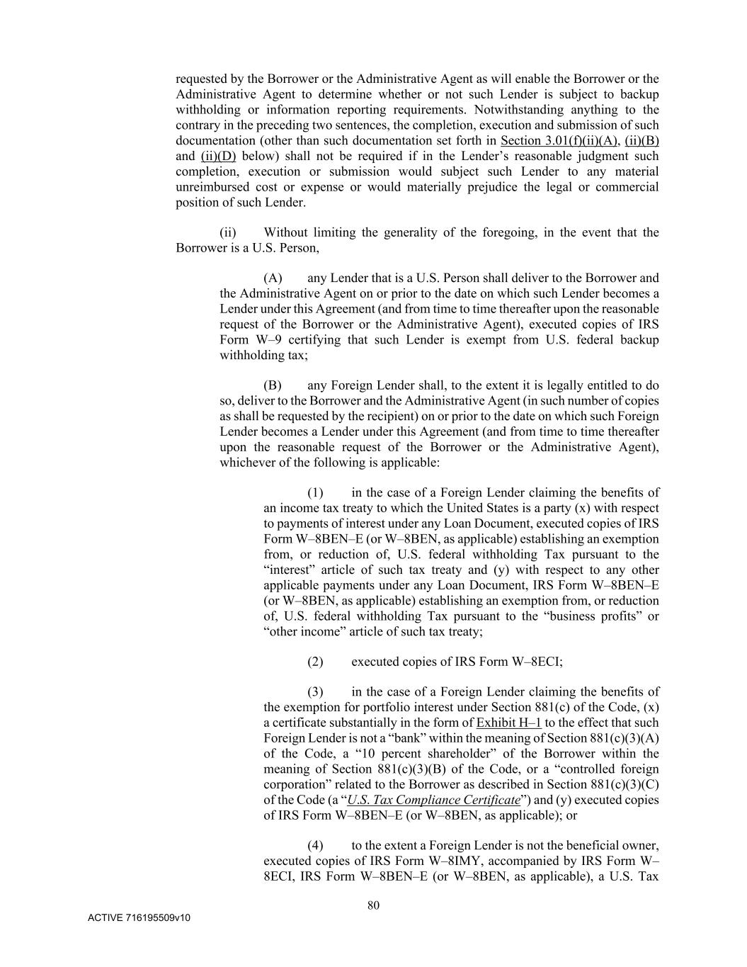 80 ACTIVE 716195509v10 requested by the Borrower or the Administrative Agent as will enable the Borrower or the Administrative Agent to determine whether or not such Lender is subject to backup withholding or information reporting requirements. Notwithstanding anything to the contrary in the preceding two sentences, the completion, execution and submission of such documentation (other than such documentation set forth in Section 3.01(f)(ii)(A), (ii)(B) and (ii)(D) below) shall not be required if in the Lender’s reasonable judgment such completion, execution or submission would subject such Lender to any material unreimbursed cost or expense or would materially prejudice the legal or commercial position of such Lender. (ii) Without limiting the generality of the foregoing, in the event that the Borrower is a U.S. Person, (A) any Lender that is a U.S. Person shall deliver to the Borrower and the Administrative Agent on or prior to the date on which such Lender becomes a Lender under this Agreement (and from time to time thereafter upon the reasonable request of the Borrower or the Administrative Agent), executed copies of IRS Form W–9 certifying that such Lender is exempt from U.S. federal backup withholding tax; (B) any Foreign Lender shall, to the extent it is legally entitled to do so, deliver to the Borrower and the Administrative Agent (in such number of copies as shall be requested by the recipient) on or prior to the date on which such Foreign Lender becomes a Lender under this Agreement (and from time to time thereafter upon the reasonable request of the Borrower or the Administrative Agent), whichever of the following is applicable: (1) in the case of a Foreign Lender claiming the benefits of an income tax treaty to which the United States is a party (x) with respect to payments of interest under any Loan Document, executed copies of IRS Form W–8BEN–E (or W–8BEN, as applicable) establishing an exemption from, or reduction of, U.S. federal withholding Tax pursuant to the “interest” article of such tax treaty and (y) with respect to any other applicable payments under any Loan Document, IRS Form W–8BEN–E (or W–8BEN, as applicable) establishing an exemption from, or reduction of, U.S. federal withholding Tax pursuant to the “business profits” or “other income” article of such tax treaty; (2) executed copies of IRS Form W–8ECI; (3) in the case of a Foreign Lender claiming the benefits of the exemption for portfolio interest under Section 881(c) of the Code, (x) a certificate substantially in the form of Exhibit H–1 to the effect that such Foreign Lender is not a “bank” within the meaning of Section 881(c)(3)(A) of the Code, a “10 percent shareholder” of the Borrower within the meaning of Section 881(c)(3)(B) of the Code, or a “controlled foreign corporation” related to the Borrower as described in Section 881(c)(3)(C) of the Code (a “U.S. Tax Compliance Certificate”) and (y) executed copies of IRS Form W–8BEN–E (or W–8BEN, as applicable); or (4) to the extent a Foreign Lender is not the beneficial owner, executed copies of IRS Form W–8IMY, accompanied by IRS Form W– 8ECI, IRS Form W–8BEN–E (or W–8BEN, as applicable), a U.S. Tax
