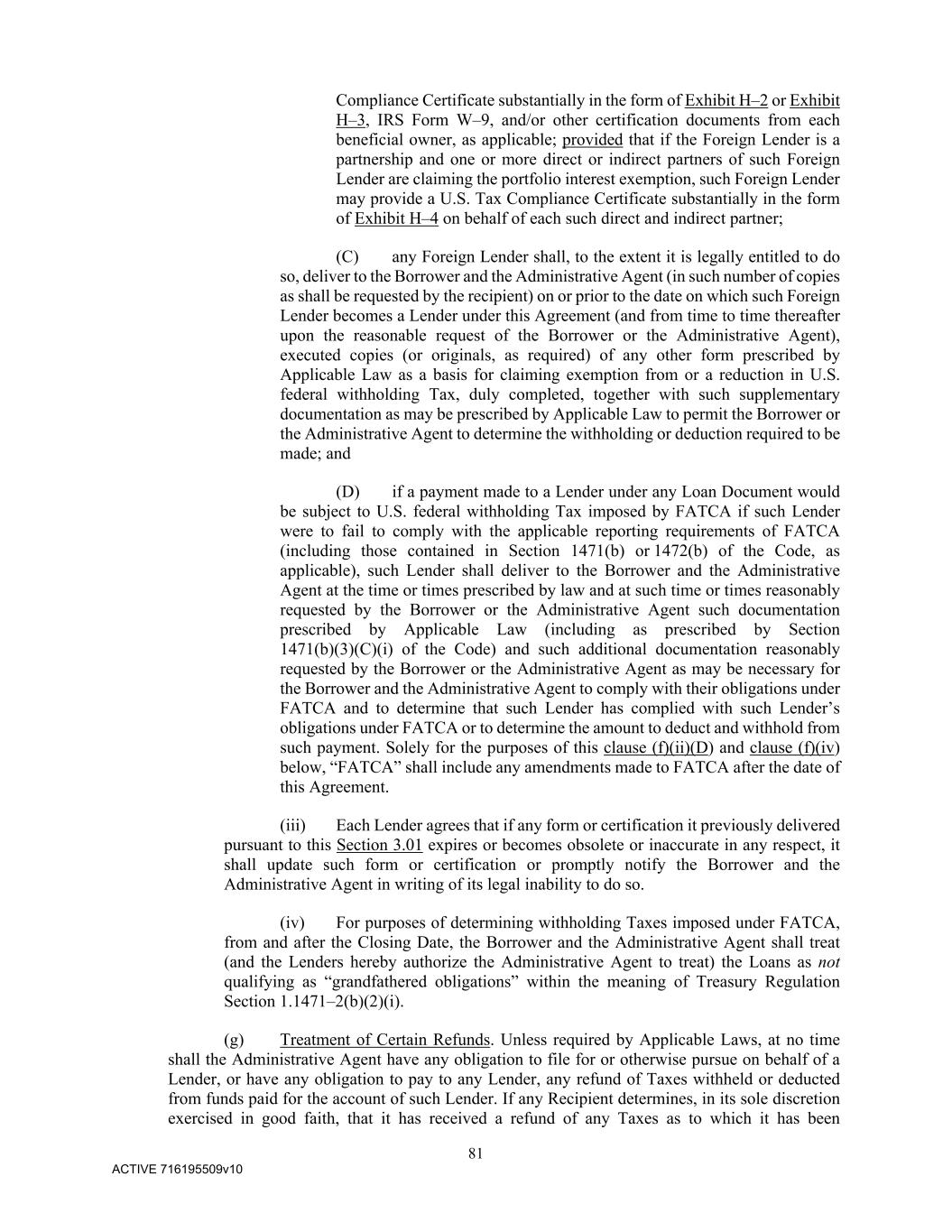 81 ACTIVE 716195509v10 Compliance Certificate substantially in the form of Exhibit H–2 or Exhibit H–3, IRS Form W–9, and/or other certification documents from each beneficial owner, as applicable; provided that if the Foreign Lender is a partnership and one or more direct or indirect partners of such Foreign Lender are claiming the portfolio interest exemption, such Foreign Lender may provide a U.S. Tax Compliance Certificate substantially in the form of Exhibit H–4 on behalf of each such direct and indirect partner; (C) any Foreign Lender shall, to the extent it is legally entitled to do so, deliver to the Borrower and the Administrative Agent (in such number of copies as shall be requested by the recipient) on or prior to the date on which such Foreign Lender becomes a Lender under this Agreement (and from time to time thereafter upon the reasonable request of the Borrower or the Administrative Agent), executed copies (or originals, as required) of any other form prescribed by Applicable Law as a basis for claiming exemption from or a reduction in U.S. federal withholding Tax, duly completed, together with such supplementary documentation as may be prescribed by Applicable Law to permit the Borrower or the Administrative Agent to determine the withholding or deduction required to be made; and (D) if a payment made to a Lender under any Loan Document would be subject to U.S. federal withholding Tax imposed by FATCA if such Lender were to fail to comply with the applicable reporting requirements of FATCA (including those contained in Section 1471(b) or 1472(b) of the Code, as applicable), such Lender shall deliver to the Borrower and the Administrative Agent at the time or times prescribed by law and at such time or times reasonably requested by the Borrower or the Administrative Agent such documentation prescribed by Applicable Law (including as prescribed by Section 1471(b)(3)(C)(i) of the Code) and such additional documentation reasonably requested by the Borrower or the Administrative Agent as may be necessary for the Borrower and the Administrative Agent to comply with their obligations under FATCA and to determine that such Lender has complied with such Lender’s obligations under FATCA or to determine the amount to deduct and withhold from such payment. Solely for the purposes of this clause (f)(ii)(D) and clause (f)(iv) below, “FATCA” shall include any amendments made to FATCA after the date of this Agreement. (iii) Each Lender agrees that if any form or certification it previously delivered pursuant to this Section 3.01 expires or becomes obsolete or inaccurate in any respect, it shall update such form or certification or promptly notify the Borrower and the Administrative Agent in writing of its legal inability to do so. (iv) For purposes of determining withholding Taxes imposed under FATCA, from and after the Closing Date, the Borrower and the Administrative Agent shall treat (and the Lenders hereby authorize the Administrative Agent to treat) the Loans as not qualifying as “grandfathered obligations” within the meaning of Treasury Regulation Section 1.1471–2(b)(2)(i). (g) Treatment of Certain Refunds. Unless required by Applicable Laws, at no time shall the Administrative Agent have any obligation to file for or otherwise pursue on behalf of a Lender, or have any obligation to pay to any Lender, any refund of Taxes withheld or deducted from funds paid for the account of such Lender. If any Recipient determines, in its sole discretion exercised in good faith, that it has received a refund of any Taxes as to which it has been