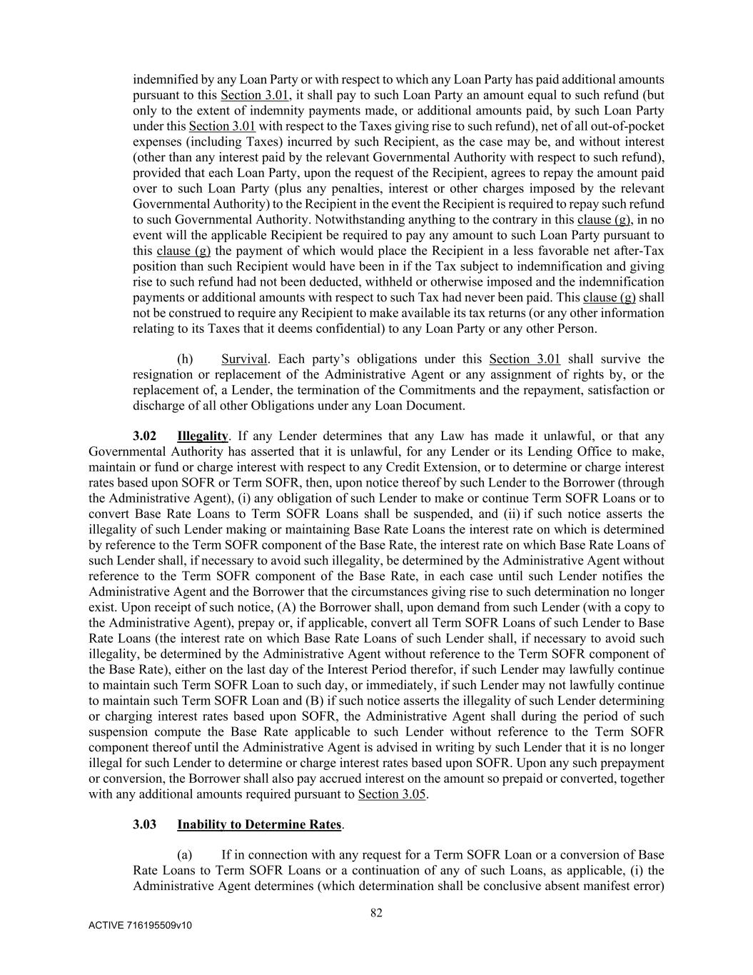82 ACTIVE 716195509v10 indemnified by any Loan Party or with respect to which any Loan Party has paid additional amounts pursuant to this Section 3.01, it shall pay to such Loan Party an amount equal to such refund (but only to the extent of indemnity payments made, or additional amounts paid, by such Loan Party under this Section 3.01 with respect to the Taxes giving rise to such refund), net of all out-of-pocket expenses (including Taxes) incurred by such Recipient, as the case may be, and without interest (other than any interest paid by the relevant Governmental Authority with respect to such refund), provided that each Loan Party, upon the request of the Recipient, agrees to repay the amount paid over to such Loan Party (plus any penalties, interest or other charges imposed by the relevant Governmental Authority) to the Recipient in the event the Recipient is required to repay such refund to such Governmental Authority. Notwithstanding anything to the contrary in this clause (g), in no event will the applicable Recipient be required to pay any amount to such Loan Party pursuant to this clause (g) the payment of which would place the Recipient in a less favorable net after-Tax position than such Recipient would have been in if the Tax subject to indemnification and giving rise to such refund had not been deducted, withheld or otherwise imposed and the indemnification payments or additional amounts with respect to such Tax had never been paid. This clause (g) shall not be construed to require any Recipient to make available its tax returns (or any other information relating to its Taxes that it deems confidential) to any Loan Party or any other Person. (h) Survival. Each party’s obligations under this Section 3.01 shall survive the resignation or replacement of the Administrative Agent or any assignment of rights by, or the replacement of, a Lender, the termination of the Commitments and the repayment, satisfaction or discharge of all other Obligations under any Loan Document. 3.02 Illegality. If any Lender determines that any Law has made it unlawful, or that any Governmental Authority has asserted that it is unlawful, for any Lender or its Lending Office to make, maintain or fund or charge interest with respect to any Credit Extension, or to determine or charge interest rates based upon SOFR or Term SOFR, then, upon notice thereof by such Lender to the Borrower (through the Administrative Agent), (i) any obligation of such Lender to make or continue Term SOFR Loans or to convert Base Rate Loans to Term SOFR Loans shall be suspended, and (ii) if such notice asserts the illegality of such Lender making or maintaining Base Rate Loans the interest rate on which is determined by reference to the Term SOFR component of the Base Rate, the interest rate on which Base Rate Loans of such Lender shall, if necessary to avoid such illegality, be determined by the Administrative Agent without reference to the Term SOFR component of the Base Rate, in each case until such Lender notifies the Administrative Agent and the Borrower that the circumstances giving rise to such determination no longer exist. Upon receipt of such notice, (A) the Borrower shall, upon demand from such Lender (with a copy to the Administrative Agent), prepay or, if applicable, convert all Term SOFR Loans of such Lender to Base Rate Loans (the interest rate on which Base Rate Loans of such Lender shall, if necessary to avoid such illegality, be determined by the Administrative Agent without reference to the Term SOFR component of the Base Rate), either on the last day of the Interest Period therefor, if such Lender may lawfully continue to maintain such Term SOFR Loan to such day, or immediately, if such Lender may not lawfully continue to maintain such Term SOFR Loan and (B) if such notice asserts the illegality of such Lender determining or charging interest rates based upon SOFR, the Administrative Agent shall during the period of such suspension compute the Base Rate applicable to such Lender without reference to the Term SOFR component thereof until the Administrative Agent is advised in writing by such Lender that it is no longer illegal for such Lender to determine or charge interest rates based upon SOFR. Upon any such prepayment or conversion, the Borrower shall also pay accrued interest on the amount so prepaid or converted, together with any additional amounts required pursuant to Section 3.05. 3.03 Inability to Determine Rates. (a) If in connection with any request for a Term SOFR Loan or a conversion of Base Rate Loans to Term SOFR Loans or a continuation of any of such Loans, as applicable, (i) the Administrative Agent determines (which determination shall be conclusive absent manifest error)