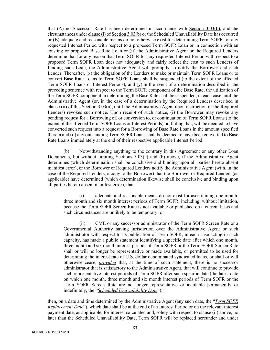 83 ACTIVE 716195509v10 that (A) no Successor Rate has been determined in accordance with Section 3.03(b), and the circumstances under clause (i) of Section 3.03(b) or the Scheduled Unavailability Date has occurred or (B) adequate and reasonable means do not otherwise exist for determining Term SOFR for any requested Interest Period with respect to a proposed Term SOFR Loan or in connection with an existing or proposed Base Rate Loan or (ii) the Administrative Agent or the Required Lenders determine that for any reason that Term SOFR for any requested Interest Period with respect to a proposed Term SOFR Loan does not adequately and fairly reflect the cost to such Lenders of funding such Loan, the Administrative Agent will promptly so notify the Borrower and each Lender. Thereafter, (x) the obligation of the Lenders to make or maintain Term SOFR Loans or to convert Base Rate Loans to Term SOFR Loans shall be suspended (to the extent of the affected Term SOFR Loans or Interest Periods), and (y) in the event of a determination described in the preceding sentence with respect to the Term SOFR component of the Base Rate, the utilization of the Term SOFR component in determining the Base Rate shall be suspended, in each case until the Administrative Agent (or, in the case of a determination by the Required Lenders described in clause (ii) of this Section 3.03(a), until the Administrative Agent upon instruction of the Required Lenders) revokes such notice. Upon receipt of such notice, (i) the Borrower may revoke any pending request for a Borrowing of, or conversion to, or continuation of Term SOFR Loans (to the extent of the affected Term SOFR Loans or Interest Periods) or, failing that, will be deemed to have converted such request into a request for a Borrowing of Base Rate Loans in the amount specified therein and (ii) any outstanding Term SOFR Loans shall be deemed to have been converted to Base Rate Loans immediately at the end of their respective applicable Interest Period. (b) Notwithstanding anything to the contrary in this Agreement or any other Loan Documents, but without limiting Sections 3.03(a) and (b) above, if the Administrative Agent determines (which determination shall be conclusive and binding upon all parties hereto absent manifest error), or the Borrower or Required Lenders notify the Administrative Agent (with, in the case of the Required Lenders, a copy to the Borrower) that the Borrower or Required Lenders (as applicable) have determined (which determination likewise shall be conclusive and binding upon all parties hereto absent manifest error), that: (i) adequate and reasonable means do not exist for ascertaining one month, three month and six month interest periods of Term SOFR, including, without limitation, because the Term SOFR Screen Rate is not available or published on a current basis and such circumstances are unlikely to be temporary; or (ii) CME or any successor administrator of the Term SOFR Screen Rate or a Governmental Authority having jurisdiction over the Administrative Agent or such administrator with respect to its publication of Term SOFR, in each case acting in such capacity, has made a public statement identifying a specific date after which one month, three month and six month interest periods of Term SOFR or the Term SOFR Screen Rate shall or will no longer be representative or made available, or permitted to be used for determining the interest rate of U.S. dollar denominated syndicated loans, or shall or will otherwise cease, provided that, at the time of such statement, there is no successor administrator that is satisfactory to the Administrative Agent, that will continue to provide such representative interest periods of Term SOFR after such specific date (the latest date on which one month, three month and six month interest periods of Term SOFR or the Term SOFR Screen Rate are no longer representative or available permanently or indefinitely, the “Scheduled Unavailability Date”); then, on a date and time determined by the Administrative Agent (any such date, the “Term SOFR Replacement Date”), which date shall be at the end of an Interest Period or on the relevant interest payment date, as applicable, for interest calculated and, solely with respect to clause (ii) above, no later than the Scheduled Unavailability Date, Term SOFR will be replaced hereunder and under