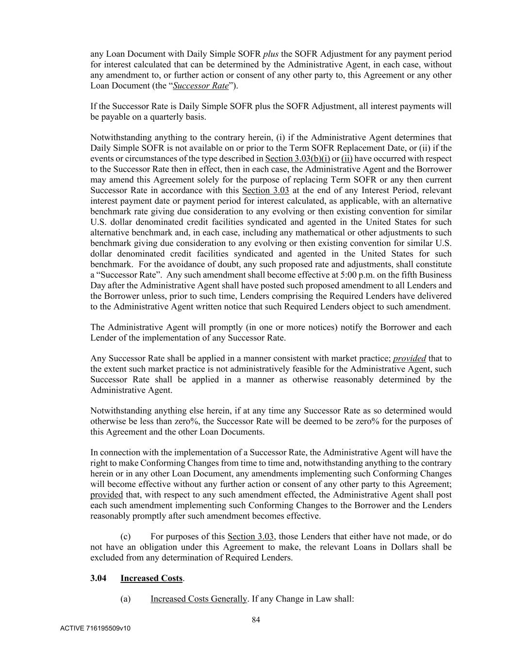 84 ACTIVE 716195509v10 any Loan Document with Daily Simple SOFR plus the SOFR Adjustment for any payment period for interest calculated that can be determined by the Administrative Agent, in each case, without any amendment to, or further action or consent of any other party to, this Agreement or any other Loan Document (the “Successor Rate”). If the Successor Rate is Daily Simple SOFR plus the SOFR Adjustment, all interest payments will be payable on a quarterly basis. Notwithstanding anything to the contrary herein, (i) if the Administrative Agent determines that Daily Simple SOFR is not available on or prior to the Term SOFR Replacement Date, or (ii) if the events or circumstances of the type described in Section 3.03(b)(i) or (ii) have occurred with respect to the Successor Rate then in effect, then in each case, the Administrative Agent and the Borrower may amend this Agreement solely for the purpose of replacing Term SOFR or any then current Successor Rate in accordance with this Section 3.03 at the end of any Interest Period, relevant interest payment date or payment period for interest calculated, as applicable, with an alternative benchmark rate giving due consideration to any evolving or then existing convention for similar U.S. dollar denominated credit facilities syndicated and agented in the United States for such alternative benchmark and, in each case, including any mathematical or other adjustments to such benchmark giving due consideration to any evolving or then existing convention for similar U.S. dollar denominated credit facilities syndicated and agented in the United States for such benchmark. For the avoidance of doubt, any such proposed rate and adjustments, shall constitute a “Successor Rate”. Any such amendment shall become effective at 5:00 p.m. on the fifth Business Day after the Administrative Agent shall have posted such proposed amendment to all Lenders and the Borrower unless, prior to such time, Lenders comprising the Required Lenders have delivered to the Administrative Agent written notice that such Required Lenders object to such amendment. The Administrative Agent will promptly (in one or more notices) notify the Borrower and each Lender of the implementation of any Successor Rate. Any Successor Rate shall be applied in a manner consistent with market practice; provided that to the extent such market practice is not administratively feasible for the Administrative Agent, such Successor Rate shall be applied in a manner as otherwise reasonably determined by the Administrative Agent. Notwithstanding anything else herein, if at any time any Successor Rate as so determined would otherwise be less than zero%, the Successor Rate will be deemed to be zero% for the purposes of this Agreement and the other Loan Documents. In connection with the implementation of a Successor Rate, the Administrative Agent will have the right to make Conforming Changes from time to time and, notwithstanding anything to the contrary herein or in any other Loan Document, any amendments implementing such Conforming Changes will become effective without any further action or consent of any other party to this Agreement; provided that, with respect to any such amendment effected, the Administrative Agent shall post each such amendment implementing such Conforming Changes to the Borrower and the Lenders reasonably promptly after such amendment becomes effective. (c) For purposes of this Section 3.03, those Lenders that either have not made, or do not have an obligation under this Agreement to make, the relevant Loans in Dollars shall be excluded from any determination of Required Lenders. 3.04 Increased Costs. (a) Increased Costs Generally. If any Change in Law shall: