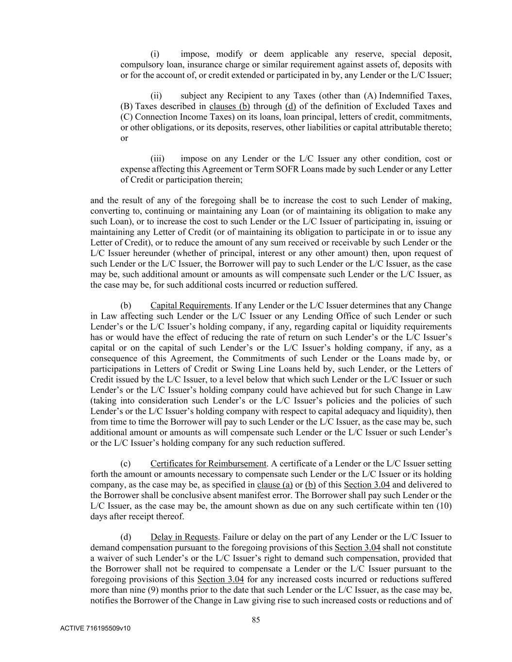 85 ACTIVE 716195509v10 (i) impose, modify or deem applicable any reserve, special deposit, compulsory loan, insurance charge or similar requirement against assets of, deposits with or for the account of, or credit extended or participated in by, any Lender or the L/C Issuer; (ii) subject any Recipient to any Taxes (other than (A) Indemnified Taxes, (B) Taxes described in clauses (b) through (d) of the definition of Excluded Taxes and (C) Connection Income Taxes) on its loans, loan principal, letters of credit, commitments, or other obligations, or its deposits, reserves, other liabilities or capital attributable thereto; or (iii) impose on any Lender or the L/C Issuer any other condition, cost or expense affecting this Agreement or Term SOFR Loans made by such Lender or any Letter of Credit or participation therein; and the result of any of the foregoing shall be to increase the cost to such Lender of making, converting to, continuing or maintaining any Loan (or of maintaining its obligation to make any such Loan), or to increase the cost to such Lender or the L/C Issuer of participating in, issuing or maintaining any Letter of Credit (or of maintaining its obligation to participate in or to issue any Letter of Credit), or to reduce the amount of any sum received or receivable by such Lender or the L/C Issuer hereunder (whether of principal, interest or any other amount) then, upon request of such Lender or the L/C Issuer, the Borrower will pay to such Lender or the L/C Issuer, as the case may be, such additional amount or amounts as will compensate such Lender or the L/C Issuer, as the case may be, for such additional costs incurred or reduction suffered. (b) Capital Requirements. If any Lender or the L/C Issuer determines that any Change in Law affecting such Lender or the L/C Issuer or any Lending Office of such Lender or such Lender’s or the L/C Issuer’s holding company, if any, regarding capital or liquidity requirements has or would have the effect of reducing the rate of return on such Lender’s or the L/C Issuer’s capital or on the capital of such Lender’s or the L/C Issuer’s holding company, if any, as a consequence of this Agreement, the Commitments of such Lender or the Loans made by, or participations in Letters of Credit or Swing Line Loans held by, such Lender, or the Letters of Credit issued by the L/C Issuer, to a level below that which such Lender or the L/C Issuer or such Lender’s or the L/C Issuer’s holding company could have achieved but for such Change in Law (taking into consideration such Lender’s or the L/C Issuer’s policies and the policies of such Lender’s or the L/C Issuer’s holding company with respect to capital adequacy and liquidity), then from time to time the Borrower will pay to such Lender or the L/C Issuer, as the case may be, such additional amount or amounts as will compensate such Lender or the L/C Issuer or such Lender’s or the L/C Issuer’s holding company for any such reduction suffered. (c) Certificates for Reimbursement. A certificate of a Lender or the L/C Issuer setting forth the amount or amounts necessary to compensate such Lender or the L/C Issuer or its holding company, as the case may be, as specified in clause (a) or (b) of this Section 3.04 and delivered to the Borrower shall be conclusive absent manifest error. The Borrower shall pay such Lender or the L/C Issuer, as the case may be, the amount shown as due on any such certificate within ten (10) days after receipt thereof. (d) Delay in Requests. Failure or delay on the part of any Lender or the L/C Issuer to demand compensation pursuant to the foregoing provisions of this Section 3.04 shall not constitute a waiver of such Lender’s or the L/C Issuer’s right to demand such compensation, provided that the Borrower shall not be required to compensate a Lender or the L/C Issuer pursuant to the foregoing provisions of this Section 3.04 for any increased costs incurred or reductions suffered more than nine (9) months prior to the date that such Lender or the L/C Issuer, as the case may be, notifies the Borrower of the Change in Law giving rise to such increased costs or reductions and of