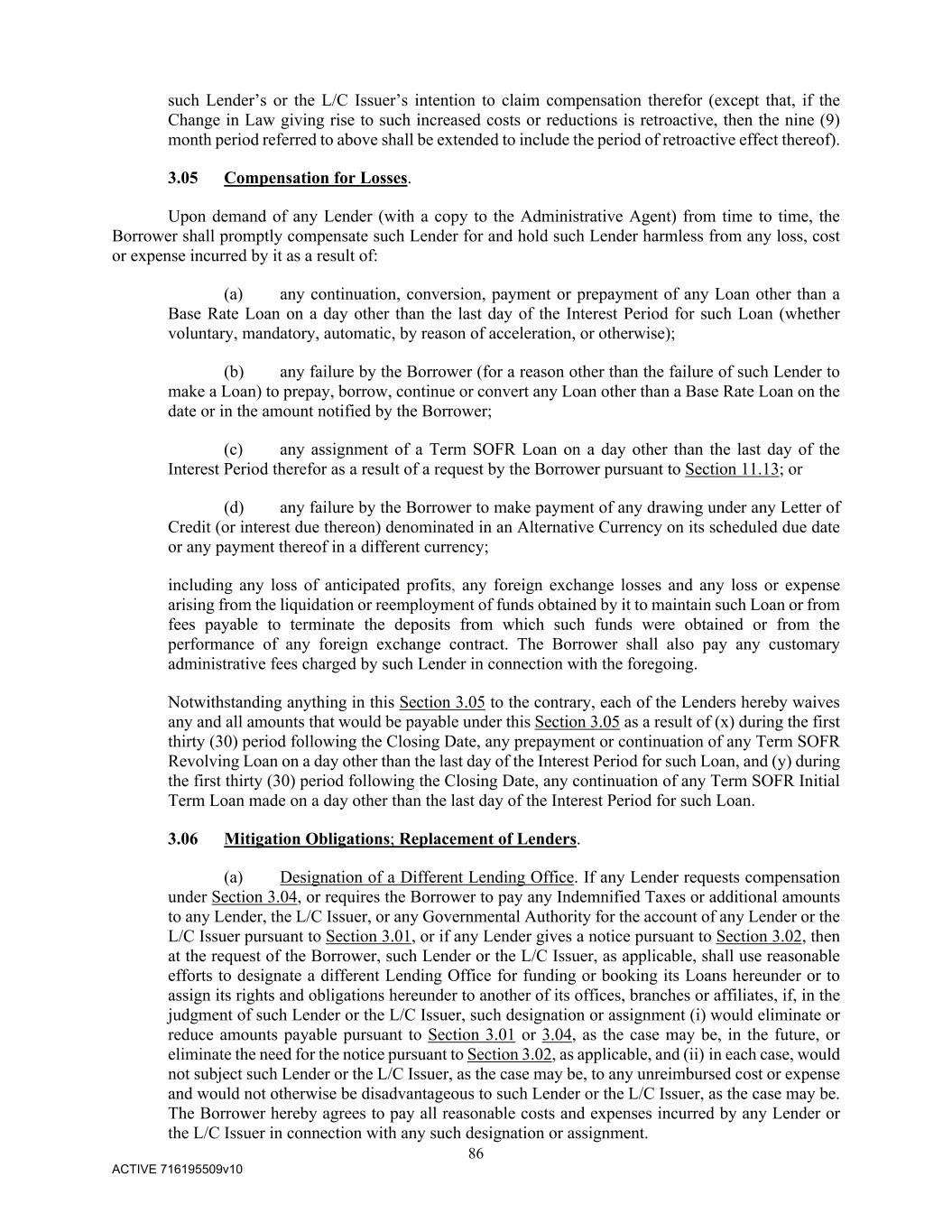 86 ACTIVE 716195509v10 such Lender’s or the L/C Issuer’s intention to claim compensation therefor (except that, if the Change in Law giving rise to such increased costs or reductions is retroactive, then the nine (9) month period referred to above shall be extended to include the period of retroactive effect thereof). 3.05 Compensation for Losses. Upon demand of any Lender (with a copy to the Administrative Agent) from time to time, the Borrower shall promptly compensate such Lender for and hold such Lender harmless from any loss, cost or expense incurred by it as a result of: (a) any continuation, conversion, payment or prepayment of any Loan other than a Base Rate Loan on a day other than the last day of the Interest Period for such Loan (whether voluntary, mandatory, automatic, by reason of acceleration, or otherwise); (b) any failure by the Borrower (for a reason other than the failure of such Lender to make a Loan) to prepay, borrow, continue or convert any Loan other than a Base Rate Loan on the date or in the amount notified by the Borrower; (c) any assignment of a Term SOFR Loan on a day other than the last day of the Interest Period therefor as a result of a request by the Borrower pursuant to Section 11.13; or (d) any failure by the Borrower to make payment of any drawing under any Letter of Credit (or interest due thereon) denominated in an Alternative Currency on its scheduled due date or any payment thereof in a different currency; including any loss of anticipated profits, any foreign exchange losses and any loss or expense arising from the liquidation or reemployment of funds obtained by it to maintain such Loan or from fees payable to terminate the deposits from which such funds were obtained or from the performance of any foreign exchange contract. The Borrower shall also pay any customary administrative fees charged by such Lender in connection with the foregoing. Notwithstanding anything in this Section 3.05 to the contrary, each of the Lenders hereby waives any and all amounts that would be payable under this Section 3.05 as a result of (x) during the first thirty (30) period following the Closing Date, any prepayment or continuation of any Term SOFR Revolving Loan on a day other than the last day of the Interest Period for such Loan, and (y) during the first thirty (30) period following the Closing Date, any continuation of any Term SOFR Initial Term Loan made on a day other than the last day of the Interest Period for such Loan. 3.06 Mitigation Obligations; Replacement of Lenders. (a) Designation of a Different Lending Office. If any Lender requests compensation under Section 3.04, or requires the Borrower to pay any Indemnified Taxes or additional amounts to any Lender, the L/C Issuer, or any Governmental Authority for the account of any Lender or the L/C Issuer pursuant to Section 3.01, or if any Lender gives a notice pursuant to Section 3.02, then at the request of the Borrower, such Lender or the L/C Issuer, as applicable, shall use reasonable efforts to designate a different Lending Office for funding or booking its Loans hereunder or to assign its rights and obligations hereunder to another of its offices, branches or affiliates, if, in the judgment of such Lender or the L/C Issuer, such designation or assignment (i) would eliminate or reduce amounts payable pursuant to Section 3.01 or 3.04, as the case may be, in the future, or eliminate the need for the notice pursuant to Section 3.02, as applicable, and (ii) in each case, would not subject such Lender or the L/C Issuer, as the case may be, to any unreimbursed cost or expense and would not otherwise be disadvantageous to such Lender or the L/C Issuer, as the case may be. The Borrower hereby agrees to pay all reasonable costs and expenses incurred by any Lender or the L/C Issuer in connection with any such designation or assignment.