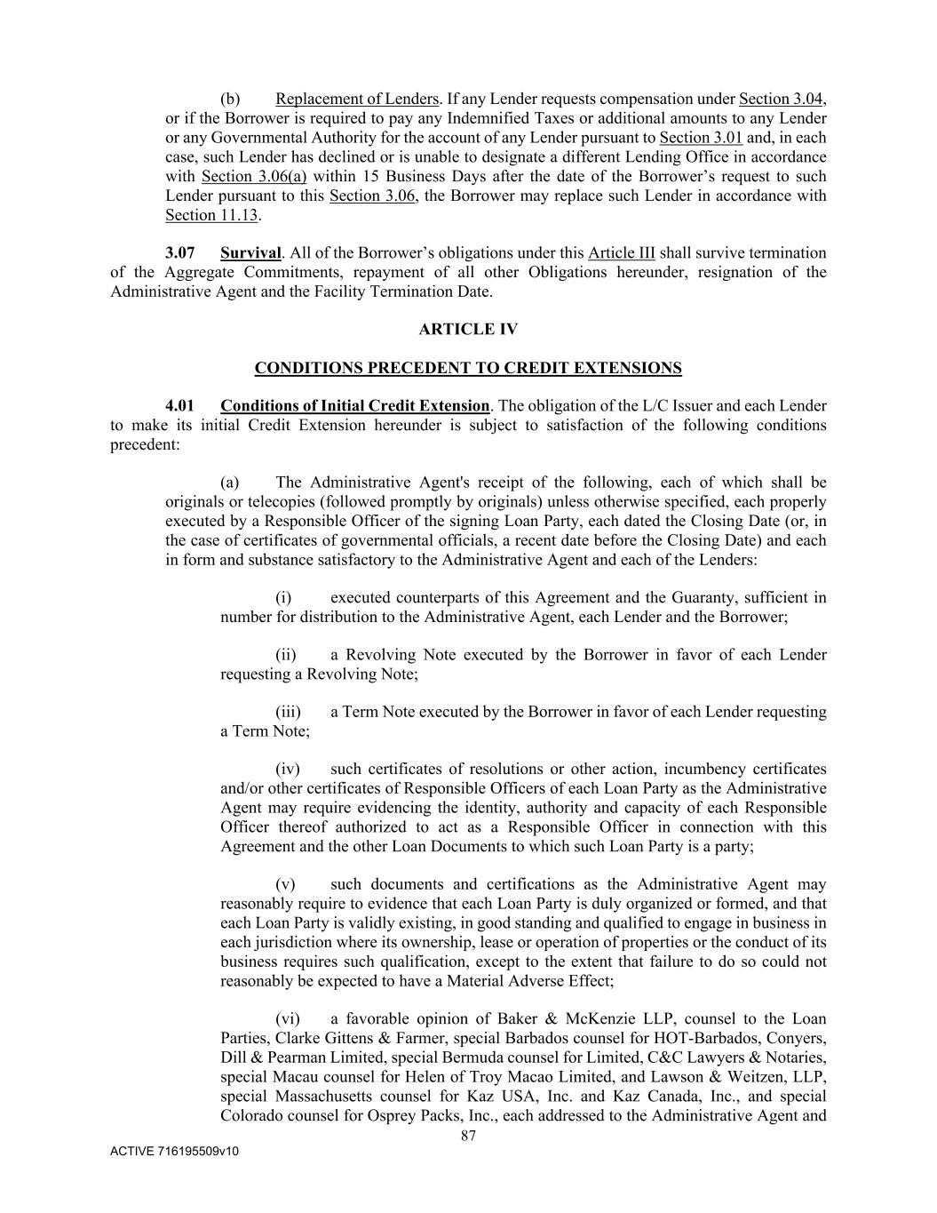 87 ACTIVE 716195509v10 (b) Replacement of Lenders. If any Lender requests compensation under Section 3.04, or if the Borrower is required to pay any Indemnified Taxes or additional amounts to any Lender or any Governmental Authority for the account of any Lender pursuant to Section 3.01 and, in each case, such Lender has declined or is unable to designate a different Lending Office in accordance with Section 3.06(a) within 15 Business Days after the date of the Borrower’s request to such Lender pursuant to this Section 3.06, the Borrower may replace such Lender in accordance with Section 11.13. 3.07 Survival. All of the Borrower’s obligations under this Article III shall survive termination of the Aggregate Commitments, repayment of all other Obligations hereunder, resignation of the Administrative Agent and the Facility Termination Date. ARTICLE IV CONDITIONS PRECEDENT TO CREDIT EXTENSIONS 4.01 Conditions of Initial Credit Extension. The obligation of the L/C Issuer and each Lender to make its initial Credit Extension hereunder is subject to satisfaction of the following conditions precedent: (a) The Administrative Agent's receipt of the following, each of which shall be originals or telecopies (followed promptly by originals) unless otherwise specified, each properly executed by a Responsible Officer of the signing Loan Party, each dated the Closing Date (or, in the case of certificates of governmental officials, a recent date before the Closing Date) and each in form and substance satisfactory to the Administrative Agent and each of the Lenders: (i) executed counterparts of this Agreement and the Guaranty, sufficient in number for distribution to the Administrative Agent, each Lender and the Borrower; (ii) a Revolving Note executed by the Borrower in favor of each Lender requesting a Revolving Note; (iii) a Term Note executed by the Borrower in favor of each Lender requesting a Term Note; (iv) such certificates of resolutions or other action, incumbency certificates and/or other certificates of Responsible Officers of each Loan Party as the Administrative Agent may require evidencing the identity, authority and capacity of each Responsible Officer thereof authorized to act as a Responsible Officer in connection with this Agreement and the other Loan Documents to which such Loan Party is a party; (v) such documents and certifications as the Administrative Agent may reasonably require to evidence that each Loan Party is duly organized or formed, and that each Loan Party is validly existing, in good standing and qualified to engage in business in each jurisdiction where its ownership, lease or operation of properties or the conduct of its business requires such qualification, except to the extent that failure to do so could not reasonably be expected to have a Material Adverse Effect; (vi) a favorable opinion of Baker & McKenzie LLP, counsel to the Loan Parties, Clarke Gittens & Farmer, special Barbados counsel for HOT-Barbados, Conyers, Dill & Pearman Limited, special Bermuda counsel for Limited, C&C Lawyers & Notaries, special Macau counsel for Helen of Troy Macao Limited, and Lawson & Weitzen, LLP, special Massachusetts counsel for Kaz USA, Inc. and Kaz Canada, Inc., and special Colorado counsel for Osprey Packs, Inc., each addressed to the Administrative Agent and