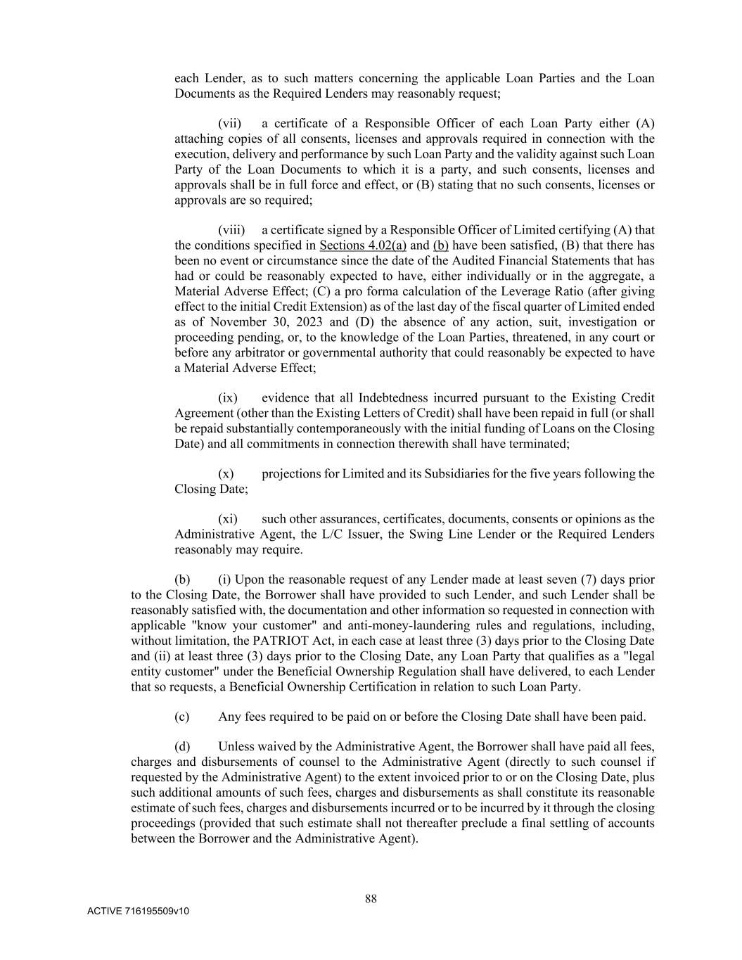 88 ACTIVE 716195509v10 each Lender, as to such matters concerning the applicable Loan Parties and the Loan Documents as the Required Lenders may reasonably request; (vii) a certificate of a Responsible Officer of each Loan Party either (A) attaching copies of all consents, licenses and approvals required in connection with the execution, delivery and performance by such Loan Party and the validity against such Loan Party of the Loan Documents to which it is a party, and such consents, licenses and approvals shall be in full force and effect, or (B) stating that no such consents, licenses or approvals are so required; (viii) a certificate signed by a Responsible Officer of Limited certifying (A) that the conditions specified in Sections 4.02(a) and (b) have been satisfied, (B) that there has been no event or circumstance since the date of the Audited Financial Statements that has had or could be reasonably expected to have, either individually or in the aggregate, a Material Adverse Effect; (C) a pro forma calculation of the Leverage Ratio (after giving effect to the initial Credit Extension) as of the last day of the fiscal quarter of Limited ended as of November 30, 2023 and (D) the absence of any action, suit, investigation or proceeding pending, or, to the knowledge of the Loan Parties, threatened, in any court or before any arbitrator or governmental authority that could reasonably be expected to have a Material Adverse Effect; (ix) evidence that all Indebtedness incurred pursuant to the Existing Credit Agreement (other than the Existing Letters of Credit) shall have been repaid in full (or shall be repaid substantially contemporaneously with the initial funding of Loans on the Closing Date) and all commitments in connection therewith shall have terminated; (x) projections for Limited and its Subsidiaries for the five years following the Closing Date; (xi) such other assurances, certificates, documents, consents or opinions as the Administrative Agent, the L/C Issuer, the Swing Line Lender or the Required Lenders reasonably may require. (b) (i) Upon the reasonable request of any Lender made at least seven (7) days prior to the Closing Date, the Borrower shall have provided to such Lender, and such Lender shall be reasonably satisfied with, the documentation and other information so requested in connection with applicable "know your customer" and anti-money-laundering rules and regulations, including, without limitation, the PATRIOT Act, in each case at least three (3) days prior to the Closing Date and (ii) at least three (3) days prior to the Closing Date, any Loan Party that qualifies as a "legal entity customer" under the Beneficial Ownership Regulation shall have delivered, to each Lender that so requests, a Beneficial Ownership Certification in relation to such Loan Party. (c) Any fees required to be paid on or before the Closing Date shall have been paid. (d) Unless waived by the Administrative Agent, the Borrower shall have paid all fees, charges and disbursements of counsel to the Administrative Agent (directly to such counsel if requested by the Administrative Agent) to the extent invoiced prior to or on the Closing Date, plus such additional amounts of such fees, charges and disbursements as shall constitute its reasonable estimate of such fees, charges and disbursements incurred or to be incurred by it through the closing proceedings (provided that such estimate shall not thereafter preclude a final settling of accounts between the Borrower and the Administrative Agent).