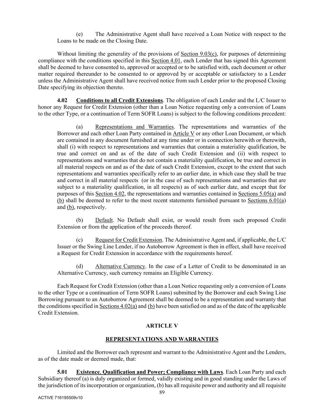 89 ACTIVE 716195509v10 (e) The Administrative Agent shall have received a Loan Notice with respect to the Loans to be made on the Closing Date. Without limiting the generality of the provisions of Section 9.03(c), for purposes of determining compliance with the conditions specified in this Section 4.01, each Lender that has signed this Agreement shall be deemed to have consented to, approved or accepted or to be satisfied with, each document or other matter required thereunder to be consented to or approved by or acceptable or satisfactory to a Lender unless the Administrative Agent shall have received notice from such Lender prior to the proposed Closing Date specifying its objection thereto. 4.02 Conditions to all Credit Extensions. The obligation of each Lender and the L/C Issuer to honor any Request for Credit Extension (other than a Loan Notice requesting only a conversion of Loans to the other Type, or a continuation of Term SOFR Loans) is subject to the following conditions precedent: (a) Representations and Warranties. The representations and warranties of the Borrower and each other Loan Party contained in Article V or any other Loan Document, or which are contained in any document furnished at any time under or in connection herewith or therewith, shall (i) with respect to representations and warranties that contain a materiality qualification, be true and correct on and as of the date of such Credit Extension and (ii) with respect to representations and warranties that do not contain a materiality qualification, be true and correct in all material respects on and as of the date of such Credit Extension, except to the extent that such representations and warranties specifically refer to an earlier date, in which case they shall be true and correct in all material respects (or in the case of such representations and warranties that are subject to a materiality qualification, in all respects) as of such earlier date, and except that for purposes of this Section 4.02, the representations and warranties contained in Sections 5.05(a) and (b) shall be deemed to refer to the most recent statements furnished pursuant to Sections 6.01(a) and (b), respectively. (b) Default. No Default shall exist, or would result from such proposed Credit Extension or from the application of the proceeds thereof. (c) Request for Credit Extension. The Administrative Agent and, if applicable, the L/C Issuer or the Swing Line Lender, if no Autoborrow Agreement is then in effect, shall have received a Request for Credit Extension in accordance with the requirements hereof. (d) Alternative Currency. In the case of a Letter of Credit to be denominated in an Alternative Currency, such currency remains an Eligible Currency. Each Request for Credit Extension (other than a Loan Notice requesting only a conversion of Loans to the other Type or a continuation of Term SOFR Loans) submitted by the Borrower and each Swing Line Borrowing pursuant to an Autoborrow Agreement shall be deemed to be a representation and warranty that the conditions specified in Sections 4.02(a) and (b) have been satisfied on and as of the date of the applicable Credit Extension. ARTICLE V REPRESENTATIONS AND WARRANTIES Limited and the Borrower each represent and warrant to the Administrative Agent and the Lenders, as of the date made or deemed made, that: 5.01 Existence, Qualification and Power; Compliance with Laws. Each Loan Party and each Subsidiary thereof (a) is duly organized or formed, validly existing and in good standing under the Laws of the jurisdiction of its incorporation or organization, (b) has all requisite power and authority and all requisite