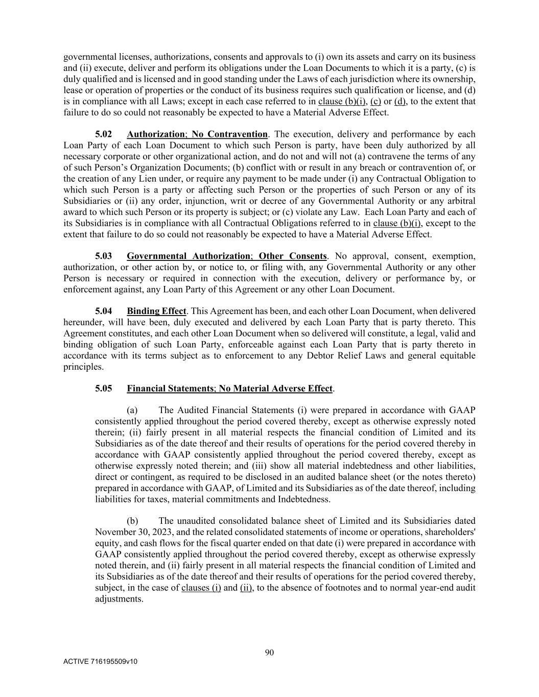 90 ACTIVE 716195509v10 governmental licenses, authorizations, consents and approvals to (i) own its assets and carry on its business and (ii) execute, deliver and perform its obligations under the Loan Documents to which it is a party, (c) is duly qualified and is licensed and in good standing under the Laws of each jurisdiction where its ownership, lease or operation of properties or the conduct of its business requires such qualification or license, and (d) is in compliance with all Laws; except in each case referred to in clause (b)(i), (c) or (d), to the extent that failure to do so could not reasonably be expected to have a Material Adverse Effect. 5.02 Authorization; No Contravention. The execution, delivery and performance by each Loan Party of each Loan Document to which such Person is party, have been duly authorized by all necessary corporate or other organizational action, and do not and will not (a) contravene the terms of any of such Person’s Organization Documents; (b) conflict with or result in any breach or contravention of, or the creation of any Lien under, or require any payment to be made under (i) any Contractual Obligation to which such Person is a party or affecting such Person or the properties of such Person or any of its Subsidiaries or (ii) any order, injunction, writ or decree of any Governmental Authority or any arbitral award to which such Person or its property is subject; or (c) violate any Law. Each Loan Party and each of its Subsidiaries is in compliance with all Contractual Obligations referred to in clause (b)(i), except to the extent that failure to do so could not reasonably be expected to have a Material Adverse Effect. 5.03 Governmental Authorization; Other Consents. No approval, consent, exemption, authorization, or other action by, or notice to, or filing with, any Governmental Authority or any other Person is necessary or required in connection with the execution, delivery or performance by, or enforcement against, any Loan Party of this Agreement or any other Loan Document. 5.04 Binding Effect. This Agreement has been, and each other Loan Document, when delivered hereunder, will have been, duly executed and delivered by each Loan Party that is party thereto. This Agreement constitutes, and each other Loan Document when so delivered will constitute, a legal, valid and binding obligation of such Loan Party, enforceable against each Loan Party that is party thereto in accordance with its terms subject as to enforcement to any Debtor Relief Laws and general equitable principles. 5.05 Financial Statements; No Material Adverse Effect. (a) The Audited Financial Statements (i) were prepared in accordance with GAAP consistently applied throughout the period covered thereby, except as otherwise expressly noted therein; (ii) fairly present in all material respects the financial condition of Limited and its Subsidiaries as of the date thereof and their results of operations for the period covered thereby in accordance with GAAP consistently applied throughout the period covered thereby, except as otherwise expressly noted therein; and (iii) show all material indebtedness and other liabilities, direct or contingent, as required to be disclosed in an audited balance sheet (or the notes thereto) prepared in accordance with GAAP, of Limited and its Subsidiaries as of the date thereof, including liabilities for taxes, material commitments and Indebtedness. (b) The unaudited consolidated balance sheet of Limited and its Subsidiaries dated November 30, 2023, and the related consolidated statements of income or operations, shareholders' equity, and cash flows for the fiscal quarter ended on that date (i) were prepared in accordance with GAAP consistently applied throughout the period covered thereby, except as otherwise expressly noted therein, and (ii) fairly present in all material respects the financial condition of Limited and its Subsidiaries as of the date thereof and their results of operations for the period covered thereby, subject, in the case of clauses (i) and (ii), to the absence of footnotes and to normal year-end audit adjustments.