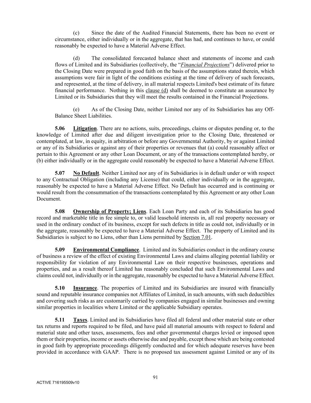 91 ACTIVE 716195509v10 (c) Since the date of the Audited Financial Statements, there has been no event or circumstance, either individually or in the aggregate, that has had, and continues to have, or could reasonably be expected to have a Material Adverse Effect. (d) The consolidated forecasted balance sheet and statements of income and cash flows of Limited and its Subsidiaries (collectively, the “Financial Projections”) delivered prior to the Closing Date were prepared in good faith on the basis of the assumptions stated therein, which assumptions were fair in light of the conditions existing at the time of delivery of such forecasts, and represented, at the time of delivery, in all material respects Limited's best estimate of its future financial performance. Nothing in this clause (d) shall be deemed to constitute an assurance by Limited or its Subsidiaries that they will meet the results contained in the Financial Projections. (e) As of the Closing Date, neither Limited nor any of its Subsidiaries has any Off- Balance Sheet Liabilities. 5.06 Litigation. There are no actions, suits, proceedings, claims or disputes pending or, to the knowledge of Limited after due and diligent investigation prior to the Closing Date, threatened or contemplated, at law, in equity, in arbitration or before any Governmental Authority, by or against Limited or any of its Subsidiaries or against any of their properties or revenues that (a) could reasonably affect or pertain to this Agreement or any other Loan Document, or any of the transactions contemplated hereby, or (b) either individually or in the aggregate could reasonably be expected to have a Material Adverse Effect. 5.07 No Default. Neither Limited nor any of its Subsidiaries is in default under or with respect to any Contractual Obligation (including any License) that could, either individually or in the aggregate, reasonably be expected to have a Material Adverse Effect. No Default has occurred and is continuing or would result from the consummation of the transactions contemplated by this Agreement or any other Loan Document. 5.08 Ownership of Property; Liens. Each Loan Party and each of its Subsidiaries has good record and marketable title in fee simple to, or valid leasehold interests in, all real property necessary or used in the ordinary conduct of its business, except for such defects in title as could not, individually or in the aggregate, reasonably be expected to have a Material Adverse Effect. The property of Limited and its Subsidiaries is subject to no Liens, other than Liens permitted by Section 7.01. 5.09 Environmental Compliance. Limited and its Subsidiaries conduct in the ordinary course of business a review of the effect of existing Environmental Laws and claims alleging potential liability or responsibility for violation of any Environmental Law on their respective businesses, operations and properties, and as a result thereof Limited has reasonably concluded that such Environmental Laws and claims could not, individually or in the aggregate, reasonably be expected to have a Material Adverse Effect. 5.10 Insurance. The properties of Limited and its Subsidiaries are insured with financially sound and reputable insurance companies not Affiliates of Limited, in such amounts, with such deductibles and covering such risks as are customarily carried by companies engaged in similar businesses and owning similar properties in localities where Limited or the applicable Subsidiary operates. 5.11 Taxes. Limited and its Subsidiaries have filed all federal and other material state or other tax returns and reports required to be filed, and have paid all material amounts with respect to federal and material state and other taxes, assessments, fees and other governmental charges levied or imposed upon them or their properties, income or assets otherwise due and payable, except those which are being contested in good faith by appropriate proceedings diligently conducted and for which adequate reserves have been provided in accordance with GAAP. There is no proposed tax assessment against Limited or any of its