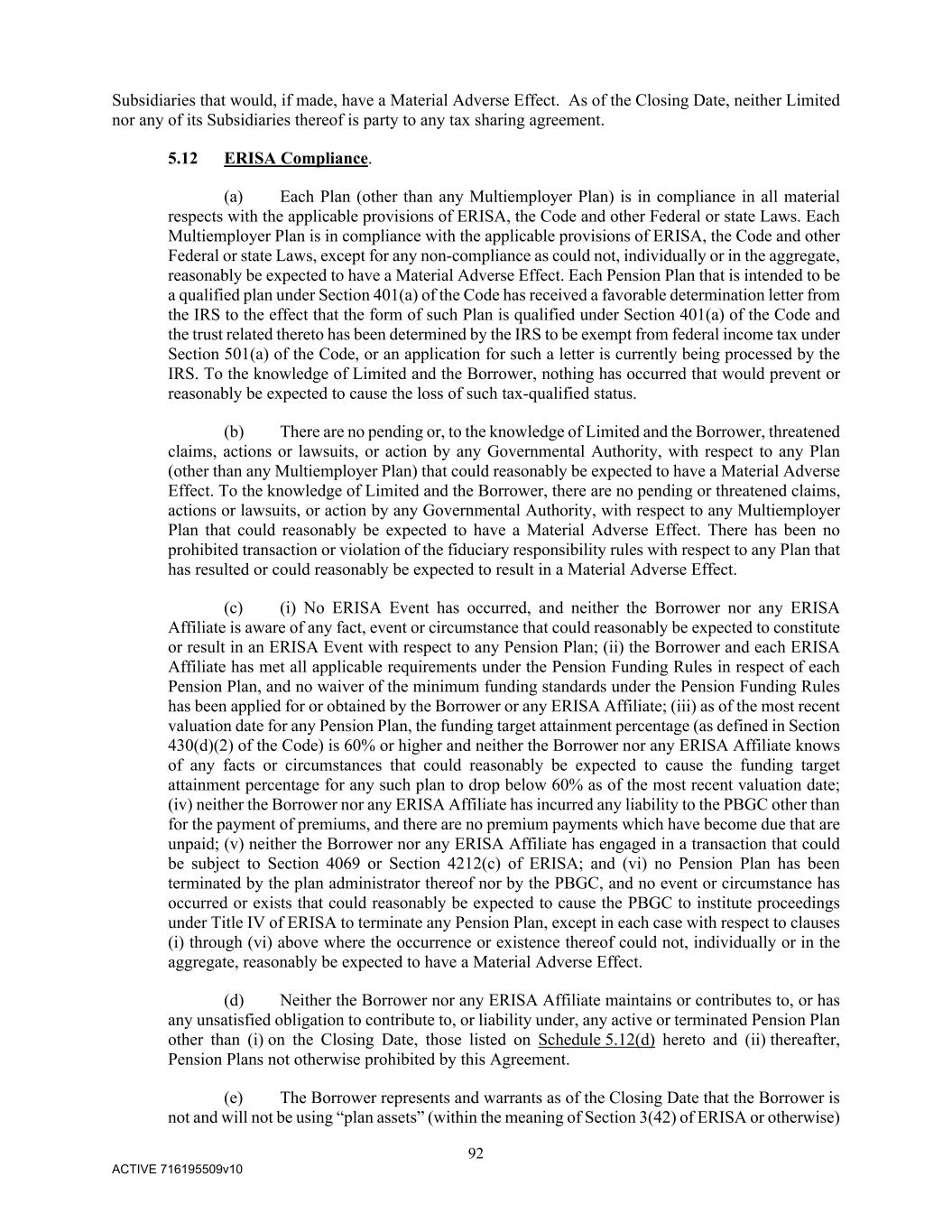 92 ACTIVE 716195509v10 Subsidiaries that would, if made, have a Material Adverse Effect. As of the Closing Date, neither Limited nor any of its Subsidiaries thereof is party to any tax sharing agreement. 5.12 ERISA Compliance. (a) Each Plan (other than any Multiemployer Plan) is in compliance in all material respects with the applicable provisions of ERISA, the Code and other Federal or state Laws. Each Multiemployer Plan is in compliance with the applicable provisions of ERISA, the Code and other Federal or state Laws, except for any non-compliance as could not, individually or in the aggregate, reasonably be expected to have a Material Adverse Effect. Each Pension Plan that is intended to be a qualified plan under Section 401(a) of the Code has received a favorable determination letter from the IRS to the effect that the form of such Plan is qualified under Section 401(a) of the Code and the trust related thereto has been determined by the IRS to be exempt from federal income tax under Section 501(a) of the Code, or an application for such a letter is currently being processed by the IRS. To the knowledge of Limited and the Borrower, nothing has occurred that would prevent or reasonably be expected to cause the loss of such tax-qualified status. (b) There are no pending or, to the knowledge of Limited and the Borrower, threatened claims, actions or lawsuits, or action by any Governmental Authority, with respect to any Plan (other than any Multiemployer Plan) that could reasonably be expected to have a Material Adverse Effect. To the knowledge of Limited and the Borrower, there are no pending or threatened claims, actions or lawsuits, or action by any Governmental Authority, with respect to any Multiemployer Plan that could reasonably be expected to have a Material Adverse Effect. There has been no prohibited transaction or violation of the fiduciary responsibility rules with respect to any Plan that has resulted or could reasonably be expected to result in a Material Adverse Effect. (c) (i) No ERISA Event has occurred, and neither the Borrower nor any ERISA Affiliate is aware of any fact, event or circumstance that could reasonably be expected to constitute or result in an ERISA Event with respect to any Pension Plan; (ii) the Borrower and each ERISA Affiliate has met all applicable requirements under the Pension Funding Rules in respect of each Pension Plan, and no waiver of the minimum funding standards under the Pension Funding Rules has been applied for or obtained by the Borrower or any ERISA Affiliate; (iii) as of the most recent valuation date for any Pension Plan, the funding target attainment percentage (as defined in Section 430(d)(2) of the Code) is 60% or higher and neither the Borrower nor any ERISA Affiliate knows of any facts or circumstances that could reasonably be expected to cause the funding target attainment percentage for any such plan to drop below 60% as of the most recent valuation date; (iv) neither the Borrower nor any ERISA Affiliate has incurred any liability to the PBGC other than for the payment of premiums, and there are no premium payments which have become due that are unpaid; (v) neither the Borrower nor any ERISA Affiliate has engaged in a transaction that could be subject to Section 4069 or Section 4212(c) of ERISA; and (vi) no Pension Plan has been terminated by the plan administrator thereof nor by the PBGC, and no event or circumstance has occurred or exists that could reasonably be expected to cause the PBGC to institute proceedings under Title IV of ERISA to terminate any Pension Plan, except in each case with respect to clauses (i) through (vi) above where the occurrence or existence thereof could not, individually or in the aggregate, reasonably be expected to have a Material Adverse Effect. (d) Neither the Borrower nor any ERISA Affiliate maintains or contributes to, or has any unsatisfied obligation to contribute to, or liability under, any active or terminated Pension Plan other than (i) on the Closing Date, those listed on Schedule 5.12(d) hereto and (ii) thereafter, Pension Plans not otherwise prohibited by this Agreement. (e) The Borrower represents and warrants as of the Closing Date that the Borrower is not and will not be using “plan assets” (within the meaning of Section 3(42) of ERISA or otherwise)