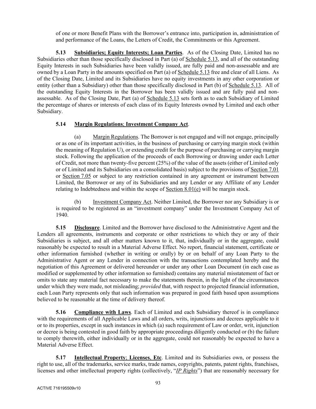 93 ACTIVE 716195509v10 of one or more Benefit Plans with the Borrower’s entrance into, participation in, administration of and performance of the Loans, the Letters of Credit, the Commitments or this Agreement. 5.13 Subsidiaries; Equity Interests; Loan Parties. As of the Closing Date, Limited has no Subsidiaries other than those specifically disclosed in Part (a) of Schedule 5.13, and all of the outstanding Equity Interests in such Subsidiaries have been validly issued, are fully paid and non-assessable and are owned by a Loan Party in the amounts specified on Part (a) of Schedule 5.13 free and clear of all Liens. As of the Closing Date, Limited and its Subsidiaries have no equity investments in any other corporation or entity (other than a Subsidiary) other than those specifically disclosed in Part (b) of Schedule 5.13. All of the outstanding Equity Interests in the Borrower has been validly issued and are fully paid and non- assessable. As of the Closing Date, Part (a) of Schedule 5.13 sets forth as to each Subsidiary of Limited the percentage of shares or interests of each class of its Equity Interests owned by Limited and each other Subsidiary. 5.14 Margin Regulations; Investment Company Act. (a) Margin Regulations. The Borrower is not engaged and will not engage, principally or as one of its important activities, in the business of purchasing or carrying margin stock (within the meaning of Regulation U), or extending credit for the purpose of purchasing or carrying margin stock. Following the application of the proceeds of each Borrowing or drawing under each Letter of Credit, not more than twenty-five percent (25%) of the value of the assets (either of Limited only or of Limited and its Subsidiaries on a consolidated basis) subject to the provisions of Section 7.01 or Section 7.05 or subject to any restriction contained in any agreement or instrument between Limited, the Borrower or any of its Subsidiaries and any Lender or any Affiliate of any Lender relating to Indebtedness and within the scope of Section 8.01(e) will be margin stock. (b) Investment Company Act. Neither Limited, the Borrower nor any Subsidiary is or is required to be registered as an “investment company” under the Investment Company Act of 1940. 5.15 Disclosure. Limited and the Borrower have disclosed to the Administrative Agent and the Lenders all agreements, instruments and corporate or other restrictions to which they or any of their Subsidiaries is subject, and all other matters known to it, that, individually or in the aggregate, could reasonably be expected to result in a Material Adverse Effect. No report, financial statement, certificate or other information furnished (whether in writing or orally) by or on behalf of any Loan Party to the Administrative Agent or any Lender in connection with the transactions contemplated hereby and the negotiation of this Agreement or delivered hereunder or under any other Loan Document (in each case as modified or supplemented by other information so furnished) contains any material misstatement of fact or omits to state any material fact necessary to make the statements therein, in the light of the circumstances under which they were made, not misleading; provided that, with respect to projected financial information, each Loan Party represents only that such information was prepared in good faith based upon assumptions believed to be reasonable at the time of delivery thereof. 5.16 Compliance with Laws. Each of Limited and each Subsidiary thereof is in compliance with the requirements of all Applicable Laws and all orders, writs, injunctions and decrees applicable to it or to its properties, except in such instances in which (a) such requirement of Law or order, writ, injunction or decree is being contested in good faith by appropriate proceedings diligently conducted or (b) the failure to comply therewith, either individually or in the aggregate, could not reasonably be expected to have a Material Adverse Effect. 5.17 Intellectual Property; Licenses, Etc. Limited and its Subsidiaries own, or possess the right to use, all of the trademarks, service marks, trade names, copyrights, patents, patent rights, franchises, licenses and other intellectual property rights (collectively, “IP Rights”) that are reasonably necessary for