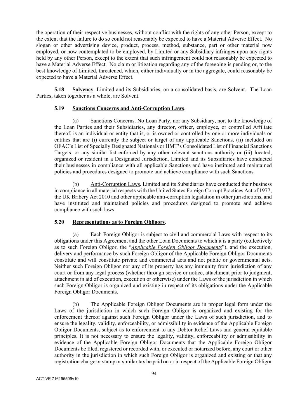 94 ACTIVE 716195509v10 the operation of their respective businesses, without conflict with the rights of any other Person, except to the extent that the failure to do so could not reasonably be expected to have a Material Adverse Effect. No slogan or other advertising device, product, process, method, substance, part or other material now employed, or now contemplated to be employed, by Limited or any Subsidiary infringes upon any rights held by any other Person, except to the extent that such infringement could not reasonably be expected to have a Material Adverse Effect. No claim or litigation regarding any of the foregoing is pending or, to the best knowledge of Limited, threatened, which, either individually or in the aggregate, could reasonably be expected to have a Material Adverse Effect. 5.18 Solvency. Limited and its Subsidiaries, on a consolidated basis, are Solvent. The Loan Parties, taken together as a whole, are Solvent. 5.19 Sanctions Concerns and Anti-Corruption Laws. (a) Sanctions Concerns. No Loan Party, nor any Subsidiary, nor, to the knowledge of the Loan Parties and their Subsidiaries, any director, officer, employee, or controlled Affiliate thereof, is an individual or entity that is, or is owned or controlled by one or more individuals or entities that are (i) currently the subject or target of any applicable Sanctions, (ii) included on OFAC’s List of Specially Designated Nationals or HMT’s Consolidated List of Financial Sanctions Targets, or any similar list enforced by any other relevant sanctions authority or (iii) located, organized or resident in a Designated Jurisdiction. Limited and its Subsidiaries have conducted their businesses in compliance with all applicable Sanctions and have instituted and maintained policies and procedures designed to promote and achieve compliance with such Sanctions. (b) Anti-Corruption Laws. Limited and its Subsidiaries have conducted their business in compliance in all material respects with the United States Foreign Corrupt Practices Act of 1977, the UK Bribery Act 2010 and other applicable anti-corruption legislation in other jurisdictions, and have instituted and maintained policies and procedures designed to promote and achieve compliance with such laws. 5.20 Representations as to Foreign Obligors. (a) Each Foreign Obligor is subject to civil and commercial Laws with respect to its obligations under this Agreement and the other Loan Documents to which it is a party (collectively as to such Foreign Obligor, the “Applicable Foreign Obligor Documents”), and the execution, delivery and performance by such Foreign Obligor of the Applicable Foreign Obligor Documents constitute and will constitute private and commercial acts and not public or governmental acts. Neither such Foreign Obligor nor any of its property has any immunity from jurisdiction of any court or from any legal process (whether through service or notice, attachment prior to judgment, attachment in aid of execution, execution or otherwise) under the Laws of the jurisdiction in which such Foreign Obligor is organized and existing in respect of its obligations under the Applicable Foreign Obligor Documents. (b) The Applicable Foreign Obligor Documents are in proper legal form under the Laws of the jurisdiction in which such Foreign Obligor is organized and existing for the enforcement thereof against such Foreign Obligor under the Laws of such jurisdiction, and to ensure the legality, validity, enforceability, or admissibility in evidence of the Applicable Foreign Obligor Documents, subject as to enforcement to any Debtor Relief Laws and general equitable principles. It is not necessary to ensure the legality, validity, enforceability or admissibility in evidence of the Applicable Foreign Obligor Documents that the Applicable Foreign Obligor Documents be filed, registered or recorded with, or executed or notarized before, any court or other authority in the jurisdiction in which such Foreign Obligor is organized and existing or that any registration charge or stamp or similar tax be paid on or in respect of the Applicable Foreign Obligor