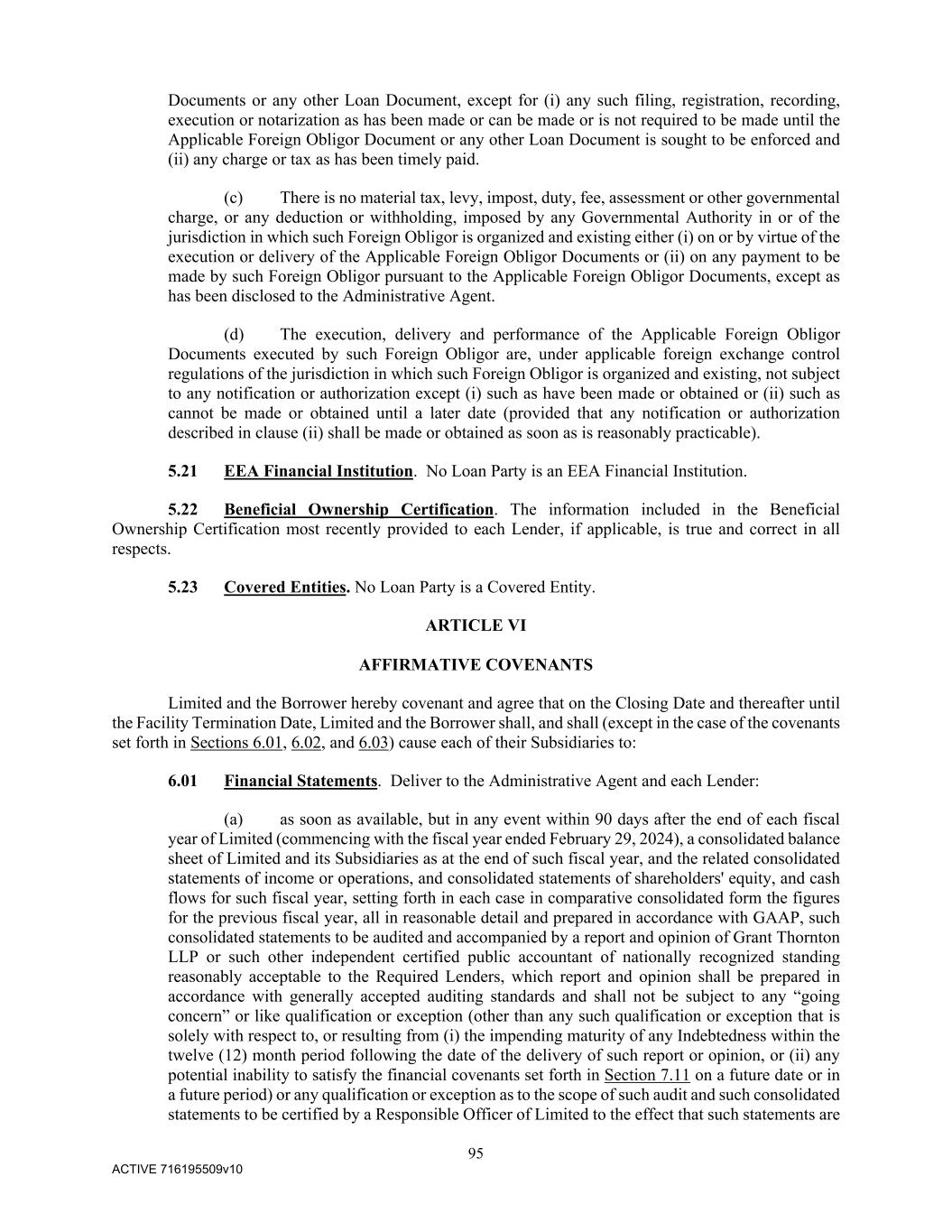 95 ACTIVE 716195509v10 Documents or any other Loan Document, except for (i) any such filing, registration, recording, execution or notarization as has been made or can be made or is not required to be made until the Applicable Foreign Obligor Document or any other Loan Document is sought to be enforced and (ii) any charge or tax as has been timely paid. (c) There is no material tax, levy, impost, duty, fee, assessment or other governmental charge, or any deduction or withholding, imposed by any Governmental Authority in or of the jurisdiction in which such Foreign Obligor is organized and existing either (i) on or by virtue of the execution or delivery of the Applicable Foreign Obligor Documents or (ii) on any payment to be made by such Foreign Obligor pursuant to the Applicable Foreign Obligor Documents, except as has been disclosed to the Administrative Agent. (d) The execution, delivery and performance of the Applicable Foreign Obligor Documents executed by such Foreign Obligor are, under applicable foreign exchange control regulations of the jurisdiction in which such Foreign Obligor is organized and existing, not subject to any notification or authorization except (i) such as have been made or obtained or (ii) such as cannot be made or obtained until a later date (provided that any notification or authorization described in clause (ii) shall be made or obtained as soon as is reasonably practicable). 5.21 EEA Financial Institution. No Loan Party is an EEA Financial Institution. 5.22 Beneficial Ownership Certification. The information included in the Beneficial Ownership Certification most recently provided to each Lender, if applicable, is true and correct in all respects. 5.23 Covered Entities. No Loan Party is a Covered Entity. ARTICLE VI AFFIRMATIVE COVENANTS Limited and the Borrower hereby covenant and agree that on the Closing Date and thereafter until the Facility Termination Date, Limited and the Borrower shall, and shall (except in the case of the covenants set forth in Sections 6.01, 6.02, and 6.03) cause each of their Subsidiaries to: 6.01 Financial Statements. Deliver to the Administrative Agent and each Lender: (a) as soon as available, but in any event within 90 days after the end of each fiscal year of Limited (commencing with the fiscal year ended February 29, 2024), a consolidated balance sheet of Limited and its Subsidiaries as at the end of such fiscal year, and the related consolidated statements of income or operations, and consolidated statements of shareholders' equity, and cash flows for such fiscal year, setting forth in each case in comparative consolidated form the figures for the previous fiscal year, all in reasonable detail and prepared in accordance with GAAP, such consolidated statements to be audited and accompanied by a report and opinion of Grant Thornton LLP or such other independent certified public accountant of nationally recognized standing reasonably acceptable to the Required Lenders, which report and opinion shall be prepared in accordance with generally accepted auditing standards and shall not be subject to any “going concern” or like qualification or exception (other than any such qualification or exception that is solely with respect to, or resulting from (i) the impending maturity of any Indebtedness within the twelve (12) month period following the date of the delivery of such report or opinion, or (ii) any potential inability to satisfy the financial covenants set forth in Section 7.11 on a future date or in a future period) or any qualification or exception as to the scope of such audit and such consolidated statements to be certified by a Responsible Officer of Limited to the effect that such statements are