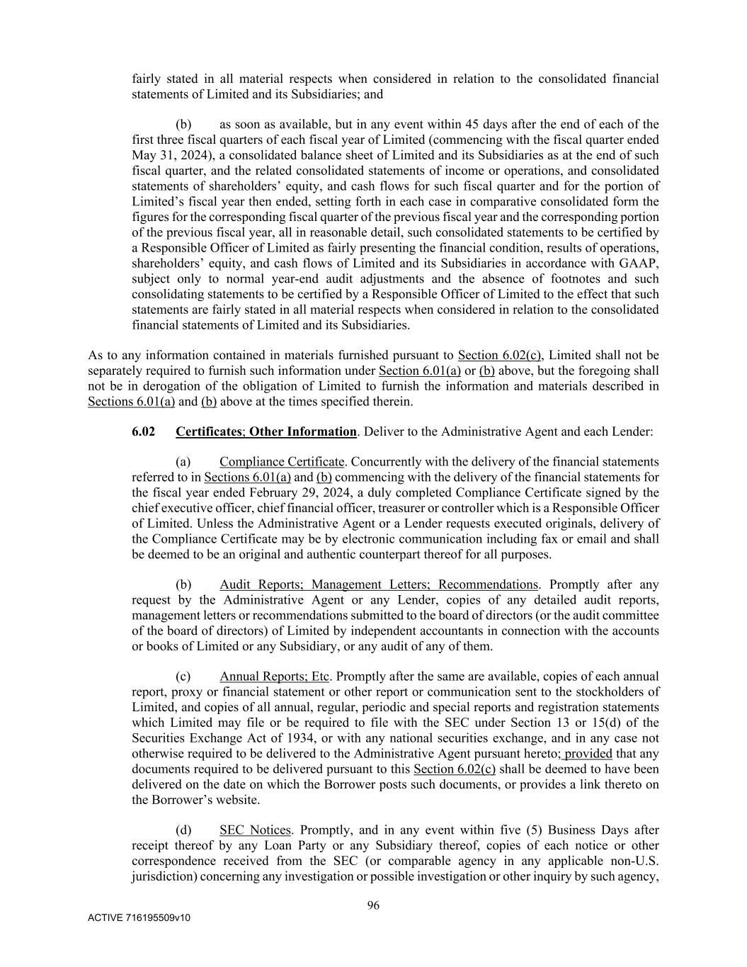 96 ACTIVE 716195509v10 fairly stated in all material respects when considered in relation to the consolidated financial statements of Limited and its Subsidiaries; and (b) as soon as available, but in any event within 45 days after the end of each of the first three fiscal quarters of each fiscal year of Limited (commencing with the fiscal quarter ended May 31, 2024), a consolidated balance sheet of Limited and its Subsidiaries as at the end of such fiscal quarter, and the related consolidated statements of income or operations, and consolidated statements of shareholders’ equity, and cash flows for such fiscal quarter and for the portion of Limited’s fiscal year then ended, setting forth in each case in comparative consolidated form the figures for the corresponding fiscal quarter of the previous fiscal year and the corresponding portion of the previous fiscal year, all in reasonable detail, such consolidated statements to be certified by a Responsible Officer of Limited as fairly presenting the financial condition, results of operations, shareholders’ equity, and cash flows of Limited and its Subsidiaries in accordance with GAAP, subject only to normal year-end audit adjustments and the absence of footnotes and such consolidating statements to be certified by a Responsible Officer of Limited to the effect that such statements are fairly stated in all material respects when considered in relation to the consolidated financial statements of Limited and its Subsidiaries. As to any information contained in materials furnished pursuant to Section 6.02(c), Limited shall not be separately required to furnish such information under Section 6.01(a) or (b) above, but the foregoing shall not be in derogation of the obligation of Limited to furnish the information and materials described in Sections 6.01(a) and (b) above at the times specified therein. 6.02 Certificates; Other Information. Deliver to the Administrative Agent and each Lender: (a) Compliance Certificate. Concurrently with the delivery of the financial statements referred to in Sections 6.01(a) and (b) commencing with the delivery of the financial statements for the fiscal year ended February 29, 2024, a duly completed Compliance Certificate signed by the chief executive officer, chief financial officer, treasurer or controller which is a Responsible Officer of Limited. Unless the Administrative Agent or a Lender requests executed originals, delivery of the Compliance Certificate may be by electronic communication including fax or email and shall be deemed to be an original and authentic counterpart thereof for all purposes. (b) Audit Reports; Management Letters; Recommendations. Promptly after any request by the Administrative Agent or any Lender, copies of any detailed audit reports, management letters or recommendations submitted to the board of directors (or the audit committee of the board of directors) of Limited by independent accountants in connection with the accounts or books of Limited or any Subsidiary, or any audit of any of them. (c) Annual Reports; Etc. Promptly after the same are available, copies of each annual report, proxy or financial statement or other report or communication sent to the stockholders of Limited, and copies of all annual, regular, periodic and special reports and registration statements which Limited may file or be required to file with the SEC under Section 13 or 15(d) of the Securities Exchange Act of 1934, or with any national securities exchange, and in any case not otherwise required to be delivered to the Administrative Agent pursuant hereto; provided that any documents required to be delivered pursuant to this Section 6.02(c) shall be deemed to have been delivered on the date on which the Borrower posts such documents, or provides a link thereto on the Borrower’s website. (d) SEC Notices. Promptly, and in any event within five (5) Business Days after receipt thereof by any Loan Party or any Subsidiary thereof, copies of each notice or other correspondence received from the SEC (or comparable agency in any applicable non-U.S. jurisdiction) concerning any investigation or possible investigation or other inquiry by such agency,