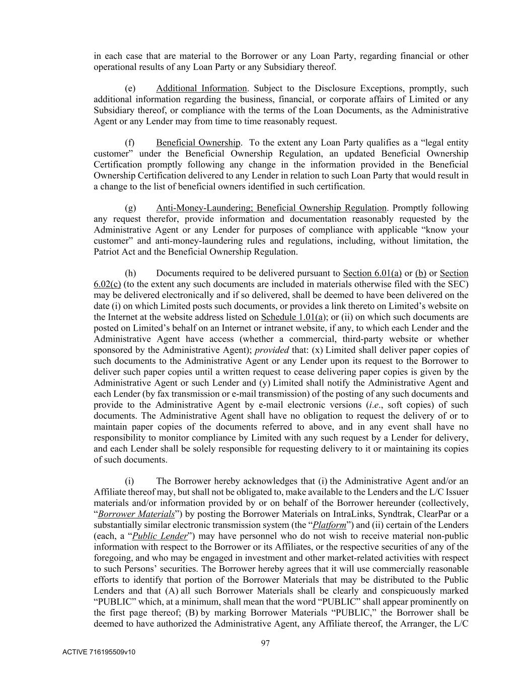 97 ACTIVE 716195509v10 in each case that are material to the Borrower or any Loan Party, regarding financial or other operational results of any Loan Party or any Subsidiary thereof. (e) Additional Information. Subject to the Disclosure Exceptions, promptly, such additional information regarding the business, financial, or corporate affairs of Limited or any Subsidiary thereof, or compliance with the terms of the Loan Documents, as the Administrative Agent or any Lender may from time to time reasonably request. (f) Beneficial Ownership. To the extent any Loan Party qualifies as a “legal entity customer” under the Beneficial Ownership Regulation, an updated Beneficial Ownership Certification promptly following any change in the information provided in the Beneficial Ownership Certification delivered to any Lender in relation to such Loan Party that would result in a change to the list of beneficial owners identified in such certification. (g) Anti-Money-Laundering; Beneficial Ownership Regulation. Promptly following any request therefor, provide information and documentation reasonably requested by the Administrative Agent or any Lender for purposes of compliance with applicable “know your customer” and anti-money-laundering rules and regulations, including, without limitation, the Patriot Act and the Beneficial Ownership Regulation. (h) Documents required to be delivered pursuant to Section 6.01(a) or (b) or Section 6.02(c) (to the extent any such documents are included in materials otherwise filed with the SEC) may be delivered electronically and if so delivered, shall be deemed to have been delivered on the date (i) on which Limited posts such documents, or provides a link thereto on Limited’s website on the Internet at the website address listed on Schedule 1.01(a); or (ii) on which such documents are posted on Limited’s behalf on an Internet or intranet website, if any, to which each Lender and the Administrative Agent have access (whether a commercial, third-party website or whether sponsored by the Administrative Agent); provided that: (x) Limited shall deliver paper copies of such documents to the Administrative Agent or any Lender upon its request to the Borrower to deliver such paper copies until a written request to cease delivering paper copies is given by the Administrative Agent or such Lender and (y) Limited shall notify the Administrative Agent and each Lender (by fax transmission or e-mail transmission) of the posting of any such documents and provide to the Administrative Agent by e-mail electronic versions (i.e., soft copies) of such documents. The Administrative Agent shall have no obligation to request the delivery of or to maintain paper copies of the documents referred to above, and in any event shall have no responsibility to monitor compliance by Limited with any such request by a Lender for delivery, and each Lender shall be solely responsible for requesting delivery to it or maintaining its copies of such documents. (i) The Borrower hereby acknowledges that (i) the Administrative Agent and/or an Affiliate thereof may, but shall not be obligated to, make available to the Lenders and the L/C Issuer materials and/or information provided by or on behalf of the Borrower hereunder (collectively, “Borrower Materials”) by posting the Borrower Materials on IntraLinks, Syndtrak, ClearPar or a substantially similar electronic transmission system (the “Platform”) and (ii) certain of the Lenders (each, a “Public Lender”) may have personnel who do not wish to receive material non-public information with respect to the Borrower or its Affiliates, or the respective securities of any of the foregoing, and who may be engaged in investment and other market-related activities with respect to such Persons’ securities. The Borrower hereby agrees that it will use commercially reasonable efforts to identify that portion of the Borrower Materials that may be distributed to the Public Lenders and that (A) all such Borrower Materials shall be clearly and conspicuously marked “PUBLIC” which, at a minimum, shall mean that the word “PUBLIC” shall appear prominently on the first page thereof; (B) by marking Borrower Materials “PUBLIC,” the Borrower shall be deemed to have authorized the Administrative Agent, any Affiliate thereof, the Arranger, the L/C