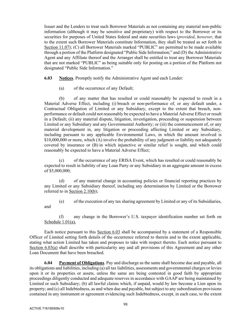 98 ACTIVE 716195509v10 Issuer and the Lenders to treat such Borrower Materials as not containing any material non-public information (although it may be sensitive and proprietary) with respect to the Borrower or its securities for purposes of United States federal and state securities laws (provided, however, that to the extent such Borrower Materials constitute Information, they shall be treated as set forth in Section 11.07); (C) all Borrower Materials marked “PUBLIC” are permitted to be made available through a portion of the Platform designated “Public Side Information;” and (D) the Administrative Agent and any Affiliate thereof and the Arranger shall be entitled to treat any Borrower Materials that are not marked “PUBLIC” as being suitable only for posting on a portion of the Platform not designated “Public Side Information.” 6.03 Notices. Promptly notify the Administrative Agent and each Lender: (a) of the occurrence of any Default; (b) of any matter that has resulted or could reasonably be expected to result in a Material Adverse Effect, including (i) breach or non-performance of, or any default under, a Contractual Obligation of Limited or any Subsidiary, except to the extent that breach, non- performance or default could not reasonably be expected to have a Material Adverse Effect or result in a Default; (ii) any material dispute, litigation, investigation, proceeding or suspension between Limited or any Subsidiary and any Governmental Authority; or (iii) the commencement of, or any material development in, any litigation or proceeding affecting Limited or any Subsidiary, including pursuant to any applicable Environmental Laws, in which the amount involved is $10,000,000 or more, which (A) involve the probability of any judgment or liability not adequately covered by insurance or (B) in which injunctive or similar relief is sought, and which could reasonably be expected to have a Material Adverse Effect; (c) of the occurrence of any ERISA Event, which has resulted or could reasonably be expected to result in liability of any Loan Party or any Subsidiary in an aggregate amount in excess of $5,000,000; (d) of any material change in accounting policies or financial reporting practices by any Limited or any Subsidiary thereof, including any determination by Limited or the Borrower referred to in Section 2.10(b); (e) of the execution of any tax sharing agreement by Limited or any of its Subsidiaries, and (f) any change in the Borrower’s U.S. taxpayer identification number set forth on Schedule 1.01(a). Each notice pursuant to this Section 6.03 shall be accompanied by a statement of a Responsible Officer of Limited setting forth details of the occurrence referred to therein and to the extent applicable, stating what action Limited has taken and proposes to take with respect thereto. Each notice pursuant to Section 6.03(a) shall describe with particularity any and all provisions of this Agreement and any other Loan Document that have been breached. 6.04 Payment of Obligations. Pay and discharge as the same shall become due and payable, all its obligations and liabilities, including (a) all tax liabilities, assessments and governmental charges or levies upon it or its properties or assets, unless the same are being contested in good faith by appropriate proceedings diligently conducted and adequate reserves in accordance with GAAP are being maintained by Limited or such Subsidiary; (b) all lawful claims which, if unpaid, would by law become a Lien upon its property; and (c) all Indebtedness, as and when due and payable, but subject to any subordination provisions contained in any instrument or agreement evidencing such Indebtedness, except, in each case, to the extent