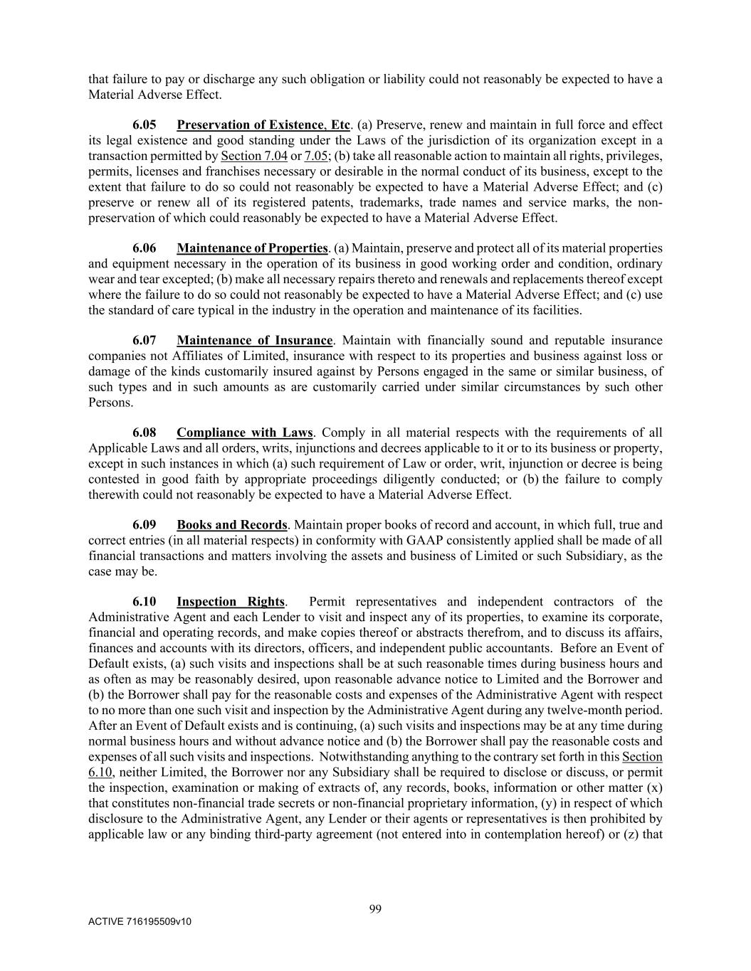 99 ACTIVE 716195509v10 that failure to pay or discharge any such obligation or liability could not reasonably be expected to have a Material Adverse Effect. 6.05 Preservation of Existence, Etc. (a) Preserve, renew and maintain in full force and effect its legal existence and good standing under the Laws of the jurisdiction of its organization except in a transaction permitted by Section 7.04 or 7.05; (b) take all reasonable action to maintain all rights, privileges, permits, licenses and franchises necessary or desirable in the normal conduct of its business, except to the extent that failure to do so could not reasonably be expected to have a Material Adverse Effect; and (c) preserve or renew all of its registered patents, trademarks, trade names and service marks, the non- preservation of which could reasonably be expected to have a Material Adverse Effect. 6.06 Maintenance of Properties. (a) Maintain, preserve and protect all of its material properties and equipment necessary in the operation of its business in good working order and condition, ordinary wear and tear excepted; (b) make all necessary repairs thereto and renewals and replacements thereof except where the failure to do so could not reasonably be expected to have a Material Adverse Effect; and (c) use the standard of care typical in the industry in the operation and maintenance of its facilities. 6.07 Maintenance of Insurance. Maintain with financially sound and reputable insurance companies not Affiliates of Limited, insurance with respect to its properties and business against loss or damage of the kinds customarily insured against by Persons engaged in the same or similar business, of such types and in such amounts as are customarily carried under similar circumstances by such other Persons. 6.08 Compliance with Laws. Comply in all material respects with the requirements of all Applicable Laws and all orders, writs, injunctions and decrees applicable to it or to its business or property, except in such instances in which (a) such requirement of Law or order, writ, injunction or decree is being contested in good faith by appropriate proceedings diligently conducted; or (b) the failure to comply therewith could not reasonably be expected to have a Material Adverse Effect. 6.09 Books and Records. Maintain proper books of record and account, in which full, true and correct entries (in all material respects) in conformity with GAAP consistently applied shall be made of all financial transactions and matters involving the assets and business of Limited or such Subsidiary, as the case may be. 6.10 Inspection Rights. Permit representatives and independent contractors of the Administrative Agent and each Lender to visit and inspect any of its properties, to examine its corporate, financial and operating records, and make copies thereof or abstracts therefrom, and to discuss its affairs, finances and accounts with its directors, officers, and independent public accountants. Before an Event of Default exists, (a) such visits and inspections shall be at such reasonable times during business hours and as often as may be reasonably desired, upon reasonable advance notice to Limited and the Borrower and (b) the Borrower shall pay for the reasonable costs and expenses of the Administrative Agent with respect to no more than one such visit and inspection by the Administrative Agent during any twelve-month period. After an Event of Default exists and is continuing, (a) such visits and inspections may be at any time during normal business hours and without advance notice and (b) the Borrower shall pay the reasonable costs and expenses of all such visits and inspections. Notwithstanding anything to the contrary set forth in this Section 6.10, neither Limited, the Borrower nor any Subsidiary shall be required to disclose or discuss, or permit the inspection, examination or making of extracts of, any records, books, information or other matter (x) that constitutes non-financial trade secrets or non-financial proprietary information, (y) in respect of which disclosure to the Administrative Agent, any Lender or their agents or representatives is then prohibited by applicable law or any binding third-party agreement (not entered into in contemplation hereof) or (z) that