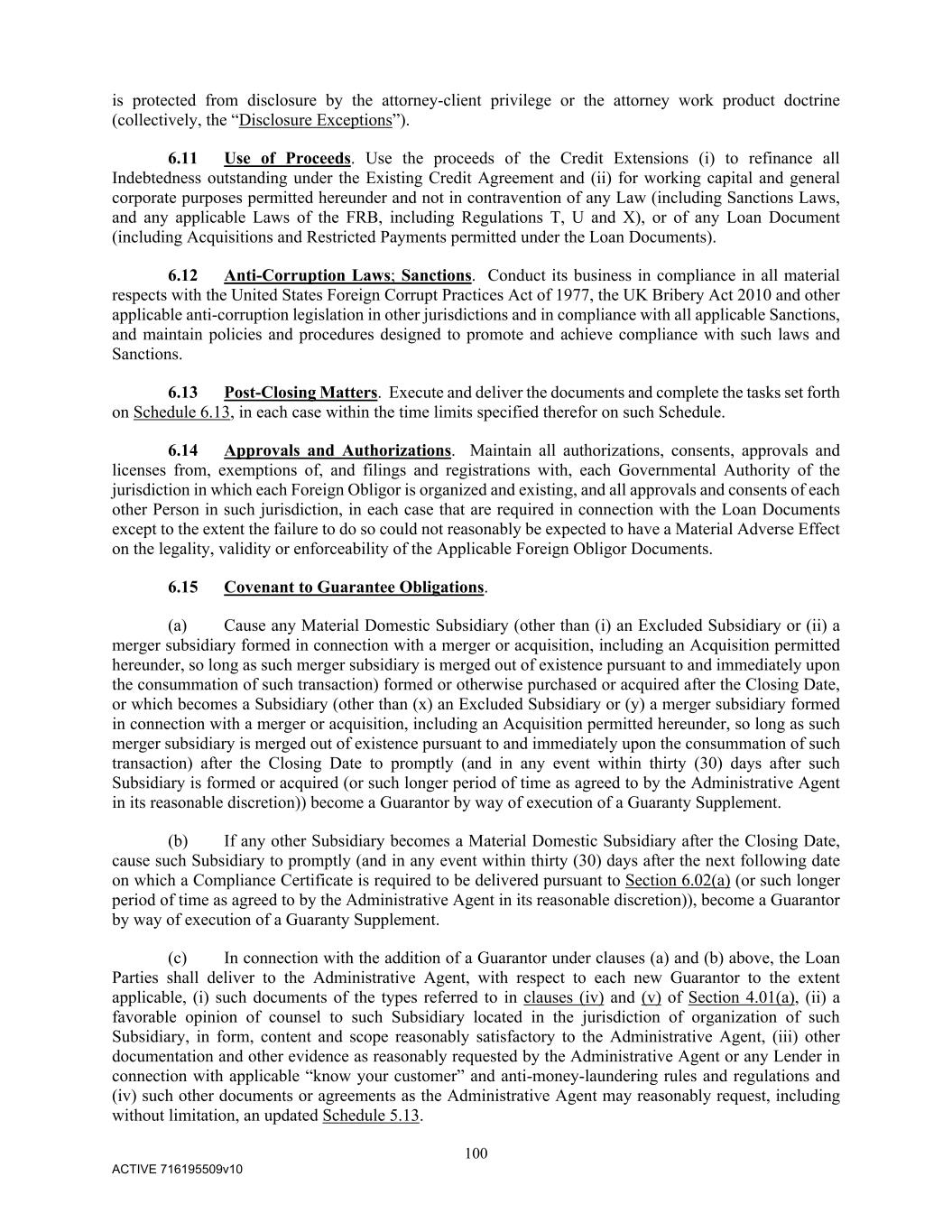 100 ACTIVE 716195509v10 is protected from disclosure by the attorney-client privilege or the attorney work product doctrine (collectively, the “Disclosure Exceptions”). 6.11 Use of Proceeds. Use the proceeds of the Credit Extensions (i) to refinance all Indebtedness outstanding under the Existing Credit Agreement and (ii) for working capital and general corporate purposes permitted hereunder and not in contravention of any Law (including Sanctions Laws, and any applicable Laws of the FRB, including Regulations T, U and X), or of any Loan Document (including Acquisitions and Restricted Payments permitted under the Loan Documents). 6.12 Anti-Corruption Laws; Sanctions. Conduct its business in compliance in all material respects with the United States Foreign Corrupt Practices Act of 1977, the UK Bribery Act 2010 and other applicable anti-corruption legislation in other jurisdictions and in compliance with all applicable Sanctions, and maintain policies and procedures designed to promote and achieve compliance with such laws and Sanctions. 6.13 Post-Closing Matters. Execute and deliver the documents and complete the tasks set forth on Schedule 6.13, in each case within the time limits specified therefor on such Schedule. 6.14 Approvals and Authorizations. Maintain all authorizations, consents, approvals and licenses from, exemptions of, and filings and registrations with, each Governmental Authority of the jurisdiction in which each Foreign Obligor is organized and existing, and all approvals and consents of each other Person in such jurisdiction, in each case that are required in connection with the Loan Documents except to the extent the failure to do so could not reasonably be expected to have a Material Adverse Effect on the legality, validity or enforceability of the Applicable Foreign Obligor Documents. 6.15 Covenant to Guarantee Obligations. (a) Cause any Material Domestic Subsidiary (other than (i) an Excluded Subsidiary or (ii) a merger subsidiary formed in connection with a merger or acquisition, including an Acquisition permitted hereunder, so long as such merger subsidiary is merged out of existence pursuant to and immediately upon the consummation of such transaction) formed or otherwise purchased or acquired after the Closing Date, or which becomes a Subsidiary (other than (x) an Excluded Subsidiary or (y) a merger subsidiary formed in connection with a merger or acquisition, including an Acquisition permitted hereunder, so long as such merger subsidiary is merged out of existence pursuant to and immediately upon the consummation of such transaction) after the Closing Date to promptly (and in any event within thirty (30) days after such Subsidiary is formed or acquired (or such longer period of time as agreed to by the Administrative Agent in its reasonable discretion)) become a Guarantor by way of execution of a Guaranty Supplement. (b) If any other Subsidiary becomes a Material Domestic Subsidiary after the Closing Date, cause such Subsidiary to promptly (and in any event within thirty (30) days after the next following date on which a Compliance Certificate is required to be delivered pursuant to Section 6.02(a) (or such longer period of time as agreed to by the Administrative Agent in its reasonable discretion)), become a Guarantor by way of execution of a Guaranty Supplement. (c) In connection with the addition of a Guarantor under clauses (a) and (b) above, the Loan Parties shall deliver to the Administrative Agent, with respect to each new Guarantor to the extent applicable, (i) such documents of the types referred to in clauses (iv) and (v) of Section 4.01(a), (ii) a favorable opinion of counsel to such Subsidiary located in the jurisdiction of organization of such Subsidiary, in form, content and scope reasonably satisfactory to the Administrative Agent, (iii) other documentation and other evidence as reasonably requested by the Administrative Agent or any Lender in connection with applicable “know your customer” and anti-money-laundering rules and regulations and (iv) such other documents or agreements as the Administrative Agent may reasonably request, including without limitation, an updated Schedule 5.13.