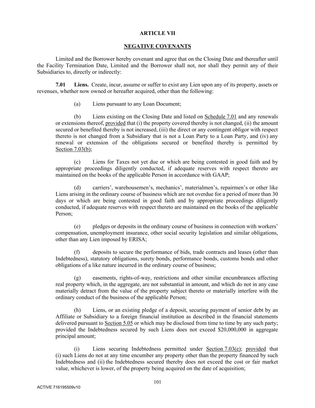 101 ACTIVE 716195509v10 ARTICLE VII NEGATIVE COVENANTS Limited and the Borrower hereby covenant and agree that on the Closing Date and thereafter until the Facility Termination Date, Limited and the Borrower shall not, nor shall they permit any of their Subsidiaries to, directly or indirectly: 7.01 Liens. Create, incur, assume or suffer to exist any Lien upon any of its property, assets or revenues, whether now owned or hereafter acquired, other than the following: (a) Liens pursuant to any Loan Document; (b) Liens existing on the Closing Date and listed on Schedule 7.01 and any renewals or extensions thereof, provided that (i) the property covered thereby is not changed, (ii) the amount secured or benefited thereby is not increased, (iii) the direct or any contingent obligor with respect thereto is not changed from a Subsidiary that is not a Loan Party to a Loan Party, and (iv) any renewal or extension of the obligations secured or benefited thereby is permitted by Section 7.03(b); (c) Liens for Taxes not yet due or which are being contested in good faith and by appropriate proceedings diligently conducted, if adequate reserves with respect thereto are maintained on the books of the applicable Person in accordance with GAAP; (d) carriers’, warehousemen’s, mechanics’, materialmen’s, repairmen’s or other like Liens arising in the ordinary course of business which are not overdue for a period of more than 30 days or which are being contested in good faith and by appropriate proceedings diligently conducted, if adequate reserves with respect thereto are maintained on the books of the applicable Person; (e) pledges or deposits in the ordinary course of business in connection with workers’ compensation, unemployment insurance, other social security legislation and similar obligations, other than any Lien imposed by ERISA; (f) deposits to secure the performance of bids, trade contracts and leases (other than Indebtedness), statutory obligations, surety bonds, performance bonds, customs bonds and other obligations of a like nature incurred in the ordinary course of business; (g) easements, rights-of-way, restrictions and other similar encumbrances affecting real property which, in the aggregate, are not substantial in amount, and which do not in any case materially detract from the value of the property subject thereto or materially interfere with the ordinary conduct of the business of the applicable Person; (h) Liens, or an existing pledge of a deposit, securing payment of senior debt by an Affiliate or Subsidiary to a foreign financial institution as described in the financial statements delivered pursuant to Section 5.05 or which may be disclosed from time to time by any such party; provided the Indebtedness secured by such Liens does not exceed $20,000,000 in aggregate principal amount; (i) Liens securing Indebtedness permitted under Section 7.03(e); provided that (i) such Liens do not at any time encumber any property other than the property financed by such Indebtedness and (ii) the Indebtedness secured thereby does not exceed the cost or fair market value, whichever is lower, of the property being acquired on the date of acquisition;
