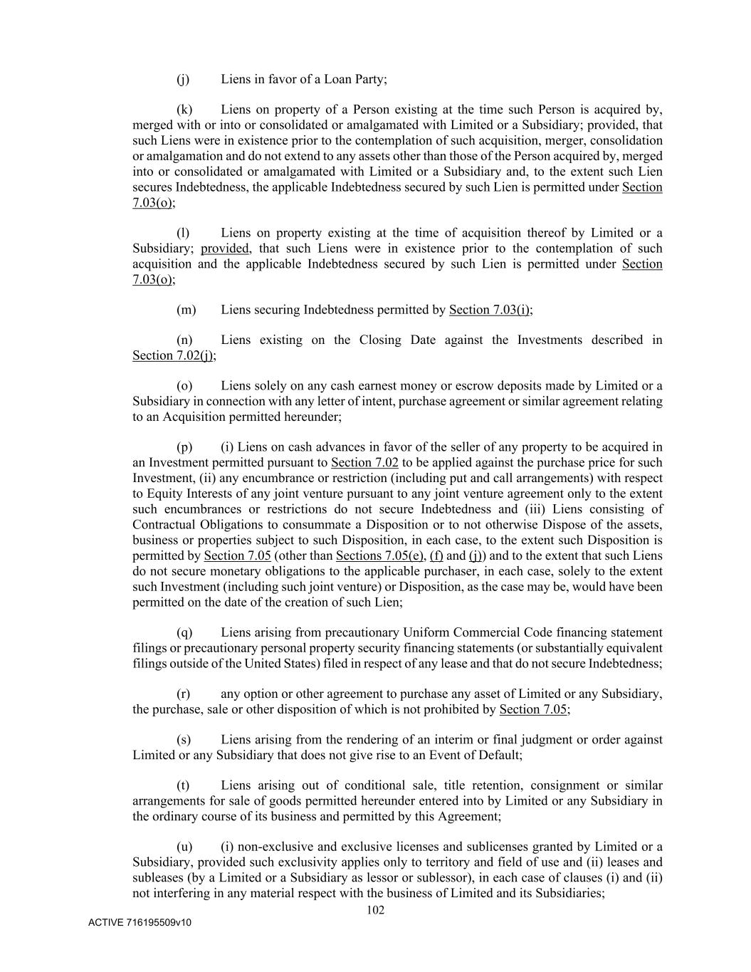 102 ACTIVE 716195509v10 (j) Liens in favor of a Loan Party; (k) Liens on property of a Person existing at the time such Person is acquired by, merged with or into or consolidated or amalgamated with Limited or a Subsidiary; provided, that such Liens were in existence prior to the contemplation of such acquisition, merger, consolidation or amalgamation and do not extend to any assets other than those of the Person acquired by, merged into or consolidated or amalgamated with Limited or a Subsidiary and, to the extent such Lien secures Indebtedness, the applicable Indebtedness secured by such Lien is permitted under Section 7.03(o); (l) Liens on property existing at the time of acquisition thereof by Limited or a Subsidiary; provided, that such Liens were in existence prior to the contemplation of such acquisition and the applicable Indebtedness secured by such Lien is permitted under Section 7.03(o); (m) Liens securing Indebtedness permitted by Section 7.03(i); (n) Liens existing on the Closing Date against the Investments described in Section 7.02(j); (o) Liens solely on any cash earnest money or escrow deposits made by Limited or a Subsidiary in connection with any letter of intent, purchase agreement or similar agreement relating to an Acquisition permitted hereunder; (p) (i) Liens on cash advances in favor of the seller of any property to be acquired in an Investment permitted pursuant to Section 7.02 to be applied against the purchase price for such Investment, (ii) any encumbrance or restriction (including put and call arrangements) with respect to Equity Interests of any joint venture pursuant to any joint venture agreement only to the extent such encumbrances or restrictions do not secure Indebtedness and (iii) Liens consisting of Contractual Obligations to consummate a Disposition or to not otherwise Dispose of the assets, business or properties subject to such Disposition, in each case, to the extent such Disposition is permitted by Section 7.05 (other than Sections 7.05(e), (f) and (j)) and to the extent that such Liens do not secure monetary obligations to the applicable purchaser, in each case, solely to the extent such Investment (including such joint venture) or Disposition, as the case may be, would have been permitted on the date of the creation of such Lien; (q) Liens arising from precautionary Uniform Commercial Code financing statement filings or precautionary personal property security financing statements (or substantially equivalent filings outside of the United States) filed in respect of any lease and that do not secure Indebtedness; (r) any option or other agreement to purchase any asset of Limited or any Subsidiary, the purchase, sale or other disposition of which is not prohibited by Section 7.05; (s) Liens arising from the rendering of an interim or final judgment or order against Limited or any Subsidiary that does not give rise to an Event of Default; (t) Liens arising out of conditional sale, title retention, consignment or similar arrangements for sale of goods permitted hereunder entered into by Limited or any Subsidiary in the ordinary course of its business and permitted by this Agreement; (u) (i) non-exclusive and exclusive licenses and sublicenses granted by Limited or a Subsidiary, provided such exclusivity applies only to territory and field of use and (ii) leases and subleases (by a Limited or a Subsidiary as lessor or sublessor), in each case of clauses (i) and (ii) not interfering in any material respect with the business of Limited and its Subsidiaries;