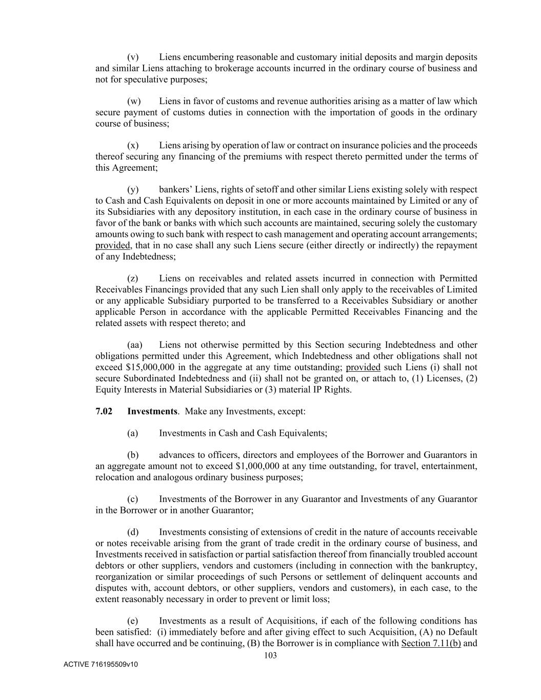 103 ACTIVE 716195509v10 (v) Liens encumbering reasonable and customary initial deposits and margin deposits and similar Liens attaching to brokerage accounts incurred in the ordinary course of business and not for speculative purposes; (w) Liens in favor of customs and revenue authorities arising as a matter of law which secure payment of customs duties in connection with the importation of goods in the ordinary course of business; (x) Liens arising by operation of law or contract on insurance policies and the proceeds thereof securing any financing of the premiums with respect thereto permitted under the terms of this Agreement; (y) bankers’ Liens, rights of setoff and other similar Liens existing solely with respect to Cash and Cash Equivalents on deposit in one or more accounts maintained by Limited or any of its Subsidiaries with any depository institution, in each case in the ordinary course of business in favor of the bank or banks with which such accounts are maintained, securing solely the customary amounts owing to such bank with respect to cash management and operating account arrangements; provided, that in no case shall any such Liens secure (either directly or indirectly) the repayment of any Indebtedness; (z) Liens on receivables and related assets incurred in connection with Permitted Receivables Financings provided that any such Lien shall only apply to the receivables of Limited or any applicable Subsidiary purported to be transferred to a Receivables Subsidiary or another applicable Person in accordance with the applicable Permitted Receivables Financing and the related assets with respect thereto; and (aa) Liens not otherwise permitted by this Section securing Indebtedness and other obligations permitted under this Agreement, which Indebtedness and other obligations shall not exceed $15,000,000 in the aggregate at any time outstanding; provided such Liens (i) shall not secure Subordinated Indebtedness and (ii) shall not be granted on, or attach to, (1) Licenses, (2) Equity Interests in Material Subsidiaries or (3) material IP Rights. 7.02 Investments. Make any Investments, except: (a) Investments in Cash and Cash Equivalents; (b) advances to officers, directors and employees of the Borrower and Guarantors in an aggregate amount not to exceed $1,000,000 at any time outstanding, for travel, entertainment, relocation and analogous ordinary business purposes; (c) Investments of the Borrower in any Guarantor and Investments of any Guarantor in the Borrower or in another Guarantor; (d) Investments consisting of extensions of credit in the nature of accounts receivable or notes receivable arising from the grant of trade credit in the ordinary course of business, and Investments received in satisfaction or partial satisfaction thereof from financially troubled account debtors or other suppliers, vendors and customers (including in connection with the bankruptcy, reorganization or similar proceedings of such Persons or settlement of delinquent accounts and disputes with, account debtors, or other suppliers, vendors and customers), in each case, to the extent reasonably necessary in order to prevent or limit loss; (e) Investments as a result of Acquisitions, if each of the following conditions has been satisfied: (i) immediately before and after giving effect to such Acquisition, (A) no Default shall have occurred and be continuing, (B) the Borrower is in compliance with Section 7.11(b) and