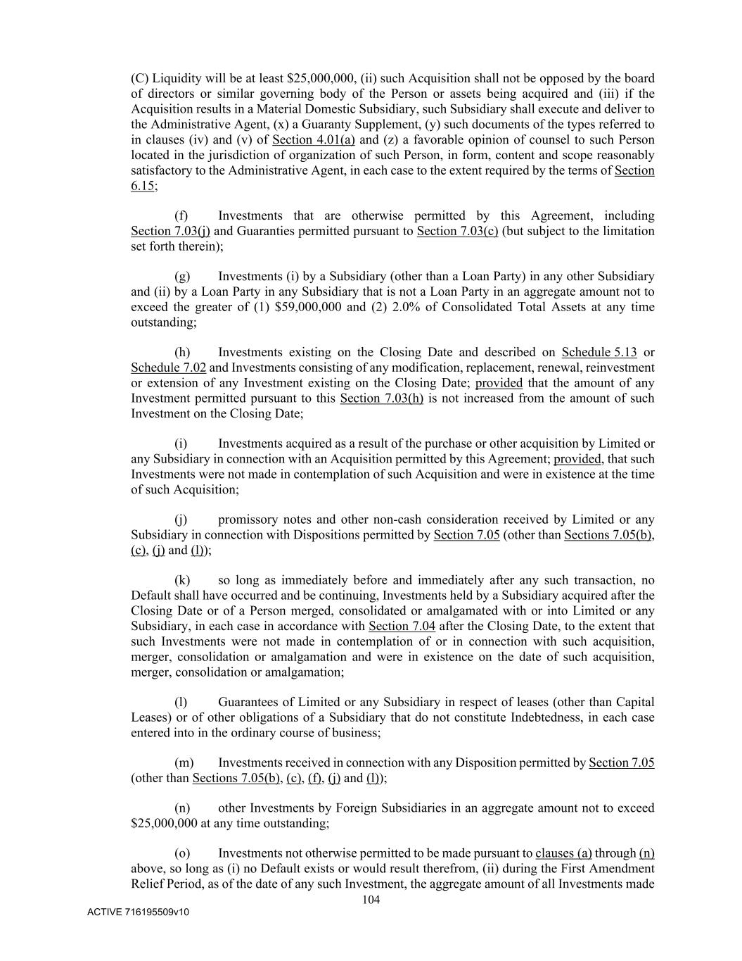 104 ACTIVE 716195509v10 (C) Liquidity will be at least $25,000,000, (ii) such Acquisition shall not be opposed by the board of directors or similar governing body of the Person or assets being acquired and (iii) if the Acquisition results in a Material Domestic Subsidiary, such Subsidiary shall execute and deliver to the Administrative Agent, (x) a Guaranty Supplement, (y) such documents of the types referred to in clauses (iv) and (v) of Section 4.01(a) and (z) a favorable opinion of counsel to such Person located in the jurisdiction of organization of such Person, in form, content and scope reasonably satisfactory to the Administrative Agent, in each case to the extent required by the terms of Section 6.15; (f) Investments that are otherwise permitted by this Agreement, including Section 7.03(j) and Guaranties permitted pursuant to Section 7.03(c) (but subject to the limitation set forth therein); (g) Investments (i) by a Subsidiary (other than a Loan Party) in any other Subsidiary and (ii) by a Loan Party in any Subsidiary that is not a Loan Party in an aggregate amount not to exceed the greater of (1) $59,000,000 and (2) 2.0% of Consolidated Total Assets at any time outstanding; (h) Investments existing on the Closing Date and described on Schedule 5.13 or Schedule 7.02 and Investments consisting of any modification, replacement, renewal, reinvestment or extension of any Investment existing on the Closing Date; provided that the amount of any Investment permitted pursuant to this Section 7.03(h) is not increased from the amount of such Investment on the Closing Date; (i) Investments acquired as a result of the purchase or other acquisition by Limited or any Subsidiary in connection with an Acquisition permitted by this Agreement; provided, that such Investments were not made in contemplation of such Acquisition and were in existence at the time of such Acquisition; (j) promissory notes and other non-cash consideration received by Limited or any Subsidiary in connection with Dispositions permitted by Section 7.05 (other than Sections 7.05(b), (c), (j) and (l)); (k) so long as immediately before and immediately after any such transaction, no Default shall have occurred and be continuing, Investments held by a Subsidiary acquired after the Closing Date or of a Person merged, consolidated or amalgamated with or into Limited or any Subsidiary, in each case in accordance with Section 7.04 after the Closing Date, to the extent that such Investments were not made in contemplation of or in connection with such acquisition, merger, consolidation or amalgamation and were in existence on the date of such acquisition, merger, consolidation or amalgamation; (l) Guarantees of Limited or any Subsidiary in respect of leases (other than Capital Leases) or of other obligations of a Subsidiary that do not constitute Indebtedness, in each case entered into in the ordinary course of business; (m) Investments received in connection with any Disposition permitted by Section 7.05 (other than Sections 7.05(b), (c), (f), (j) and (l)); (n) other Investments by Foreign Subsidiaries in an aggregate amount not to exceed $25,000,000 at any time outstanding; (o) Investments not otherwise permitted to be made pursuant to clauses (a) through (n) above, so long as (i) no Default exists or would result therefrom, (ii) during the First Amendment Relief Period, as of the date of any such Investment, the aggregate amount of all Investments made