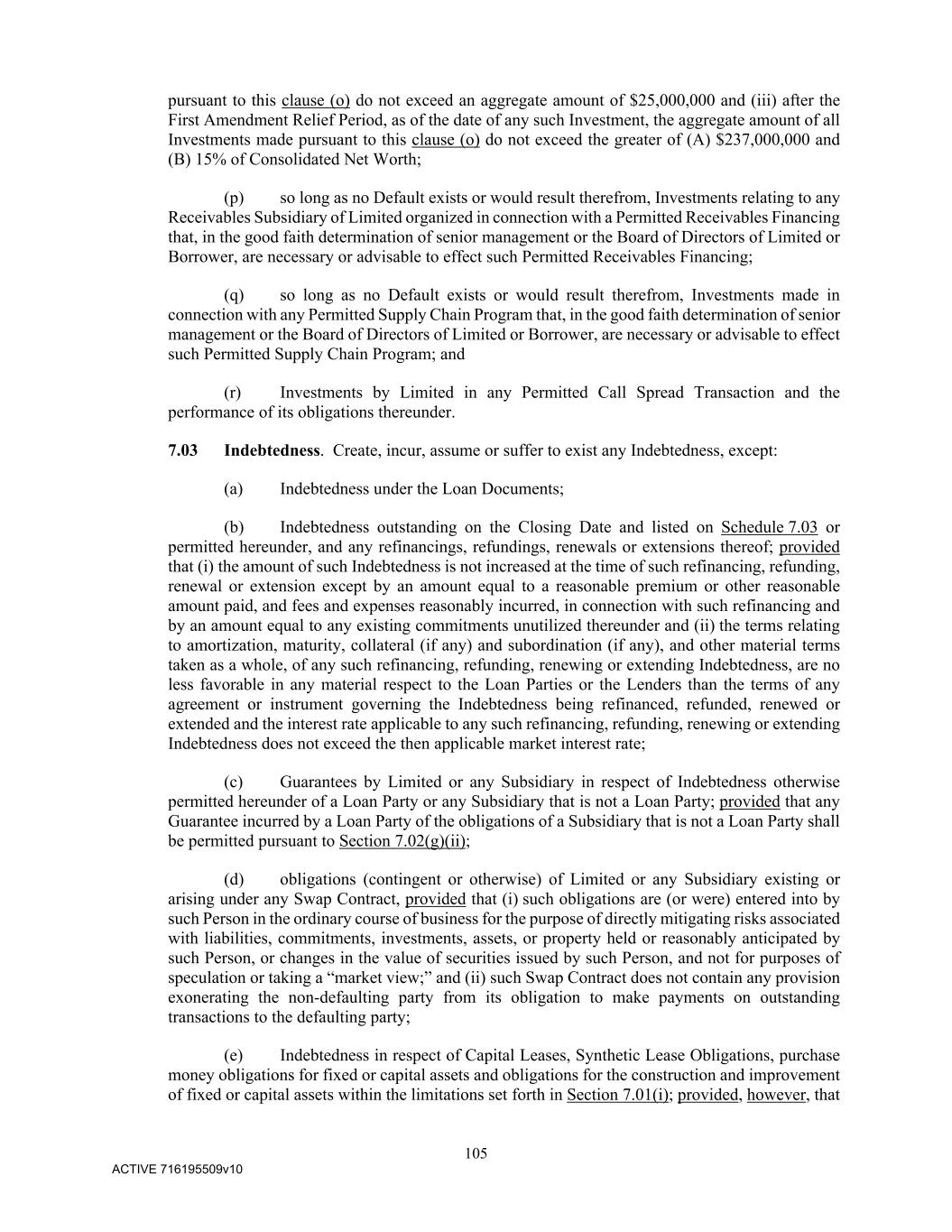 105 ACTIVE 716195509v10 pursuant to this clause (o) do not exceed an aggregate amount of $25,000,000 and (iii) after the First Amendment Relief Period, as of the date of any such Investment, the aggregate amount of all Investments made pursuant to this clause (o) do not exceed the greater of (A) $237,000,000 and (B) 15% of Consolidated Net Worth; (p) so long as no Default exists or would result therefrom, Investments relating to any Receivables Subsidiary of Limited organized in connection with a Permitted Receivables Financing that, in the good faith determination of senior management or the Board of Directors of Limited or Borrower, are necessary or advisable to effect such Permitted Receivables Financing; (q) so long as no Default exists or would result therefrom, Investments made in connection with any Permitted Supply Chain Program that, in the good faith determination of senior management or the Board of Directors of Limited or Borrower, are necessary or advisable to effect such Permitted Supply Chain Program; and (r) Investments by Limited in any Permitted Call Spread Transaction and the performance of its obligations thereunder. 7.03 Indebtedness. Create, incur, assume or suffer to exist any Indebtedness, except: (a) Indebtedness under the Loan Documents; (b) Indebtedness outstanding on the Closing Date and listed on Schedule 7.03 or permitted hereunder, and any refinancings, refundings, renewals or extensions thereof; provided that (i) the amount of such Indebtedness is not increased at the time of such refinancing, refunding, renewal or extension except by an amount equal to a reasonable premium or other reasonable amount paid, and fees and expenses reasonably incurred, in connection with such refinancing and by an amount equal to any existing commitments unutilized thereunder and (ii) the terms relating to amortization, maturity, collateral (if any) and subordination (if any), and other material terms taken as a whole, of any such refinancing, refunding, renewing or extending Indebtedness, are no less favorable in any material respect to the Loan Parties or the Lenders than the terms of any agreement or instrument governing the Indebtedness being refinanced, refunded, renewed or extended and the interest rate applicable to any such refinancing, refunding, renewing or extending Indebtedness does not exceed the then applicable market interest rate; (c) Guarantees by Limited or any Subsidiary in respect of Indebtedness otherwise permitted hereunder of a Loan Party or any Subsidiary that is not a Loan Party; provided that any Guarantee incurred by a Loan Party of the obligations of a Subsidiary that is not a Loan Party shall be permitted pursuant to Section 7.02(g)(ii); (d) obligations (contingent or otherwise) of Limited or any Subsidiary existing or arising under any Swap Contract, provided that (i) such obligations are (or were) entered into by such Person in the ordinary course of business for the purpose of directly mitigating risks associated with liabilities, commitments, investments, assets, or property held or reasonably anticipated by such Person, or changes in the value of securities issued by such Person, and not for purposes of speculation or taking a “market view;” and (ii) such Swap Contract does not contain any provision exonerating the non-defaulting party from its obligation to make payments on outstanding transactions to the defaulting party; (e) Indebtedness in respect of Capital Leases, Synthetic Lease Obligations, purchase money obligations for fixed or capital assets and obligations for the construction and improvement of fixed or capital assets within the limitations set forth in Section 7.01(i); provided, however, that