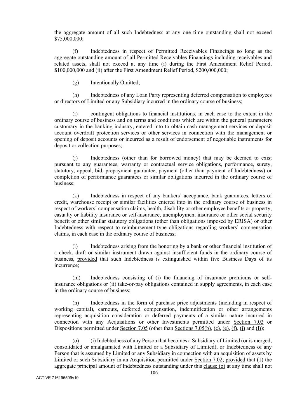106 ACTIVE 716195509v10 the aggregate amount of all such Indebtedness at any one time outstanding shall not exceed $75,000,000; (f) Indebtedness in respect of Permitted Receivables Financings so long as the aggregate outstanding amount of all Permitted Receivables Financings including receivables and related assets, shall not exceed at any time (i) during the First Amendment Relief Period, $100,000,000 and (ii) after the First Amendment Relief Period, $200,000,000; (g) Intentionally Omitted; (h) Indebtedness of any Loan Party representing deferred compensation to employees or directors of Limited or any Subsidiary incurred in the ordinary course of business; (i) contingent obligations to financial institutions, in each case to the extent in the ordinary course of business and on terms and conditions which are within the general parameters customary in the banking industry, entered into to obtain cash management services or deposit account overdraft protection services or other services in connection with the management or opening of deposit accounts or incurred as a result of endorsement of negotiable instruments for deposit or collection purposes; (j) Indebtedness (other than for borrowed money) that may be deemed to exist pursuant to any guarantees, warranty or contractual service obligations, performance, surety, statutory, appeal, bid, prepayment guarantee, payment (other than payment of Indebtedness) or completion of performance guarantees or similar obligations incurred in the ordinary course of business; (k) Indebtedness in respect of any bankers’ acceptance, bank guarantees, letters of credit, warehouse receipt or similar facilities entered into in the ordinary course of business in respect of workers’ compensation claims, health, disability or other employee benefits or property, casualty or liability insurance or self-insurance, unemployment insurance or other social security benefit or other similar statutory obligations (other than obligations imposed by ERISA) or other Indebtedness with respect to reimbursement-type obligations regarding workers’ compensation claims, in each case in the ordinary course of business; (l) Indebtedness arising from the honoring by a bank or other financial institution of a check, draft or similar instrument drawn against insufficient funds in the ordinary course of business, provided that such Indebtedness is extinguished within five Business Days of its incurrence; (m) Indebtedness consisting of (i) the financing of insurance premiums or self- insurance obligations or (ii) take-or-pay obligations contained in supply agreements, in each case in the ordinary course of business; (n) Indebtedness in the form of purchase price adjustments (including in respect of working capital), earnouts, deferred compensation, indemnification or other arrangements representing acquisition consideration or deferred payments of a similar nature incurred in connection with any Acquisitions or other Investments permitted under Section 7.02 or Dispositions permitted under Section 7.05 (other than Sections 7.05(b), (c), (e), (f), (j) and (l)); (o) (i) Indebtedness of any Person that becomes a Subsidiary of Limited (or is merged, consolidated or amalgamated with Limited or a Subsidiary of Limited), or Indebtedness of any Person that is assumed by Limited or any Subsidiary in connection with an acquisition of assets by Limited or such Subsidiary in an Acquisition permitted under Section 7.02; provided that (1) the aggregate principal amount of Indebtedness outstanding under this clause (o) at any time shall not