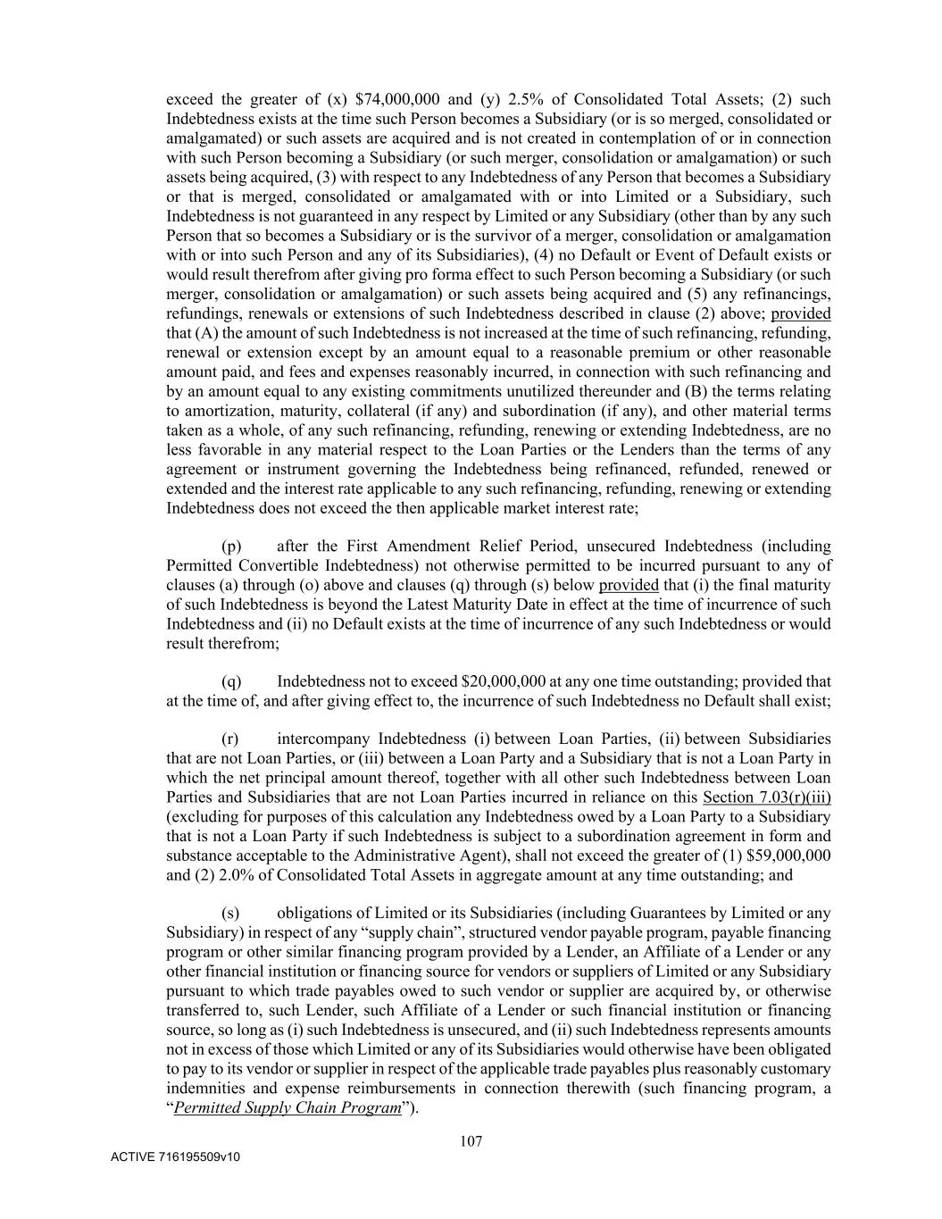 107 ACTIVE 716195509v10 exceed the greater of (x) $74,000,000 and (y) 2.5% of Consolidated Total Assets; (2) such Indebtedness exists at the time such Person becomes a Subsidiary (or is so merged, consolidated or amalgamated) or such assets are acquired and is not created in contemplation of or in connection with such Person becoming a Subsidiary (or such merger, consolidation or amalgamation) or such assets being acquired, (3) with respect to any Indebtedness of any Person that becomes a Subsidiary or that is merged, consolidated or amalgamated with or into Limited or a Subsidiary, such Indebtedness is not guaranteed in any respect by Limited or any Subsidiary (other than by any such Person that so becomes a Subsidiary or is the survivor of a merger, consolidation or amalgamation with or into such Person and any of its Subsidiaries), (4) no Default or Event of Default exists or would result therefrom after giving pro forma effect to such Person becoming a Subsidiary (or such merger, consolidation or amalgamation) or such assets being acquired and (5) any refinancings, refundings, renewals or extensions of such Indebtedness described in clause (2) above; provided that (A) the amount of such Indebtedness is not increased at the time of such refinancing, refunding, renewal or extension except by an amount equal to a reasonable premium or other reasonable amount paid, and fees and expenses reasonably incurred, in connection with such refinancing and by an amount equal to any existing commitments unutilized thereunder and (B) the terms relating to amortization, maturity, collateral (if any) and subordination (if any), and other material terms taken as a whole, of any such refinancing, refunding, renewing or extending Indebtedness, are no less favorable in any material respect to the Loan Parties or the Lenders than the terms of any agreement or instrument governing the Indebtedness being refinanced, refunded, renewed or extended and the interest rate applicable to any such refinancing, refunding, renewing or extending Indebtedness does not exceed the then applicable market interest rate; (p) after the First Amendment Relief Period, unsecured Indebtedness (including Permitted Convertible Indebtedness) not otherwise permitted to be incurred pursuant to any of clauses (a) through (o) above and clauses (q) through (s) below provided that (i) the final maturity of such Indebtedness is beyond the Latest Maturity Date in effect at the time of incurrence of such Indebtedness and (ii) no Default exists at the time of incurrence of any such Indebtedness or would result therefrom; (q) Indebtedness not to exceed $20,000,000 at any one time outstanding; provided that at the time of, and after giving effect to, the incurrence of such Indebtedness no Default shall exist; (r) intercompany Indebtedness (i) between Loan Parties, (ii) between Subsidiaries that are not Loan Parties, or (iii) between a Loan Party and a Subsidiary that is not a Loan Party in which the net principal amount thereof, together with all other such Indebtedness between Loan Parties and Subsidiaries that are not Loan Parties incurred in reliance on this Section 7.03(r)(iii) (excluding for purposes of this calculation any Indebtedness owed by a Loan Party to a Subsidiary that is not a Loan Party if such Indebtedness is subject to a subordination agreement in form and substance acceptable to the Administrative Agent), shall not exceed the greater of (1) $59,000,000 and (2) 2.0% of Consolidated Total Assets in aggregate amount at any time outstanding; and (s) obligations of Limited or its Subsidiaries (including Guarantees by Limited or any Subsidiary) in respect of any “supply chain”, structured vendor payable program, payable financing program or other similar financing program provided by a Lender, an Affiliate of a Lender or any other financial institution or financing source for vendors or suppliers of Limited or any Subsidiary pursuant to which trade payables owed to such vendor or supplier are acquired by, or otherwise transferred to, such Lender, such Affiliate of a Lender or such financial institution or financing source, so long as (i) such Indebtedness is unsecured, and (ii) such Indebtedness represents amounts not in excess of those which Limited or any of its Subsidiaries would otherwise have been obligated to pay to its vendor or supplier in respect of the applicable trade payables plus reasonably customary indemnities and expense reimbursements in connection therewith (such financing program, a “Permitted Supply Chain Program”).
