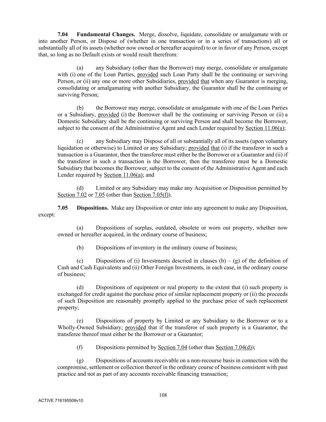 108 ACTIVE 716195509v10 7.04 Fundamental Changes. Merge, dissolve, liquidate, consolidate or amalgamate with or into another Person, or Dispose of (whether in one transaction or in a series of transactions) all or substantially all of its assets (whether now owned or hereafter acquired) to or in favor of any Person, except that, so long as no Default exists or would result therefrom: (a) any Subsidiary (other than the Borrower) may merge, consolidate or amalgamate with (i) one of the Loan Parties, provided such Loan Party shall be the continuing or surviving Person, or (ii) any one or more other Subsidiaries, provided that when any Guarantor is merging, consolidating or amalgamating with another Subsidiary, the Guarantor shall be the continuing or surviving Person; (b) the Borrower may merge, consolidate or amalgamate with one of the Loan Parties or a Subsidiary, provided (i) the Borrower shall be the continuing or surviving Person or (ii) a Domestic Subsidiary shall be the continuing or surviving Person and shall become the Borrower, subject to the consent of the Administrative Agent and each Lender required by Section 11.06(a); (c) any Subsidiary may Dispose of all or substantially all of its assets (upon voluntary liquidation or otherwise) to Limited or any Subsidiary; provided that (i) if the transferor in such a transaction is a Guarantor, then the transferee must either be the Borrower or a Guarantor and (ii) if the transferor in such a transaction is the Borrower, then the transferee must be a Domestic Subsidiary that becomes the Borrower, subject to the consent of the Administrative Agent and each Lender required by Section 11.06(a); and (d) Limited or any Subsidiary may make any Acquisition or Disposition permitted by Section 7.02 or 7.05 (other than Section 7.05(f)). 7.05 Dispositions. Make any Disposition or enter into any agreement to make any Disposition, except: (a) Dispositions of surplus, outdated, obsolete or worn out property, whether now owned or hereafter acquired, in the ordinary course of business; (b) Dispositions of inventory in the ordinary course of business; (c) Dispositions of (i) Investments descried in clauses (b) – (g) of the definition of Cash and Cash Equivalents and (ii) Other Foreign Investments, in each case, in the ordinary course of business; (d) Dispositions of equipment or real property to the extent that (i) such property is exchanged for credit against the purchase price of similar replacement property or (ii) the proceeds of such Disposition are reasonably promptly applied to the purchase price of such replacement property; (e) Dispositions of property by Limited or any Subsidiary to the Borrower or to a Wholly-Owned Subsidiary; provided that if the transferor of such property is a Guarantor, the transferee thereof must either be the Borrower or a Guarantor; (f) Dispositions permitted by Section 7.04 (other than Section 7.04(d)); (g) Dispositions of accounts receivable on a non-recourse basis in connection with the compromise, settlement or collection thereof in the ordinary course of business consistent with past practice and not as part of any accounts receivable financing transaction;