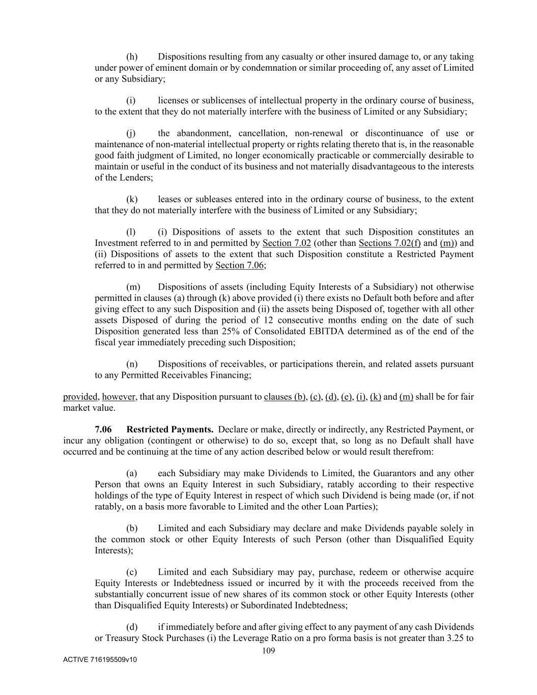 109 ACTIVE 716195509v10 (h) Dispositions resulting from any casualty or other insured damage to, or any taking under power of eminent domain or by condemnation or similar proceeding of, any asset of Limited or any Subsidiary; (i) licenses or sublicenses of intellectual property in the ordinary course of business, to the extent that they do not materially interfere with the business of Limited or any Subsidiary; (j) the abandonment, cancellation, non-renewal or discontinuance of use or maintenance of non-material intellectual property or rights relating thereto that is, in the reasonable good faith judgment of Limited, no longer economically practicable or commercially desirable to maintain or useful in the conduct of its business and not materially disadvantageous to the interests of the Lenders; (k) leases or subleases entered into in the ordinary course of business, to the extent that they do not materially interfere with the business of Limited or any Subsidiary; (l) (i) Dispositions of assets to the extent that such Disposition constitutes an Investment referred to in and permitted by Section 7.02 (other than Sections 7.02(f) and (m)) and (ii) Dispositions of assets to the extent that such Disposition constitute a Restricted Payment referred to in and permitted by Section 7.06; (m) Dispositions of assets (including Equity Interests of a Subsidiary) not otherwise permitted in clauses (a) through (k) above provided (i) there exists no Default both before and after giving effect to any such Disposition and (ii) the assets being Disposed of, together with all other assets Disposed of during the period of 12 consecutive months ending on the date of such Disposition generated less than 25% of Consolidated EBITDA determined as of the end of the fiscal year immediately preceding such Disposition; (n) Dispositions of receivables, or participations therein, and related assets pursuant to any Permitted Receivables Financing; provided, however, that any Disposition pursuant to clauses (b), (c), (d), (e), (i), (k) and (m) shall be for fair market value. 7.06 Restricted Payments. Declare or make, directly or indirectly, any Restricted Payment, or incur any obligation (contingent or otherwise) to do so, except that, so long as no Default shall have occurred and be continuing at the time of any action described below or would result therefrom: (a) each Subsidiary may make Dividends to Limited, the Guarantors and any other Person that owns an Equity Interest in such Subsidiary, ratably according to their respective holdings of the type of Equity Interest in respect of which such Dividend is being made (or, if not ratably, on a basis more favorable to Limited and the other Loan Parties); (b) Limited and each Subsidiary may declare and make Dividends payable solely in the common stock or other Equity Interests of such Person (other than Disqualified Equity Interests); (c) Limited and each Subsidiary may pay, purchase, redeem or otherwise acquire Equity Interests or Indebtedness issued or incurred by it with the proceeds received from the substantially concurrent issue of new shares of its common stock or other Equity Interests (other than Disqualified Equity Interests) or Subordinated Indebtedness; (d) if immediately before and after giving effect to any payment of any cash Dividends or Treasury Stock Purchases (i) the Leverage Ratio on a pro forma basis is not greater than 3.25 to