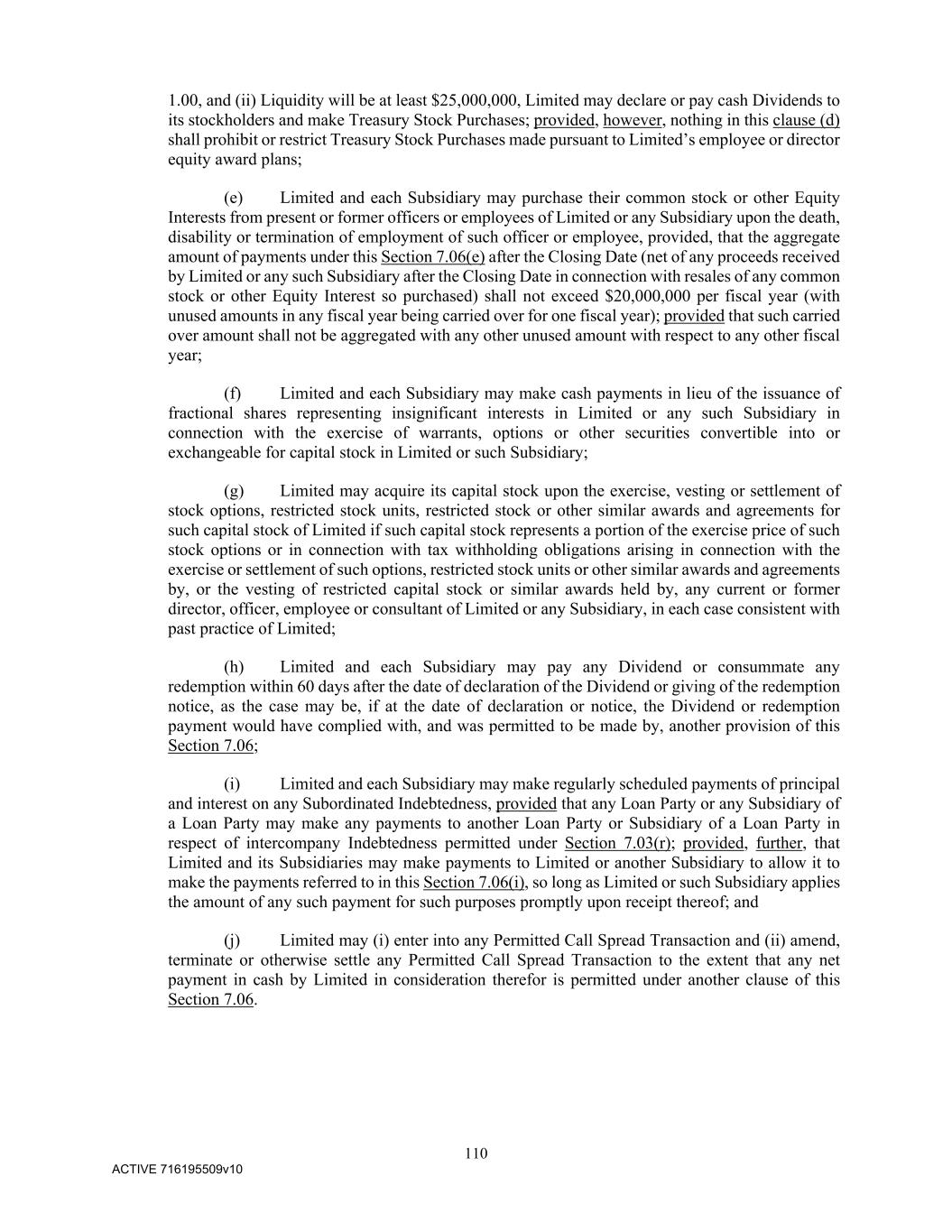 110 ACTIVE 716195509v10 1.00, and (ii) Liquidity will be at least $25,000,000, Limited may declare or pay cash Dividends to its stockholders and make Treasury Stock Purchases; provided, however, nothing in this clause (d) shall prohibit or restrict Treasury Stock Purchases made pursuant to Limited’s employee or director equity award plans; (e) Limited and each Subsidiary may purchase their common stock or other Equity Interests from present or former officers or employees of Limited or any Subsidiary upon the death, disability or termination of employment of such officer or employee, provided, that the aggregate amount of payments under this Section 7.06(e) after the Closing Date (net of any proceeds received by Limited or any such Subsidiary after the Closing Date in connection with resales of any common stock or other Equity Interest so purchased) shall not exceed $20,000,000 per fiscal year (with unused amounts in any fiscal year being carried over for one fiscal year); provided that such carried over amount shall not be aggregated with any other unused amount with respect to any other fiscal year; (f) Limited and each Subsidiary may make cash payments in lieu of the issuance of fractional shares representing insignificant interests in Limited or any such Subsidiary in connection with the exercise of warrants, options or other securities convertible into or exchangeable for capital stock in Limited or such Subsidiary; (g) Limited may acquire its capital stock upon the exercise, vesting or settlement of stock options, restricted stock units, restricted stock or other similar awards and agreements for such capital stock of Limited if such capital stock represents a portion of the exercise price of such stock options or in connection with tax withholding obligations arising in connection with the exercise or settlement of such options, restricted stock units or other similar awards and agreements by, or the vesting of restricted capital stock or similar awards held by, any current or former director, officer, employee or consultant of Limited or any Subsidiary, in each case consistent with past practice of Limited; (h) Limited and each Subsidiary may pay any Dividend or consummate any redemption within 60 days after the date of declaration of the Dividend or giving of the redemption notice, as the case may be, if at the date of declaration or notice, the Dividend or redemption payment would have complied with, and was permitted to be made by, another provision of this Section 7.06; (i) Limited and each Subsidiary may make regularly scheduled payments of principal and interest on any Subordinated Indebtedness, provided that any Loan Party or any Subsidiary of a Loan Party may make any payments to another Loan Party or Subsidiary of a Loan Party in respect of intercompany Indebtedness permitted under Section 7.03(r); provided, further, that Limited and its Subsidiaries may make payments to Limited or another Subsidiary to allow it to make the payments referred to in this Section 7.06(i), so long as Limited or such Subsidiary applies the amount of any such payment for such purposes promptly upon receipt thereof; and (j) Limited may (i) enter into any Permitted Call Spread Transaction and (ii) amend, terminate or otherwise settle any Permitted Call Spread Transaction to the extent that any net payment in cash by Limited in consideration therefor is permitted under another clause of this Section 7.06.