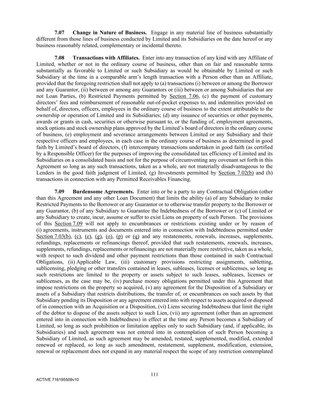 111 ACTIVE 716195509v10 7.07 Change in Nature of Business. Engage in any material line of business substantially different from those lines of business conducted by Limited and its Subsidiaries on the date hereof or any business reasonably related, complementary or incidental thereto. 7.08 Transactions with Affiliates. Enter into any transaction of any kind with any Affiliate of Limited, whether or not in the ordinary course of business, other than on fair and reasonable terms substantially as favorable to Limited or such Subsidiary as would be obtainable by Limited or such Subsidiary at the time in a comparable arm’s length transaction with a Person other than an Affiliate, provided that the foregoing restriction shall not apply to (a) transactions (i) between or among the Borrower and any Guarantor, (ii) between or among any Guarantors or (iii) between or among Subsidiaries that are not Loan Parties, (b) Restricted Payments permitted by Section 7.06, (c) the payment of customary directors’ fees and reimbursement of reasonable out-of-pocket expenses to, and indemnities provided on behalf of, directors, officers, employees in the ordinary course of business to the extent attributable to the ownership or operation of Limited and its Subsidiaries; (d) any issuance of securities or other payments, awards or grants in cash, securities or otherwise pursuant to, or the funding of, employment agreements, stock options and stock ownership plans approved by the Limited’s board of directors in the ordinary course of business, (e) employment and severance arrangements between Limited or any Subsidiary and their respective officers and employees, in each case in the ordinary course of business as determined in good faith by Limited’s board of directors, (f) intercompany transactions undertaken in good faith (as certified by a Responsible Officer) for the purposes of improving the consolidated tax efficiency of Limited and its Subsidiaries on a consolidated basis and not for the purpose of circumventing any covenant set forth in this Agreement so long as any such transactions, taken as a whole, are not materially disadvantageous to the Lenders in the good faith judgment of Limited, (g) Investments permitted by Section 7.02(b) and (h) transactions in connection with any Permitted Receivables Financing. 7.09 Burdensome Agreements. Enter into or be a party to any Contractual Obligation (other than this Agreement and any other Loan Document) that limits the ability (a) of any Subsidiary to make Restricted Payments to the Borrower or any Guarantor or to otherwise transfer property to the Borrower or any Guarantor, (b) of any Subsidiary to Guarantee the Indebtedness of the Borrower or (c) of Limited or any Subsidiary to create, incur, assume or suffer to exist Liens on property of such Person. The provisions of this Section 7.09 will not apply to encumbrances or restrictions existing under or by reason of (i) agreements, instruments and documents entered into in connection with Indebtedness permitted under Section 7.03(b), (c), (e), (g), (o), (p) or (q) and any restatements, renewals, increases, supplements, refundings, replacements or refinancings thereof, provided that such restatements, renewals, increases, supplements, refundings, replacements or refinancings are not materially more restrictive, taken as a whole, with respect to such dividend and other payment restrictions than those contained in such Contractual Obligations, (ii) Applicable Law, (iii) customary provisions restricting assignments, subletting, sublicensing, pledging or other transfers contained in leases, subleases, licenses or sublicenses, so long as such restrictions are limited to the property or assets subject to such leases, subleases, licenses or sublicenses, as the case may be, (iv) purchase money obligations permitted under this Agreement that impose restrictions on the property so acquired, (v) any agreement for the Disposition of a Subsidiary or assets of a Subsidiary that restricts distributions, the transfer of, or encumbrances on such assets by that Subsidiary pending its Disposition or any agreement entered into with respect to assets acquired or disposed of in connection with an Acquisition or a Disposition, (vi) Liens securing Indebtedness that limit the right of the debtor to dispose of the assets subject to such Lien, (vii) any agreement (other than an agreement entered into in connection with Indebtedness) in effect at the time any Person becomes a Subsidiary of Limited, so long as such prohibition or limitation applies only to such Subsidiary (and, if applicable, its Subsidiaries) and such agreement was not entered into in contemplation of such Person becoming a Subsidiary of Limited, as such agreement may be amended, restated, supplemented, modified, extended renewed or replaced, so long as such amendment, restatement, supplement, modification, extension, renewal or replacement does not expand in any material respect the scope of any restriction contemplated