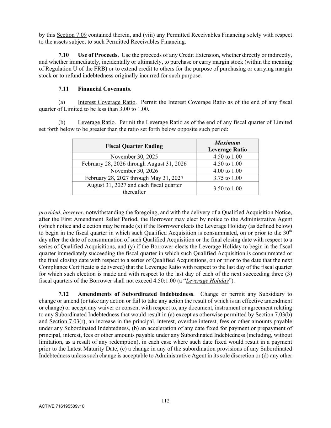 112 ACTIVE 716195509v10 by this Section 7.09 contained therein, and (viii) any Permitted Receivables Financing solely with respect to the assets subject to such Permitted Receivables Financing. 7.10 Use of Proceeds. Use the proceeds of any Credit Extension, whether directly or indirectly, and whether immediately, incidentally or ultimately, to purchase or carry margin stock (within the meaning of Regulation U of the FRB) or to extend credit to others for the purpose of purchasing or carrying margin stock or to refund indebtedness originally incurred for such purpose. 7.11 Financial Covenants. (a) Interest Coverage Ratio. Permit the Interest Coverage Ratio as of the end of any fiscal quarter of Limited to be less than 3.00 to 1.00. (b) Leverage Ratio. Permit the Leverage Ratio as of the end of any fiscal quarter of Limited set forth below to be greater than the ratio set forth below opposite such period: Fiscal Quarter Ending Maximum Leverage Ratio November 30, 2025 4.50 to 1.00 February 28, 2026 through August 31, 2026 4.50 to 1.00 November 30, 2026 4.00 to 1.00 February 28, 2027 through May 31, 2027 3.75 to 1.00 August 31, 2027 and each fiscal quarter thereafter 3.50 to 1.00 provided, however, notwithstanding the foregoing, and with the delivery of a Qualified Acquisition Notice, after the First Amendment Relief Period, the Borrower may elect by notice to the Administrative Agent (which notice and election may be made (x) if the Borrower elects the Leverage Holiday (as defined below) to begin in the fiscal quarter in which such Qualified Acquisition is consummated, on or prior to the 30th day after the date of consummation of such Qualified Acquisition or the final closing date with respect to a series of Qualified Acquisitions, and (y) if the Borrower elects the Leverage Holiday to begin in the fiscal quarter immediately succeeding the fiscal quarter in which such Qualified Acquisition is consummated or the final closing date with respect to a series of Qualified Acquisitions, on or prior to the date that the next Compliance Certificate is delivered) that the Leverage Ratio with respect to the last day of the fiscal quarter for which such election is made and with respect to the last day of each of the next succeeding three (3) fiscal quarters of the Borrower shall not exceed 4.50:1.00 (a “Leverage Holiday”). 7.12 Amendments of Subordinated Indebtedness. Change or permit any Subsidiary to change or amend (or take any action or fail to take any action the result of which is an effective amendment or change) or accept any waiver or consent with respect to, any document, instrument or agreement relating to any Subordinated Indebtedness that would result in (a) except as otherwise permitted by Section 7.03(b) and Section 7.03(r), an increase in the principal, interest, overdue interest, fees or other amounts payable under any Subordinated Indebtedness, (b) an acceleration of any date fixed for payment or prepayment of principal, interest, fees or other amounts payable under any Subordinated Indebtedness (including, without limitation, as a result of any redemption), in each case where such date fixed would result in a payment prior to the Latest Maturity Date, (c) a change in any of the subordination provisions of any Subordinated Indebtedness unless such change is acceptable to Administrative Agent in its sole discretion or (d) any other