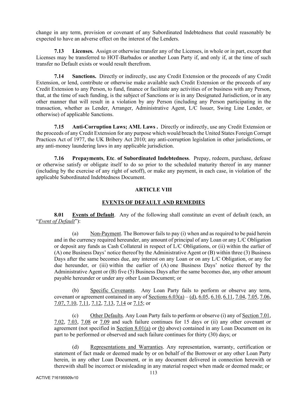 113 ACTIVE 716195509v10 change in any term, provision or covenant of any Subordinated Indebtedness that could reasonably be expected to have an adverse effect on the interest of the Lenders. 7.13 Licenses. Assign or otherwise transfer any of the Licenses, in whole or in part, except that Licenses may be transferred to HOT-Barbados or another Loan Party if, and only if, at the time of such transfer no Default exists or would result therefrom. 7.14 Sanctions. Directly or indirectly, use any Credit Extension or the proceeds of any Credit Extension, or lend, contribute or otherwise make available such Credit Extension or the proceeds of any Credit Extension to any Person, to fund, finance or facilitate any activities of or business with any Person, that, at the time of such funding, is the subject of Sanctions or is in any Designated Jurisdiction, or in any other manner that will result in a violation by any Person (including any Person participating in the transaction, whether as Lender, Arranger, Administrative Agent, L/C Issuer, Swing Line Lender, or otherwise) of applicable Sanctions. 7.15 Anti-Corruption Laws; AML Laws . Directly or indirectly, use any Credit Extension or the proceeds of any Credit Extension for any purpose which would breach the United States Foreign Corrupt Practices Act of 1977, the UK Bribery Act 2010; any anti-corruption legislation in other jurisdictions, or any anti-money laundering laws in any applicable jurisdiction. 7.16 Prepayments, Etc. of Subordinated Indebtedness. Prepay, redeem, purchase, defease or otherwise satisfy or obligate itself to do so prior to the scheduled maturity thereof in any manner (including by the exercise of any right of setoff), or make any payment, in each case, in violation of the applicable Subordinated Indebtedness Document. ARTICLE VIII EVENTS OF DEFAULT AND REMEDIES 8.01 Events of Default. Any of the following shall constitute an event of default (each, an “Event of Default”): (a) Non-Payment. The Borrower fails to pay (i) when and as required to be paid herein and in the currency required hereunder, any amount of principal of any Loan or any L/C Obligation or deposit any funds as Cash Collateral in respect of L/C Obligations, or (ii) within the earlier of (A) one Business Days’ notice thereof by the Administrative Agent or (B) within three (3) Business Days after the same becomes due, any interest on any Loan or on any L/C Obligation, or any fee due hereunder, or (iii) within the earlier of (A) one Business Days’ notice thereof by the Administrative Agent or (B) five (5) Business Days after the same becomes due, any other amount payable hereunder or under any other Loan Document; or (b) Specific Covenants. Any Loan Party fails to perform or observe any term, covenant or agreement contained in any of Sections 6.03(a) – (d), 6.05, 6.10, 6.11, 7.04, 7.05, 7.06, 7.07, 7.10, 7.11, 7.12, 7.13, 7.14 or 7.15; or (c) Other Defaults. Any Loan Party fails to perform or observe (i) any of Section 7.01, 7.02, 7.03, 7.08 or 7.09 and such failure continues for 15 days or (ii) any other covenant or agreement (not specified in Section 8.01(a) or (b) above) contained in any Loan Document on its part to be performed or observed and such failure continues for thirty (30) days; or (d) Representations and Warranties. Any representation, warranty, certification or statement of fact made or deemed made by or on behalf of the Borrower or any other Loan Party herein, in any other Loan Document, or in any document delivered in connection herewith or therewith shall be incorrect or misleading in any material respect when made or deemed made; or