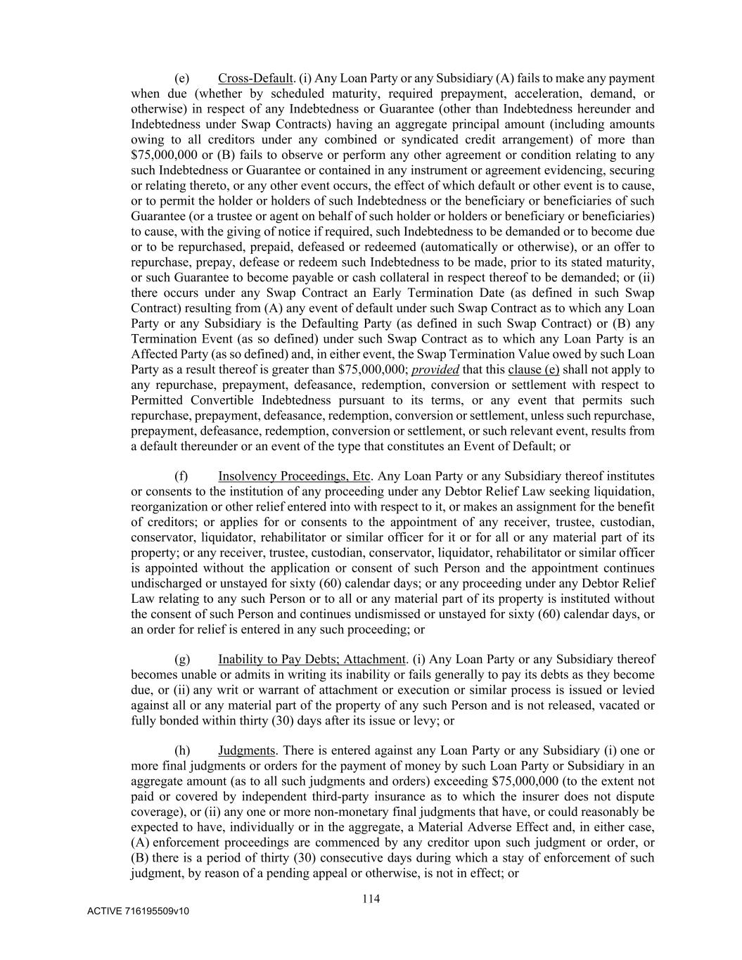 114 ACTIVE 716195509v10 (e) Cross-Default. (i) Any Loan Party or any Subsidiary (A) fails to make any payment when due (whether by scheduled maturity, required prepayment, acceleration, demand, or otherwise) in respect of any Indebtedness or Guarantee (other than Indebtedness hereunder and Indebtedness under Swap Contracts) having an aggregate principal amount (including amounts owing to all creditors under any combined or syndicated credit arrangement) of more than $75,000,000 or (B) fails to observe or perform any other agreement or condition relating to any such Indebtedness or Guarantee or contained in any instrument or agreement evidencing, securing or relating thereto, or any other event occurs, the effect of which default or other event is to cause, or to permit the holder or holders of such Indebtedness or the beneficiary or beneficiaries of such Guarantee (or a trustee or agent on behalf of such holder or holders or beneficiary or beneficiaries) to cause, with the giving of notice if required, such Indebtedness to be demanded or to become due or to be repurchased, prepaid, defeased or redeemed (automatically or otherwise), or an offer to repurchase, prepay, defease or redeem such Indebtedness to be made, prior to its stated maturity, or such Guarantee to become payable or cash collateral in respect thereof to be demanded; or (ii) there occurs under any Swap Contract an Early Termination Date (as defined in such Swap Contract) resulting from (A) any event of default under such Swap Contract as to which any Loan Party or any Subsidiary is the Defaulting Party (as defined in such Swap Contract) or (B) any Termination Event (as so defined) under such Swap Contract as to which any Loan Party is an Affected Party (as so defined) and, in either event, the Swap Termination Value owed by such Loan Party as a result thereof is greater than $75,000,000; provided that this clause (e) shall not apply to any repurchase, prepayment, defeasance, redemption, conversion or settlement with respect to Permitted Convertible Indebtedness pursuant to its terms, or any event that permits such repurchase, prepayment, defeasance, redemption, conversion or settlement, unless such repurchase, prepayment, defeasance, redemption, conversion or settlement, or such relevant event, results from a default thereunder or an event of the type that constitutes an Event of Default; or (f) Insolvency Proceedings, Etc. Any Loan Party or any Subsidiary thereof institutes or consents to the institution of any proceeding under any Debtor Relief Law seeking liquidation, reorganization or other relief entered into with respect to it, or makes an assignment for the benefit of creditors; or applies for or consents to the appointment of any receiver, trustee, custodian, conservator, liquidator, rehabilitator or similar officer for it or for all or any material part of its property; or any receiver, trustee, custodian, conservator, liquidator, rehabilitator or similar officer is appointed without the application or consent of such Person and the appointment continues undischarged or unstayed for sixty (60) calendar days; or any proceeding under any Debtor Relief Law relating to any such Person or to all or any material part of its property is instituted without the consent of such Person and continues undismissed or unstayed for sixty (60) calendar days, or an order for relief is entered in any such proceeding; or (g) Inability to Pay Debts; Attachment. (i) Any Loan Party or any Subsidiary thereof becomes unable or admits in writing its inability or fails generally to pay its debts as they become due, or (ii) any writ or warrant of attachment or execution or similar process is issued or levied against all or any material part of the property of any such Person and is not released, vacated or fully bonded within thirty (30) days after its issue or levy; or (h) Judgments. There is entered against any Loan Party or any Subsidiary (i) one or more final judgments or orders for the payment of money by such Loan Party or Subsidiary in an aggregate amount (as to all such judgments and orders) exceeding $75,000,000 (to the extent not paid or covered by independent third-party insurance as to which the insurer does not dispute coverage), or (ii) any one or more non-monetary final judgments that have, or could reasonably be expected to have, individually or in the aggregate, a Material Adverse Effect and, in either case, (A) enforcement proceedings are commenced by any creditor upon such judgment or order, or (B) there is a period of thirty (30) consecutive days during which a stay of enforcement of such judgment, by reason of a pending appeal or otherwise, is not in effect; or