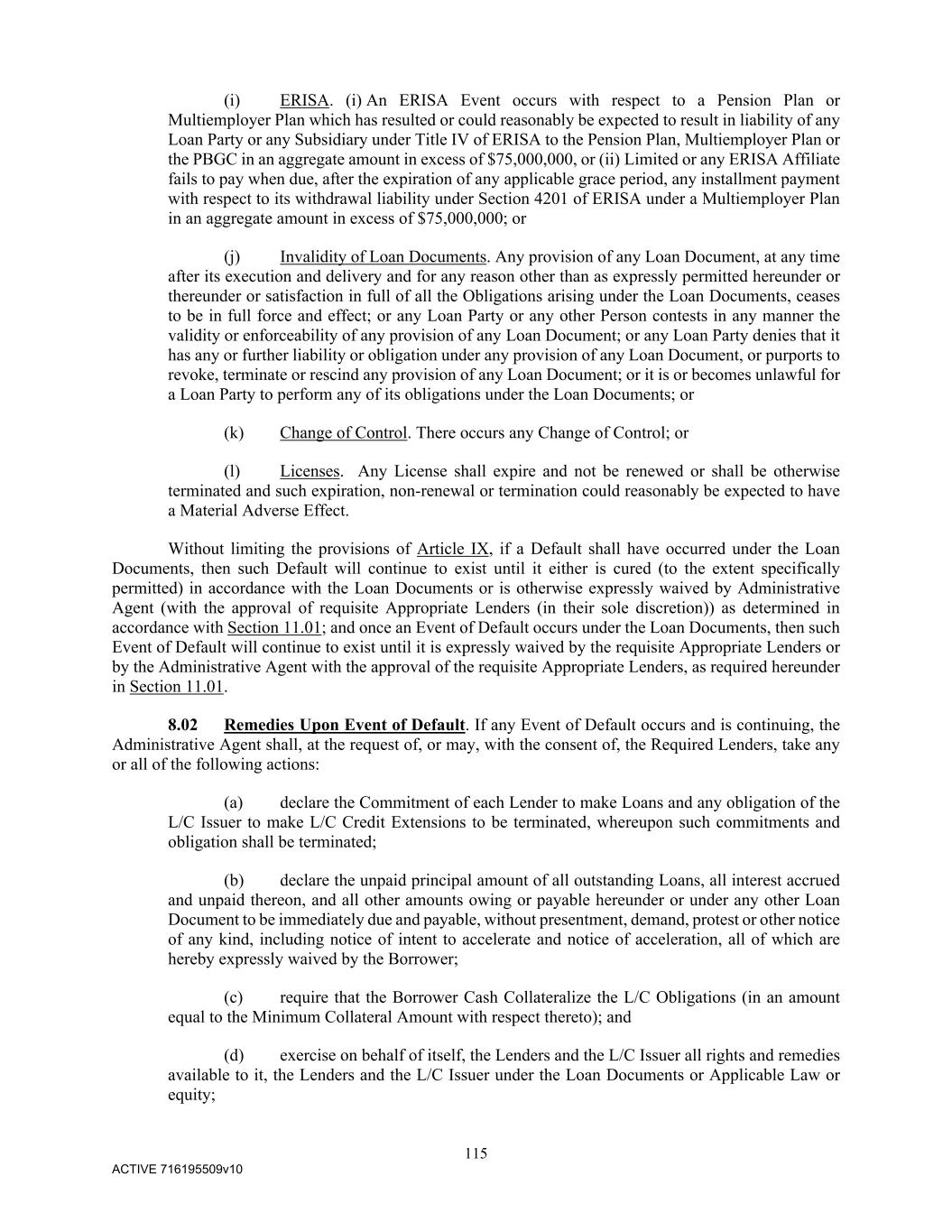 115 ACTIVE 716195509v10 (i) ERISA. (i) An ERISA Event occurs with respect to a Pension Plan or Multiemployer Plan which has resulted or could reasonably be expected to result in liability of any Loan Party or any Subsidiary under Title IV of ERISA to the Pension Plan, Multiemployer Plan or the PBGC in an aggregate amount in excess of $75,000,000, or (ii) Limited or any ERISA Affiliate fails to pay when due, after the expiration of any applicable grace period, any installment payment with respect to its withdrawal liability under Section 4201 of ERISA under a Multiemployer Plan in an aggregate amount in excess of $75,000,000; or (j) Invalidity of Loan Documents. Any provision of any Loan Document, at any time after its execution and delivery and for any reason other than as expressly permitted hereunder or thereunder or satisfaction in full of all the Obligations arising under the Loan Documents, ceases to be in full force and effect; or any Loan Party or any other Person contests in any manner the validity or enforceability of any provision of any Loan Document; or any Loan Party denies that it has any or further liability or obligation under any provision of any Loan Document, or purports to revoke, terminate or rescind any provision of any Loan Document; or it is or becomes unlawful for a Loan Party to perform any of its obligations under the Loan Documents; or (k) Change of Control. There occurs any Change of Control; or (l) Licenses. Any License shall expire and not be renewed or shall be otherwise terminated and such expiration, non-renewal or termination could reasonably be expected to have a Material Adverse Effect. Without limiting the provisions of Article IX, if a Default shall have occurred under the Loan Documents, then such Default will continue to exist until it either is cured (to the extent specifically permitted) in accordance with the Loan Documents or is otherwise expressly waived by Administrative Agent (with the approval of requisite Appropriate Lenders (in their sole discretion)) as determined in accordance with Section 11.01; and once an Event of Default occurs under the Loan Documents, then such Event of Default will continue to exist until it is expressly waived by the requisite Appropriate Lenders or by the Administrative Agent with the approval of the requisite Appropriate Lenders, as required hereunder in Section 11.01. 8.02 Remedies Upon Event of Default. If any Event of Default occurs and is continuing, the Administrative Agent shall, at the request of, or may, with the consent of, the Required Lenders, take any or all of the following actions: (a) declare the Commitment of each Lender to make Loans and any obligation of the L/C Issuer to make L/C Credit Extensions to be terminated, whereupon such commitments and obligation shall be terminated; (b) declare the unpaid principal amount of all outstanding Loans, all interest accrued and unpaid thereon, and all other amounts owing or payable hereunder or under any other Loan Document to be immediately due and payable, without presentment, demand, protest or other notice of any kind, including notice of intent to accelerate and notice of acceleration, all of which are hereby expressly waived by the Borrower; (c) require that the Borrower Cash Collateralize the L/C Obligations (in an amount equal to the Minimum Collateral Amount with respect thereto); and (d) exercise on behalf of itself, the Lenders and the L/C Issuer all rights and remedies available to it, the Lenders and the L/C Issuer under the Loan Documents or Applicable Law or equity;