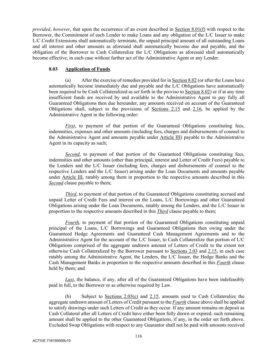 116 ACTIVE 716195509v10 provided, however, that upon the occurrence of an event described in Section 8.01(f) with respect to the Borrower, the Commitment of each Lender to make Loans and any obligation of the L/C Issuer to make L/C Credit Extensions shall automatically terminate, the unpaid principal amount of all outstanding Loans and all interest and other amounts as aforesaid shall automatically become due and payable, and the obligation of the Borrower to Cash Collateralize the L/C Obligations as aforesaid shall automatically become effective, in each case without further act of the Administrative Agent or any Lender. 8.03 Application of Funds. (a) After the exercise of remedies provided for in Section 8.02 (or after the Loans have automatically become immediately due and payable and the L/C Obligations have automatically been required to be Cash Collateralized as set forth in the proviso to Section 8.02) or if at any time insufficient funds are received by and available to the Administrative Agent to pay fully all Guaranteed Obligations then due hereunder, any amounts received on account of the Guaranteed Obligations shall, subject to the provisions of Sections 2.15 and 2.16, be applied by the Administrative Agent in the following order: First, to payment of that portion of the Guaranteed Obligations constituting fees, indemnities, expenses and other amounts (including fees, charges and disbursements of counsel to the Administrative Agent and amounts payable under Article III) payable to the Administrative Agent in its capacity as such; Second, to payment of that portion of the Guaranteed Obligations constituting fees, indemnities and other amounts (other than principal, interest and Letter of Credit Fees) payable to the Lenders and the L/C Issuer (including fees, charges and disbursements of counsel to the respective Lenders and the L/C Issuer) arising under the Loan Documents and amounts payable under Article III, ratably among them in proportion to the respective amounts described in this Second clause payable to them; Third, to payment of that portion of the Guaranteed Obligations constituting accrued and unpaid Letter of Credit Fees and interest on the Loans, L/C Borrowings and other Guaranteed Obligations arising under the Loan Documents, ratably among the Lenders, and the L/C Issuer in proportion to the respective amounts described in this Third clause payable to them; Fourth, to payment of that portion of the Guaranteed Obligations constituting unpaid principal of the Loans, L/C Borrowings and Guaranteed Obligations then owing under the Guaranteed Hedge Agreements and Guaranteed Cash Management Agreements and to the Administrative Agent for the account of the L/C Issuer, to Cash Collateralize that portion of L/C Obligations comprised of the aggregate undrawn amount of Letters of Credit to the extent not otherwise Cash Collateralized by the Borrower pursuant to Sections 2.03 and 2.15, in each case ratably among the Administrative Agent, the Lenders, the L/C Issuer, the Hedge Banks and the Cash Management Banks in proportion to the respective amounts described in this Fourth clause held by them; and Last, the balance, if any, after all of the Guaranteed Obligations have been indefeasibly paid in full, to the Borrower or as otherwise required by Law. (b) Subject to Sections 2.03(c) and 2.15, amounts used to Cash Collateralize the aggregate undrawn amount of Letters of Credit pursuant to the Fourth clause above shall be applied to satisfy drawings under such Letters of Credit as they occur. If any amount remains on deposit as Cash Collateral after all Letters of Credit have either been fully drawn or expired, such remaining amount shall be applied to the other Guaranteed Obligations, if any, in the order set forth above. Excluded Swap Obligations with respect to any Guarantor shall not be paid with amounts received