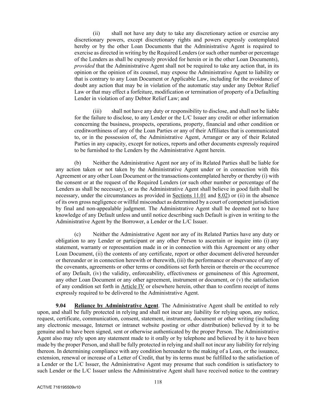 118 ACTIVE 716195509v10 (ii) shall not have any duty to take any discretionary action or exercise any discretionary powers, except discretionary rights and powers expressly contemplated hereby or by the other Loan Documents that the Administrative Agent is required to exercise as directed in writing by the Required Lenders (or such other number or percentage of the Lenders as shall be expressly provided for herein or in the other Loan Documents), provided that the Administrative Agent shall not be required to take any action that, in its opinion or the opinion of its counsel, may expose the Administrative Agent to liability or that is contrary to any Loan Document or Applicable Law, including for the avoidance of doubt any action that may be in violation of the automatic stay under any Debtor Relief Law or that may effect a forfeiture, modification or termination of property of a Defaulting Lender in violation of any Debtor Relief Law; and (iii) shall not have any duty or responsibility to disclose, and shall not be liable for the failure to disclose, to any Lender or the L/C Issuer any credit or other information concerning the business, prospects, operations, property, financial and other condition or creditworthiness of any of the Loan Parties or any of their Affiliates that is communicated to, or in the possession of, the Administrative Agent, Arranger or any of their Related Parties in any capacity, except for notices, reports and other documents expressly required to be furnished to the Lenders by the Administrative Agent herein. (b) Neither the Administrative Agent nor any of its Related Parties shall be liable for any action taken or not taken by the Administrative Agent under or in connection with this Agreement or any other Loan Document or the transactions contemplated hereby or thereby (i) with the consent or at the request of the Required Lenders (or such other number or percentage of the Lenders as shall be necessary), or as the Administrative Agent shall believe in good faith shall be necessary, under the circumstances as provided in Sections 11.01 and 8.02) or (ii) in the absence of its own gross negligence or willful misconduct as determined by a court of competent jurisdiction by final and non-appealable judgment. The Administrative Agent shall be deemed not to have knowledge of any Default unless and until notice describing such Default is given in writing to the Administrative Agent by the Borrower, a Lender or the L/C Issuer. (c) Neither the Administrative Agent nor any of its Related Parties have any duty or obligation to any Lender or participant or any other Person to ascertain or inquire into (i) any statement, warranty or representation made in or in connection with this Agreement or any other Loan Document, (ii) the contents of any certificate, report or other document delivered hereunder or thereunder or in connection herewith or therewith, (iii) the performance or observance of any of the covenants, agreements or other terms or conditions set forth herein or therein or the occurrence of any Default, (iv) the validity, enforceability, effectiveness or genuineness of this Agreement, any other Loan Document or any other agreement, instrument or document, or (v) the satisfaction of any condition set forth in Article IV or elsewhere herein, other than to confirm receipt of items expressly required to be delivered to the Administrative Agent. 9.04 Reliance by Administrative Agent. The Administrative Agent shall be entitled to rely upon, and shall be fully protected in relying and shall not incur any liability for relying upon, any notice, request, certificate, communication, consent, statement, instrument, document or other writing (including any electronic message, Internet or intranet website posting or other distribution) believed by it to be genuine and to have been signed, sent or otherwise authenticated by the proper Person. The Administrative Agent also may rely upon any statement made to it orally or by telephone and believed by it to have been made by the proper Person, and shall be fully protected in relying and shall not incur any liability for relying thereon. In determining compliance with any condition hereunder to the making of a Loan, or the issuance, extension, renewal or increase of a Letter of Credit, that by its terms must be fulfilled to the satisfaction of a Lender or the L/C Issuer, the Administrative Agent may presume that such condition is satisfactory to such Lender or the L/C Issuer unless the Administrative Agent shall have received notice to the contrary