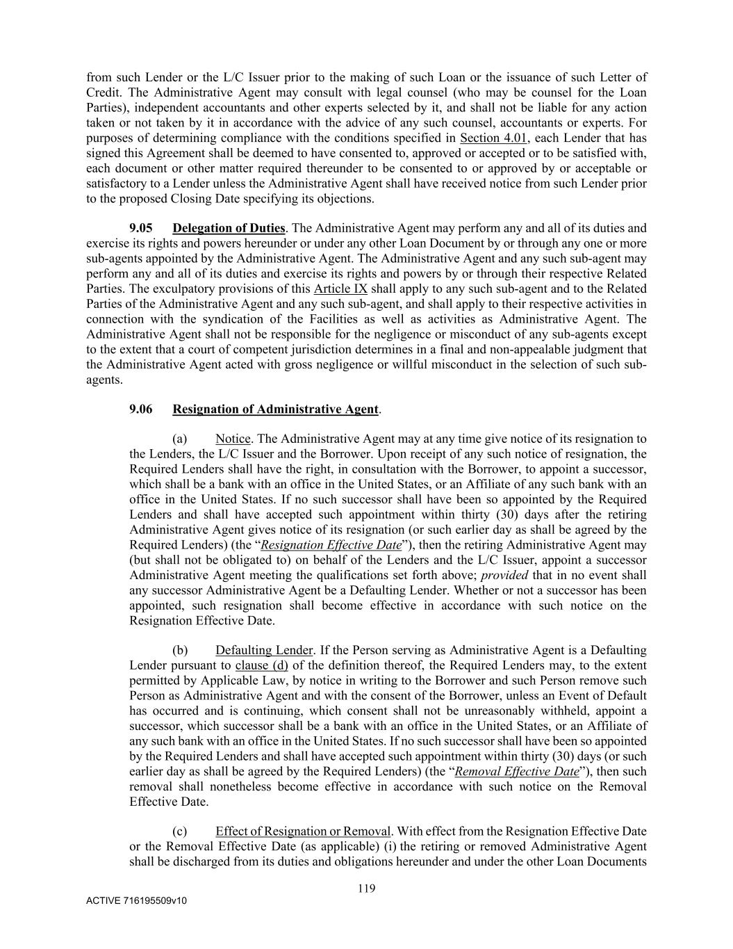 119 ACTIVE 716195509v10 from such Lender or the L/C Issuer prior to the making of such Loan or the issuance of such Letter of Credit. The Administrative Agent may consult with legal counsel (who may be counsel for the Loan Parties), independent accountants and other experts selected by it, and shall not be liable for any action taken or not taken by it in accordance with the advice of any such counsel, accountants or experts. For purposes of determining compliance with the conditions specified in Section 4.01, each Lender that has signed this Agreement shall be deemed to have consented to, approved or accepted or to be satisfied with, each document or other matter required thereunder to be consented to or approved by or acceptable or satisfactory to a Lender unless the Administrative Agent shall have received notice from such Lender prior to the proposed Closing Date specifying its objections. 9.05 Delegation of Duties. The Administrative Agent may perform any and all of its duties and exercise its rights and powers hereunder or under any other Loan Document by or through any one or more sub-agents appointed by the Administrative Agent. The Administrative Agent and any such sub-agent may perform any and all of its duties and exercise its rights and powers by or through their respective Related Parties. The exculpatory provisions of this Article IX shall apply to any such sub-agent and to the Related Parties of the Administrative Agent and any such sub-agent, and shall apply to their respective activities in connection with the syndication of the Facilities as well as activities as Administrative Agent. The Administrative Agent shall not be responsible for the negligence or misconduct of any sub-agents except to the extent that a court of competent jurisdiction determines in a final and non-appealable judgment that the Administrative Agent acted with gross negligence or willful misconduct in the selection of such sub- agents. 9.06 Resignation of Administrative Agent. (a) Notice. The Administrative Agent may at any time give notice of its resignation to the Lenders, the L/C Issuer and the Borrower. Upon receipt of any such notice of resignation, the Required Lenders shall have the right, in consultation with the Borrower, to appoint a successor, which shall be a bank with an office in the United States, or an Affiliate of any such bank with an office in the United States. If no such successor shall have been so appointed by the Required Lenders and shall have accepted such appointment within thirty (30) days after the retiring Administrative Agent gives notice of its resignation (or such earlier day as shall be agreed by the Required Lenders) (the “Resignation Effective Date”), then the retiring Administrative Agent may (but shall not be obligated to) on behalf of the Lenders and the L/C Issuer, appoint a successor Administrative Agent meeting the qualifications set forth above; provided that in no event shall any successor Administrative Agent be a Defaulting Lender. Whether or not a successor has been appointed, such resignation shall become effective in accordance with such notice on the Resignation Effective Date. (b) Defaulting Lender. If the Person serving as Administrative Agent is a Defaulting Lender pursuant to clause (d) of the definition thereof, the Required Lenders may, to the extent permitted by Applicable Law, by notice in writing to the Borrower and such Person remove such Person as Administrative Agent and with the consent of the Borrower, unless an Event of Default has occurred and is continuing, which consent shall not be unreasonably withheld, appoint a successor, which successor shall be a bank with an office in the United States, or an Affiliate of any such bank with an office in the United States. If no such successor shall have been so appointed by the Required Lenders and shall have accepted such appointment within thirty (30) days (or such earlier day as shall be agreed by the Required Lenders) (the “Removal Effective Date”), then such removal shall nonetheless become effective in accordance with such notice on the Removal Effective Date. (c) Effect of Resignation or Removal. With effect from the Resignation Effective Date or the Removal Effective Date (as applicable) (i) the retiring or removed Administrative Agent shall be discharged from its duties and obligations hereunder and under the other Loan Documents
