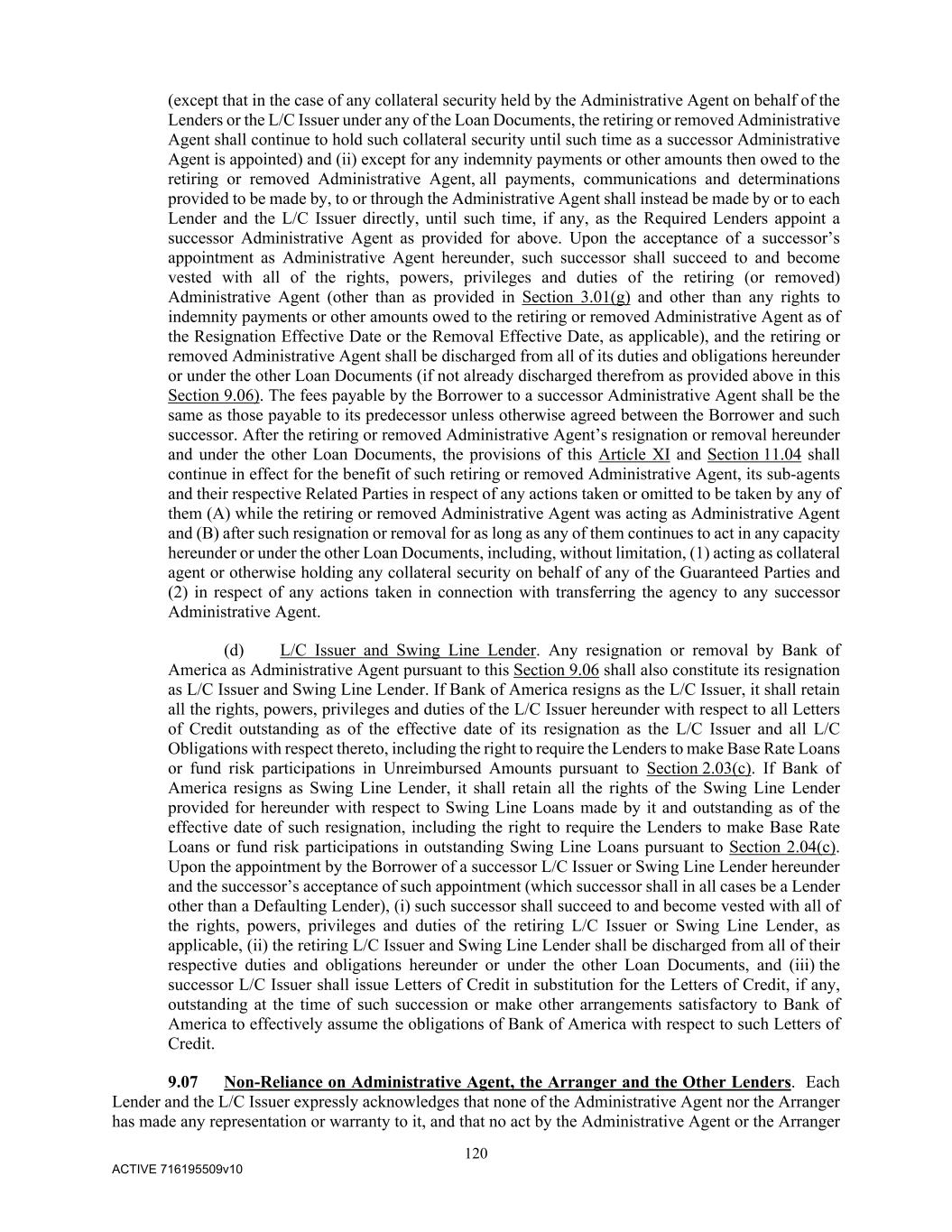 120 ACTIVE 716195509v10 (except that in the case of any collateral security held by the Administrative Agent on behalf of the Lenders or the L/C Issuer under any of the Loan Documents, the retiring or removed Administrative Agent shall continue to hold such collateral security until such time as a successor Administrative Agent is appointed) and (ii) except for any indemnity payments or other amounts then owed to the retiring or removed Administrative Agent, all payments, communications and determinations provided to be made by, to or through the Administrative Agent shall instead be made by or to each Lender and the L/C Issuer directly, until such time, if any, as the Required Lenders appoint a successor Administrative Agent as provided for above. Upon the acceptance of a successor’s appointment as Administrative Agent hereunder, such successor shall succeed to and become vested with all of the rights, powers, privileges and duties of the retiring (or removed) Administrative Agent (other than as provided in Section 3.01(g) and other than any rights to indemnity payments or other amounts owed to the retiring or removed Administrative Agent as of the Resignation Effective Date or the Removal Effective Date, as applicable), and the retiring or removed Administrative Agent shall be discharged from all of its duties and obligations hereunder or under the other Loan Documents (if not already discharged therefrom as provided above in this Section 9.06). The fees payable by the Borrower to a successor Administrative Agent shall be the same as those payable to its predecessor unless otherwise agreed between the Borrower and such successor. After the retiring or removed Administrative Agent’s resignation or removal hereunder and under the other Loan Documents, the provisions of this Article XI and Section 11.04 shall continue in effect for the benefit of such retiring or removed Administrative Agent, its sub-agents and their respective Related Parties in respect of any actions taken or omitted to be taken by any of them (A) while the retiring or removed Administrative Agent was acting as Administrative Agent and (B) after such resignation or removal for as long as any of them continues to act in any capacity hereunder or under the other Loan Documents, including, without limitation, (1) acting as collateral agent or otherwise holding any collateral security on behalf of any of the Guaranteed Parties and (2) in respect of any actions taken in connection with transferring the agency to any successor Administrative Agent. (d) L/C Issuer and Swing Line Lender. Any resignation or removal by Bank of America as Administrative Agent pursuant to this Section 9.06 shall also constitute its resignation as L/C Issuer and Swing Line Lender. If Bank of America resigns as the L/C Issuer, it shall retain all the rights, powers, privileges and duties of the L/C Issuer hereunder with respect to all Letters of Credit outstanding as of the effective date of its resignation as the L/C Issuer and all L/C Obligations with respect thereto, including the right to require the Lenders to make Base Rate Loans or fund risk participations in Unreimbursed Amounts pursuant to Section 2.03(c). If Bank of America resigns as Swing Line Lender, it shall retain all the rights of the Swing Line Lender provided for hereunder with respect to Swing Line Loans made by it and outstanding as of the effective date of such resignation, including the right to require the Lenders to make Base Rate Loans or fund risk participations in outstanding Swing Line Loans pursuant to Section 2.04(c). Upon the appointment by the Borrower of a successor L/C Issuer or Swing Line Lender hereunder and the successor’s acceptance of such appointment (which successor shall in all cases be a Lender other than a Defaulting Lender), (i) such successor shall succeed to and become vested with all of the rights, powers, privileges and duties of the retiring L/C Issuer or Swing Line Lender, as applicable, (ii) the retiring L/C Issuer and Swing Line Lender shall be discharged from all of their respective duties and obligations hereunder or under the other Loan Documents, and (iii) the successor L/C Issuer shall issue Letters of Credit in substitution for the Letters of Credit, if any, outstanding at the time of such succession or make other arrangements satisfactory to Bank of America to effectively assume the obligations of Bank of America with respect to such Letters of Credit. 9.07 Non-Reliance on Administrative Agent, the Arranger and the Other Lenders. Each Lender and the L/C Issuer expressly acknowledges that none of the Administrative Agent nor the Arranger has made any representation or warranty to it, and that no act by the Administrative Agent or the Arranger