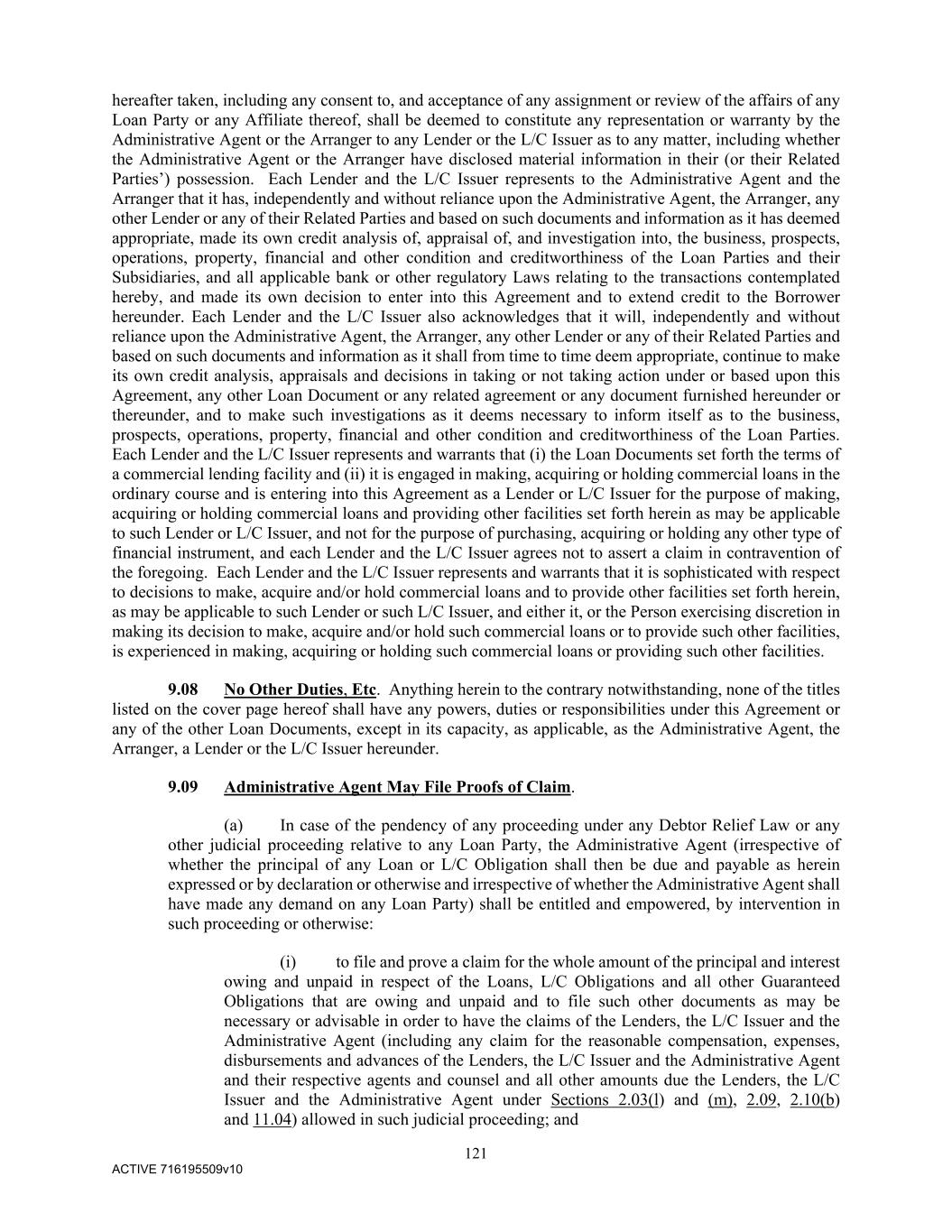 121 ACTIVE 716195509v10 hereafter taken, including any consent to, and acceptance of any assignment or review of the affairs of any Loan Party or any Affiliate thereof, shall be deemed to constitute any representation or warranty by the Administrative Agent or the Arranger to any Lender or the L/C Issuer as to any matter, including whether the Administrative Agent or the Arranger have disclosed material information in their (or their Related Parties’) possession. Each Lender and the L/C Issuer represents to the Administrative Agent and the Arranger that it has, independently and without reliance upon the Administrative Agent, the Arranger, any other Lender or any of their Related Parties and based on such documents and information as it has deemed appropriate, made its own credit analysis of, appraisal of, and investigation into, the business, prospects, operations, property, financial and other condition and creditworthiness of the Loan Parties and their Subsidiaries, and all applicable bank or other regulatory Laws relating to the transactions contemplated hereby, and made its own decision to enter into this Agreement and to extend credit to the Borrower hereunder. Each Lender and the L/C Issuer also acknowledges that it will, independently and without reliance upon the Administrative Agent, the Arranger, any other Lender or any of their Related Parties and based on such documents and information as it shall from time to time deem appropriate, continue to make its own credit analysis, appraisals and decisions in taking or not taking action under or based upon this Agreement, any other Loan Document or any related agreement or any document furnished hereunder or thereunder, and to make such investigations as it deems necessary to inform itself as to the business, prospects, operations, property, financial and other condition and creditworthiness of the Loan Parties. Each Lender and the L/C Issuer represents and warrants that (i) the Loan Documents set forth the terms of a commercial lending facility and (ii) it is engaged in making, acquiring or holding commercial loans in the ordinary course and is entering into this Agreement as a Lender or L/C Issuer for the purpose of making, acquiring or holding commercial loans and providing other facilities set forth herein as may be applicable to such Lender or L/C Issuer, and not for the purpose of purchasing, acquiring or holding any other type of financial instrument, and each Lender and the L/C Issuer agrees not to assert a claim in contravention of the foregoing. Each Lender and the L/C Issuer represents and warrants that it is sophisticated with respect to decisions to make, acquire and/or hold commercial loans and to provide other facilities set forth herein, as may be applicable to such Lender or such L/C Issuer, and either it, or the Person exercising discretion in making its decision to make, acquire and/or hold such commercial loans or to provide such other facilities, is experienced in making, acquiring or holding such commercial loans or providing such other facilities. 9.08 No Other Duties, Etc. Anything herein to the contrary notwithstanding, none of the titles listed on the cover page hereof shall have any powers, duties or responsibilities under this Agreement or any of the other Loan Documents, except in its capacity, as applicable, as the Administrative Agent, the Arranger, a Lender or the L/C Issuer hereunder. 9.09 Administrative Agent May File Proofs of Claim. (a) In case of the pendency of any proceeding under any Debtor Relief Law or any other judicial proceeding relative to any Loan Party, the Administrative Agent (irrespective of whether the principal of any Loan or L/C Obligation shall then be due and payable as herein expressed or by declaration or otherwise and irrespective of whether the Administrative Agent shall have made any demand on any Loan Party) shall be entitled and empowered, by intervention in such proceeding or otherwise: (i) to file and prove a claim for the whole amount of the principal and interest owing and unpaid in respect of the Loans, L/C Obligations and all other Guaranteed Obligations that are owing and unpaid and to file such other documents as may be necessary or advisable in order to have the claims of the Lenders, the L/C Issuer and the Administrative Agent (including any claim for the reasonable compensation, expenses, disbursements and advances of the Lenders, the L/C Issuer and the Administrative Agent and their respective agents and counsel and all other amounts due the Lenders, the L/C Issuer and the Administrative Agent under Sections 2.03(l) and (m), 2.09, 2.10(b) and 11.04) allowed in such judicial proceeding; and