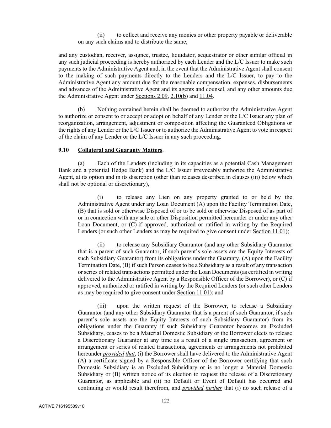 122 ACTIVE 716195509v10 (ii) to collect and receive any monies or other property payable or deliverable on any such claims and to distribute the same; and any custodian, receiver, assignee, trustee, liquidator, sequestrator or other similar official in any such judicial proceeding is hereby authorized by each Lender and the L/C Issuer to make such payments to the Administrative Agent and, in the event that the Administrative Agent shall consent to the making of such payments directly to the Lenders and the L/C Issuer, to pay to the Administrative Agent any amount due for the reasonable compensation, expenses, disbursements and advances of the Administrative Agent and its agents and counsel, and any other amounts due the Administrative Agent under Sections 2.09, 2.10(b) and 11.04. (b) Nothing contained herein shall be deemed to authorize the Administrative Agent to authorize or consent to or accept or adopt on behalf of any Lender or the L/C Issuer any plan of reorganization, arrangement, adjustment or composition affecting the Guaranteed Obligations or the rights of any Lender or the L/C Issuer or to authorize the Administrative Agent to vote in respect of the claim of any Lender or the L/C Issuer in any such proceeding. 9.10 Collateral and Guaranty Matters. (a) Each of the Lenders (including in its capacities as a potential Cash Management Bank and a potential Hedge Bank) and the L/C Issuer irrevocably authorize the Administrative Agent, at its option and in its discretion (other than releases described in clauses (iii) below which shall not be optional or discretionary), (i) to release any Lien on any property granted to or held by the Administrative Agent under any Loan Document (A) upon the Facility Termination Date, (B) that is sold or otherwise Disposed of or to be sold or otherwise Disposed of as part of or in connection with any sale or other Disposition permitted hereunder or under any other Loan Document, or (C) if approved, authorized or ratified in writing by the Required Lenders (or such other Lenders as may be required to give consent under Section 11.01); (ii) to release any Subsidiary Guarantor (and any other Subsidiary Guarantor that is a parent of such Guarantor, if such parent’s sole assets are the Equity Interests of such Subsidiary Guarantor) from its obligations under the Guaranty, (A) upon the Facility Termination Date, (B) if such Person ceases to be a Subsidiary as a result of any transaction or series of related transactions permitted under the Loan Documents (as certified in writing delivered to the Administrative Agent by a Responsible Officer of the Borrower), or (C) if approved, authorized or ratified in writing by the Required Lenders (or such other Lenders as may be required to give consent under Section 11.01); and (iii) upon the written request of the Borrower, to release a Subsidiary Guarantor (and any other Subsidiary Guarantor that is a parent of such Guarantor, if such parent’s sole assets are the Equity Interests of such Subsidiary Guarantor) from its obligations under the Guaranty if such Subsidiary Guarantor becomes an Excluded Subsidiary, ceases to be a Material Domestic Subsidiary or the Borrower elects to release a Discretionary Guarantor at any time as a result of a single transaction, agreement or arrangement or series of related transactions, agreements or arrangements not prohibited hereunder provided that, (i) the Borrower shall have delivered to the Administrative Agent (A) a certificate signed by a Responsible Officer of the Borrower certifying that such Domestic Subsidiary is an Excluded Subsidiary or is no longer a Material Domestic Subsidiary or (B) written notice of its election to request the release of a Discretionary Guarantor, as applicable and (ii) no Default or Event of Default has occurred and continuing or would result therefrom, and provided further that (i) no such release of a
