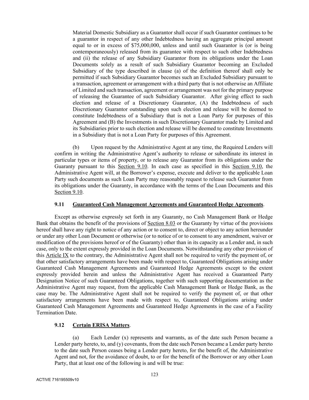 123 ACTIVE 716195509v10 Material Domestic Subsidiary as a Guarantor shall occur if such Guarantor continues to be a guarantor in respect of any other Indebtedness having an aggregate principal amount equal to or in excess of $75,000,000, unless and until such Guarantor is (or is being contemporaneously) released from its guarantee with respect to such other Indebtedness and (ii) the release of any Subsidiary Guarantor from its obligations under the Loan Documents solely as a result of such Subsidiary Guarantor becoming an Excluded Subsidiary of the type described in clause (a) of the definition thereof shall only be permitted if such Subsidiary Guarantor becomes such an Excluded Subsidiary pursuant to a transaction, agreement or arrangement with a third party that is not otherwise an Affiliate of Limited and such transaction, agreement or arrangement was not for the primary purpose of releasing the Guarantee of such Subsidiary Guarantor. After giving effect to such election and release of a Discretionary Guarantor, (A) the Indebtedness of such Discretionary Guarantor outstanding upon such election and release will be deemed to constitute Indebtedness of a Subsidiary that is not a Loan Party for purposes of this Agreement and (B) the Investments in such Discretionary Guarantor made by Limited and its Subsidiaries prior to such election and release will be deemed to constitute Investments in a Subsidiary that is not a Loan Party for purposes of this Agreement. (b) Upon request by the Administrative Agent at any time, the Required Lenders will confirm in writing the Administrative Agent’s authority to release or subordinate its interest in particular types or items of property, or to release any Guarantor from its obligations under the Guaranty pursuant to this Section 9.10. In each case as specified in this Section 9.10, the Administrative Agent will, at the Borrower’s expense, execute and deliver to the applicable Loan Party such documents as such Loan Party may reasonably request to release such Guarantor from its obligations under the Guaranty, in accordance with the terms of the Loan Documents and this Section 9.10. 9.11 Guaranteed Cash Management Agreements and Guaranteed Hedge Agreements. Except as otherwise expressly set forth in any Guaranty, no Cash Management Bank or Hedge Bank that obtains the benefit of the provisions of Section 8.03 or the Guaranty by virtue of the provisions hereof shall have any right to notice of any action or to consent to, direct or object to any action hereunder or under any other Loan Document or otherwise (or to notice of or to consent to any amendment, waiver or modification of the provisions hereof or of the Guaranty) other than in its capacity as a Lender and, in such case, only to the extent expressly provided in the Loan Documents. Notwithstanding any other provision of this Article IX to the contrary, the Administrative Agent shall not be required to verify the payment of, or that other satisfactory arrangements have been made with respect to, Guaranteed Obligations arising under Guaranteed Cash Management Agreements and Guaranteed Hedge Agreements except to the extent expressly provided herein and unless the Administrative Agent has received a Guaranteed Party Designation Notice of such Guaranteed Obligations, together with such supporting documentation as the Administrative Agent may request, from the applicable Cash Management Bank or Hedge Bank, as the case may be. The Administrative Agent shall not be required to verify the payment of, or that other satisfactory arrangements have been made with respect to, Guaranteed Obligations arising under Guaranteed Cash Management Agreements and Guaranteed Hedge Agreements in the case of a Facility Termination Date. 9.12 Certain ERISA Matters. (a) Each Lender (x) represents and warrants, as of the date such Person became a Lender party hereto, to, and (y) covenants, from the date such Person became a Lender party hereto to the date such Person ceases being a Lender party hereto, for the benefit of, the Administrative Agent and not, for the avoidance of doubt, to or for the benefit of the Borrower or any other Loan Party, that at least one of the following is and will be true: