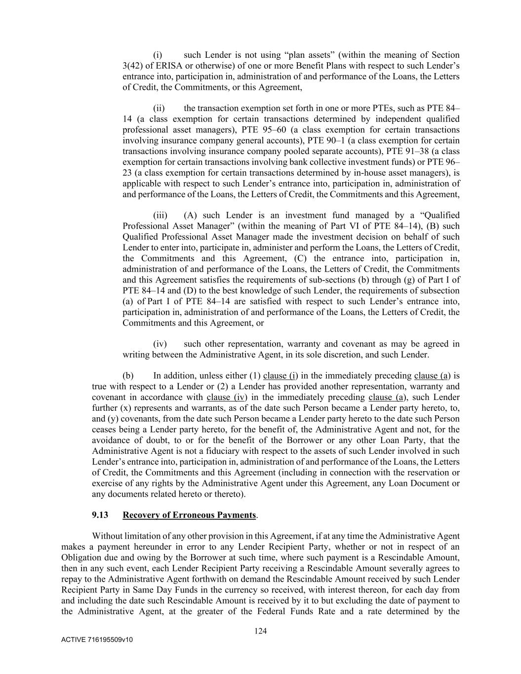 124 ACTIVE 716195509v10 (i) such Lender is not using “plan assets” (within the meaning of Section 3(42) of ERISA or otherwise) of one or more Benefit Plans with respect to such Lender’s entrance into, participation in, administration of and performance of the Loans, the Letters of Credit, the Commitments, or this Agreement, (ii) the transaction exemption set forth in one or more PTEs, such as PTE 84– 14 (a class exemption for certain transactions determined by independent qualified professional asset managers), PTE 95–60 (a class exemption for certain transactions involving insurance company general accounts), PTE 90–1 (a class exemption for certain transactions involving insurance company pooled separate accounts), PTE 91–38 (a class exemption for certain transactions involving bank collective investment funds) or PTE 96– 23 (a class exemption for certain transactions determined by in-house asset managers), is applicable with respect to such Lender’s entrance into, participation in, administration of and performance of the Loans, the Letters of Credit, the Commitments and this Agreement, (iii) (A) such Lender is an investment fund managed by a “Qualified Professional Asset Manager” (within the meaning of Part VI of PTE 84–14), (B) such Qualified Professional Asset Manager made the investment decision on behalf of such Lender to enter into, participate in, administer and perform the Loans, the Letters of Credit, the Commitments and this Agreement, (C) the entrance into, participation in, administration of and performance of the Loans, the Letters of Credit, the Commitments and this Agreement satisfies the requirements of sub-sections (b) through (g) of Part I of PTE 84–14 and (D) to the best knowledge of such Lender, the requirements of subsection (a) of Part I of PTE 84–14 are satisfied with respect to such Lender’s entrance into, participation in, administration of and performance of the Loans, the Letters of Credit, the Commitments and this Agreement, or (iv) such other representation, warranty and covenant as may be agreed in writing between the Administrative Agent, in its sole discretion, and such Lender. (b) In addition, unless either (1) clause (i) in the immediately preceding clause (a) is true with respect to a Lender or (2) a Lender has provided another representation, warranty and covenant in accordance with clause (iv) in the immediately preceding clause (a), such Lender further (x) represents and warrants, as of the date such Person became a Lender party hereto, to, and (y) covenants, from the date such Person became a Lender party hereto to the date such Person ceases being a Lender party hereto, for the benefit of, the Administrative Agent and not, for the avoidance of doubt, to or for the benefit of the Borrower or any other Loan Party, that the Administrative Agent is not a fiduciary with respect to the assets of such Lender involved in such Lender’s entrance into, participation in, administration of and performance of the Loans, the Letters of Credit, the Commitments and this Agreement (including in connection with the reservation or exercise of any rights by the Administrative Agent under this Agreement, any Loan Document or any documents related hereto or thereto). 9.13 Recovery of Erroneous Payments. Without limitation of any other provision in this Agreement, if at any time the Administrative Agent makes a payment hereunder in error to any Lender Recipient Party, whether or not in respect of an Obligation due and owing by the Borrower at such time, where such payment is a Rescindable Amount, then in any such event, each Lender Recipient Party receiving a Rescindable Amount severally agrees to repay to the Administrative Agent forthwith on demand the Rescindable Amount received by such Lender Recipient Party in Same Day Funds in the currency so received, with interest thereon, for each day from and including the date such Rescindable Amount is received by it to but excluding the date of payment to the Administrative Agent, at the greater of the Federal Funds Rate and a rate determined by the